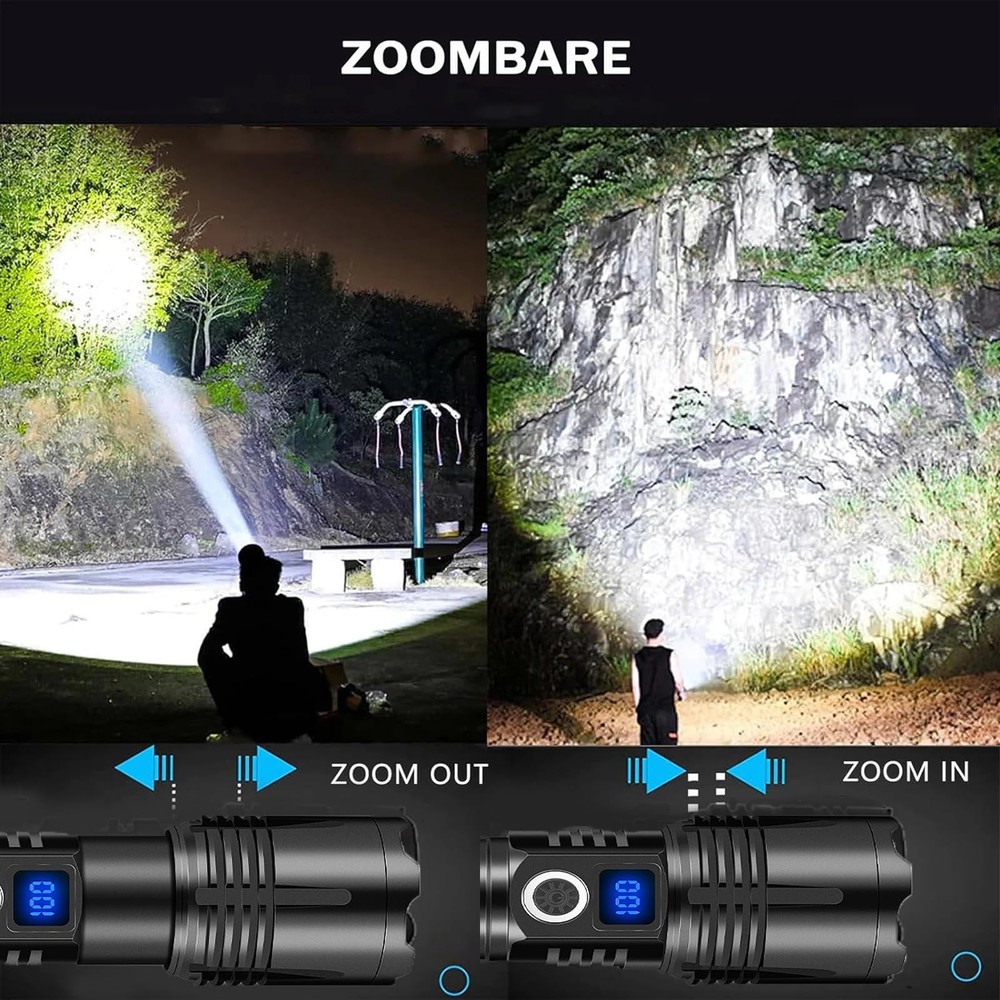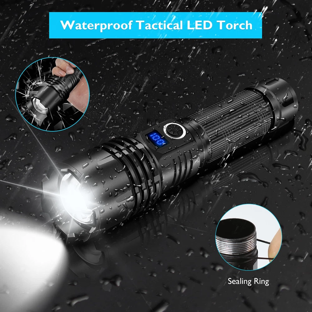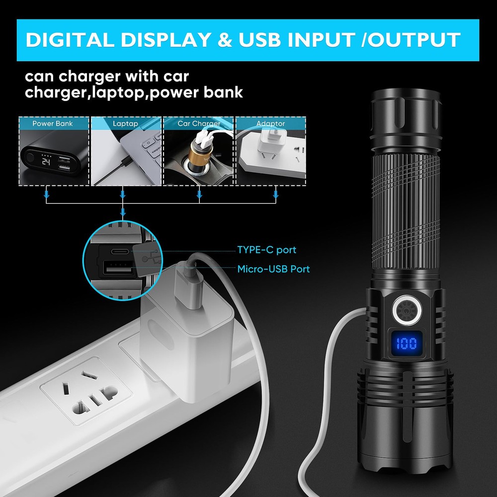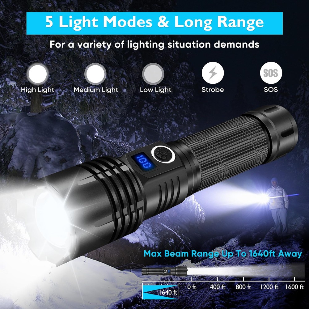 🔦【SUPER BRIGHT FLASHLIGHT 990000 HIGH LUMENS】High Powerful flashlights equipped with an upgraded powerful XHP70 chip. LED rechargeable flashlights can emit 990000 lumens super high brightness, which is 10 times brighter than regular flashlights. rechargeable LED Flashlight can easily illuminate an 1500-square-foot area like or focus on objects 1640 feet away. The super brightness of this torch can easily illuminate an entire room or backyard. 🔦【5 LIGHT MODE & ZOOMABLE】LUXJUMPER XHP70 Handheld Torch for waterproof has 5 lighting modes: High/Medium/Low/Strobe/SOS. If you have lost or your car has a breakdown at night and you need to SOS mode send out an emergency signal. In any mode, it can be turned off by long-pressing for 3 seconds. In addition, Flashlights for emergencies can stretch the head of the to change the focal length and beam size, free to choose remote observation and wide range of lighting. 🔦【Long-Lasting Working Hours】This led flashlight rechargeable flash light has been completely improved to shorten the charging time and extend the service life, Torches high lumens rechargeable which can provide up to 3-8 hours of powerful, charging time is up to 4 hours. (Note: Before using the rechargeable batteries, pleaseremove the transparent plastic protective film on the surfaceof the batteries. ) 🔦【USB RECHARGEABLE & LCD DIGITAL DISPLAY】Super bright led flashlight built in TYPE-C USB input/outpot interface, can be charged by car charger, computer, power bank, or any USB outlet etc. Battery powered flashlight features led digital display, you can clearly and visibly read the current remaining battery power at any time. Charging flashlight the indicator will blink continuously. Takes about 3-5 hours to fully charge, convenient and quick. 🔦【WATERPROOF & PRACTICALLY INDESTRUCTIBLE】Bright flashlight rechargeable is made of aviation grade aluminum alloy, impact resistance, wear-resistant and drop-resistant. able to withstand a 10 feet accident drop and even ran over by a truck, it still works! Built-in high tenacity seal rubber waterproof ring, which can be used normally in any bad weather, such as rain or snow. 🔦【WIDELY APPLICATION】Bright flashlightst fits in your hand, backpack, survival bag, or car glove compartment. Convenient to operate by one hand with lanyards and portable to carry to anywhere. Ideal for dog walking, hunting, boating, power outages, patrolling, camping, hiking, emergency. Perfect gift for a father, husband,wife,or college student for any occasion.