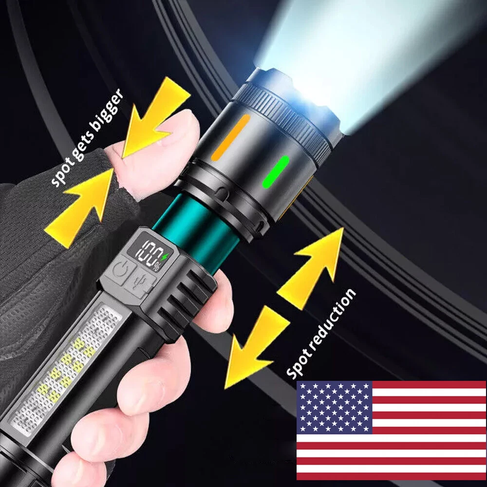 ☀ 【 99,000,000 Lumens Super Bright Rechargeable Flashlight 】 Equipped with upgraded efficient laser Chip LED chips, rechargeable flashlight emits a stable and super bright lighting. Since the light penetration is stronger than other same-level lamp beads', its beam can pass through dust and fog well, especially suitable for foggy and rainy days with low visibility. It can focus on objects up to 3700 feet away. ☀ 【 5 Light Modes & Zoomable Focus 】 There are 5 modes of rechargeable flashlight: High / Low / Strobe for the main light, and White / Red&Blue Strobe for the COB side light. Equipped with zoomable head, the small rechargeable flashlight high lumens can emit a powerful focused lighting and an extensive extended lighting by adjusting the light head. ☀ 【 USB C F ast Charging & Power Indicator 】 Built-in a rechargeable lithium-ion battery and equipped with more energy-efficient chips, the rechargeable flashlight battery powered working time is up to 7 hours with the low mode. The USB C fast charging input achieves 30% reduction in charging time. It can be charged by power bank, USB plug, etc, with the USB C charging cable. You can clearly see the remaining power at the digital power indicator. ☀ 【 IPX6 Waterproof 】 This flashlight head adopts the high grade black aluminium alloy, and the frame adopts the ABS plastic. The waterproof grade of this flash light reaches IPX6 Waterproof. This rechargeable flashlight is non-slip, shockproof, waterproof, rainproof, dustproof. It can work well in severe outdoor weather conditions, such as rain and snow. It is an ideal outdoor handheld flashlight for working, hiking, camping, repairing, hunting, and Sogidon fishing. ☀ 【 Easy to Carr y 】 Led flashlight is equipped with lanyard, which can be hung on your wrist. As its compact design, you carry this small handheld flashlight in your pocket or the car glove compartment.