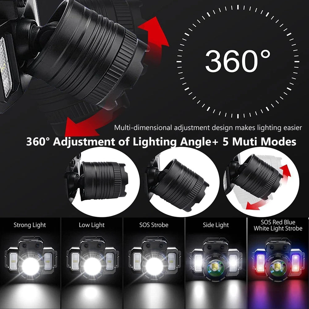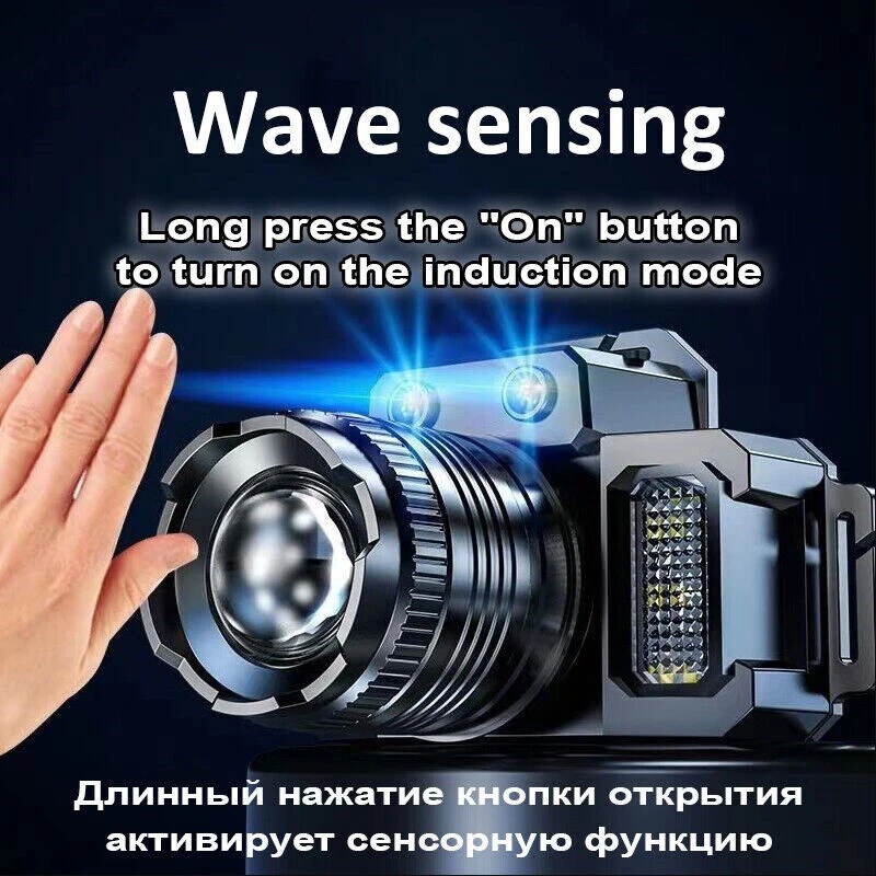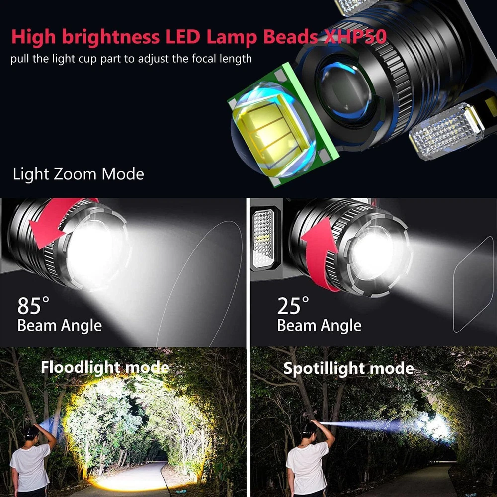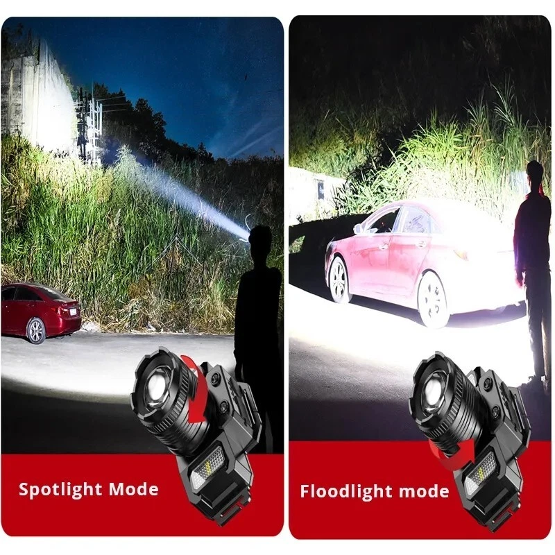 Description 1. Material: high-quality aluminum alloy + ABS material, light and durable, anti-fall and wear-resistant 2. Lamp bead: This product adopts XPG high-brightness main core, and is equipped with red and blue LED warning lights to maintain a stable high-brightness field of vision at all times 3. Zoom: Rotary zoom design, taking into account both distance and near, mechanical telescopic zoom, with optical lens, bursting with powerful light 4. Charging method: Smart USB dual interface, compatible with various charging methods, and can also charge mobile phones in an emergency, convenient and practical 5. Intelligent induction: Long press the switch to turn on the induction mode, intelligent sensitive sensor, wave induction, free your hands 6. Lighting mode: 5 gears (main light: strong light/weak light/strobe, side light: white light/side light red and blue fast flash), you can adjust the angle and light source according to your own needs, easy to operate and easy to use 7. Suitable for: camping, mountaineering, cycling, night fishing, night running, dog walking, maintenance and exploration, etc. Package includes 1*Headlamp 1*Headband 1*Charging Cable Product Highlights Name: USB rechargeable zoomable bright LED headlight Colour: Black Light color: white light + red and blue light Lamp bead: XPG+ red and blue LED Charging method: USB charging Battery: built-in rechargeable lithium battery Battery capacity: 2000mAh Charging time: 3-5h Battery life: 4-25h (100% strong light 10-12h, 50% medium light 18-20h, 25% low light 35-40h) Lighting mode: 5 gears (main light: strong light/weak light/strobe, side light: white light/side light flashes red and blue quickly) Whether to zoom: zoom Power display: 4*LED display lights (25%-50%-75%-100%) Sensing distance: within 15cm Maximum range: 300m Waterproof grade: IPX4 Product size: 45*92mm Product net weight: 128g