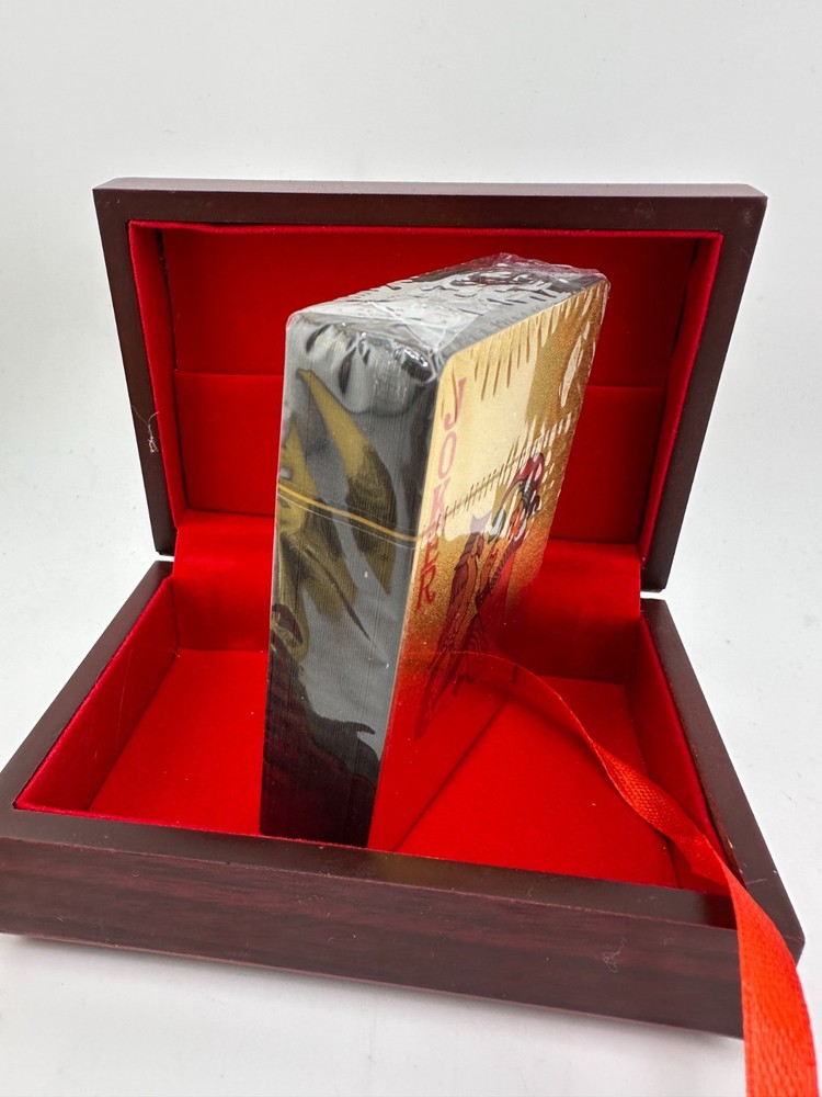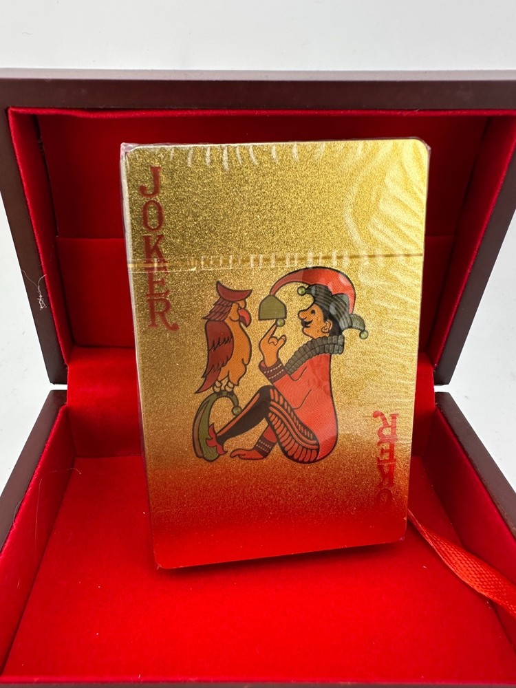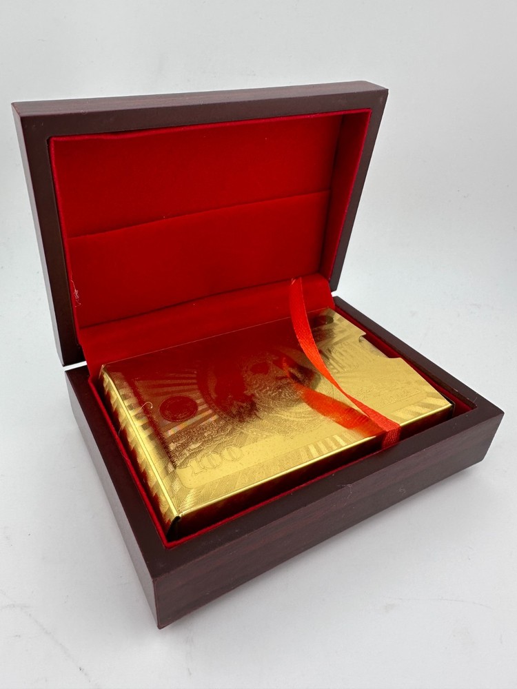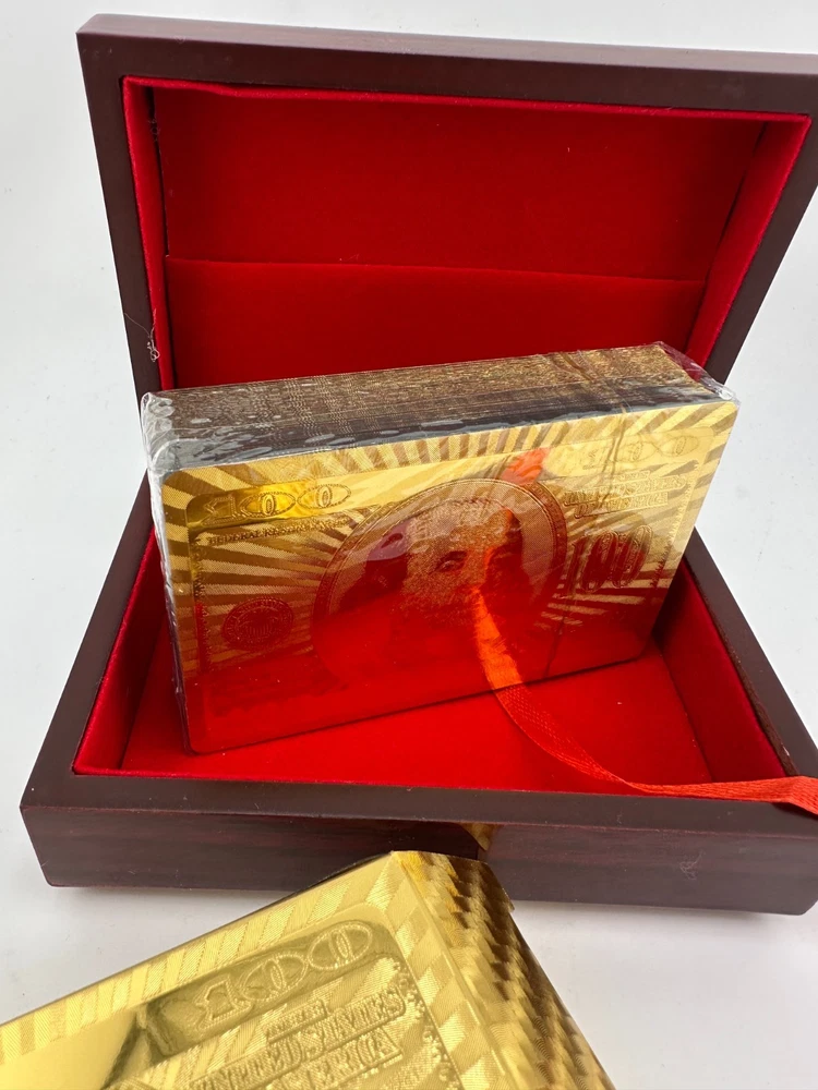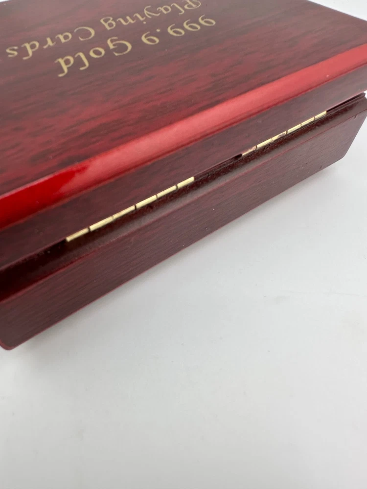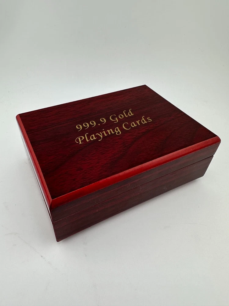 Luxury 999.9 gold-plated playing cards presented in an elegant wooden display box with red velvet interior. This premium novelty deck features full gold-foil cards with classic designs, perfect for collectors, poker enthusiasts, or as a unique luxury gift. Cards remain sealed and unused. A striking display piece for game rooms, offices, or man caves.
