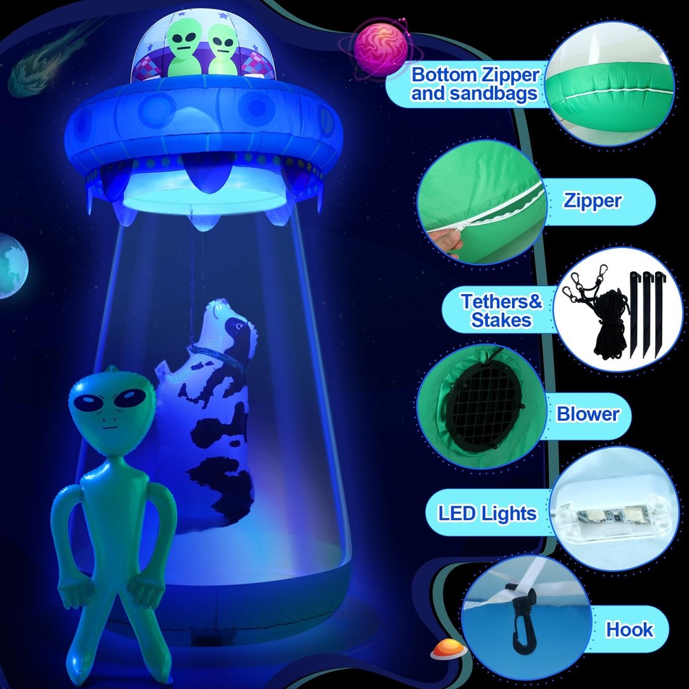 Features: It comes equipped with built in LED lights, making it visible in the dark and enhancing the eerie presence of the UFO alien, it's an ideal showpiece to amuse your Halloween party guests. Crafted from quality, reliable, and weather resistant material, this Halloween decoration is designed to withstand outdoor conditions, ensuring you can use it year after year. Specifications: Main material: waterproof material Main color: blue and green Size: UFO: about 9 ft/ 2.7 m high Alien: about 36 inches tall Cow: about 30 inches long Package includes: 1 x Inflatable UFO with LEDs 1 x Alien decor 1 x Inflatable cow decor Notes: Manual measurement, please allow slight errors on size. The color may exist a slight difference due to different screen displays. 9 Feet Tall UFO Inflatable Yard Decor Sets: three piece outdoor inflatable UFO set, including inflatable UFO, alien and cow; The oversized UFO is very decorative in the yard; The UFO has a zipper; People can enter when the zipper is opened, and then close the zipper, as if a person is trapped by the UFO; It's like it's been sucked away Extra Large Size: the entire UFO is about 9 ft/ 2.7 m high, and can accommodate an adult when unzipped; The alien is 36 inches tall, and the cow is 30 inches long; It is very eye catching and is a novelty and cool Halloween decoration Halloween UFO Yard Fun: there is a hook in the middle of the product; After the cow is inflated, attach it to the hook and enter the inflatable UFO kit; It is as if the UFO sucked you and the cow away together; 36 inch green alien inflatable toy, take you to experience the excitement of extraterrestrial life! Light up the lights at night to provide optimal appeal to neighbors and guests; Ideal for space themed Halloween parties and yard decorations Bright Built in LED Light: the entire UFO inflatable model exudes blue purple light, full of mystery and horror; The outdoor inflatable UFO is made of high strength waterproof material, which is sturdy, reliable, and reusable; In addition, this outdoor inflatable equipment is equipped with a powerful blower, which can inflate the decorations with continuous air flow; Since the inflatable product is large, it takes a while to wait for the blowing time after plugging in the power supply Ideal Decoration for Halloween: ideal for Halloween outdoor patio garden decorations, trick or treat event decorations, Halloween night events, Halloween haunted house decorations, Halloween space themed decorations, Halloween costume party decorations, stage props, birthday parties, and more