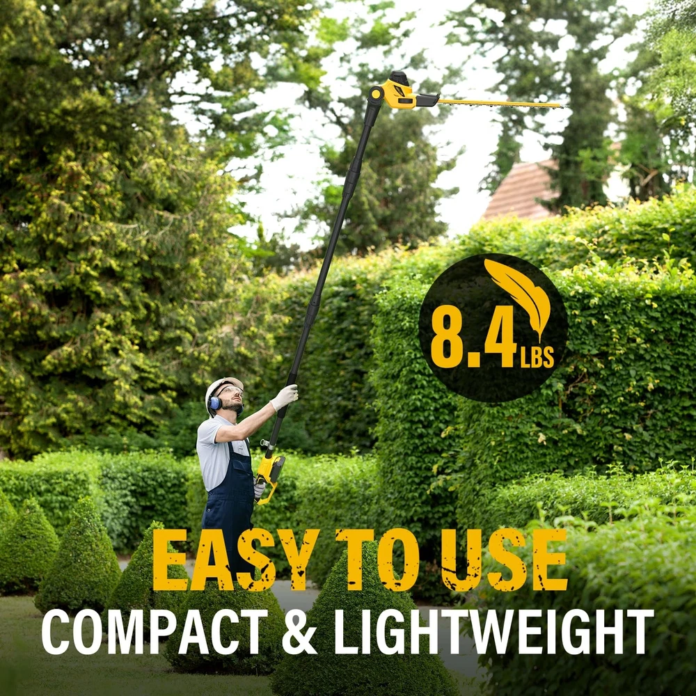 Pole Hedge Trimmer Cordless, 9-Feet Reach Power Hedge Trimmer with Extension Pole, MAX 20-inch, Multi-Angle, 2* 2.0Ah Battery and Fast Charger Included 【ROTATABLE HEAD】This pole hedge trimmer with adjustable blade hedge trimmer has a 7-position swivel head for 0°-135° multi-angle trimming. Ergonomically designed handle for a comfortable grip. It helps you to operate the hedge trimmer flexibly in any direction. 【EXTENSION POLE】The cordless pole hedge trimmer has an extension bar with a telescoping handle. It extends up to 10.4 ft (The height of the machine plus the user)for a total reach of max 16 feet for hard-to-reach trimming jobs. 【POWERFUL CUTTING PERFORMANCE】18-inch steel double-action blade cuts cleanly for optimal performance and durability. Also features a 3/4-inch cutting capacity for easy trimming of most bushes and hedges. And this electric hedge trimmer comes with a protective blade cover for safe storage. 【Safety lock】The hedge trimmer with extension bar has a double switch design that requires pressing simultaneously to turn on. The function of this cordless edge trimmer with a battery prevents accidental start-up and protects your family from danger. 【INCLUDES & WARRANTY】Pole Hedge Trimmer Cordless, 9-Feet Reach Power Hedge Trimmer with Extension Pole, MAX 20-inch, Multi-Angle, 2* 2.0Ah Battery and Fast Charger Included