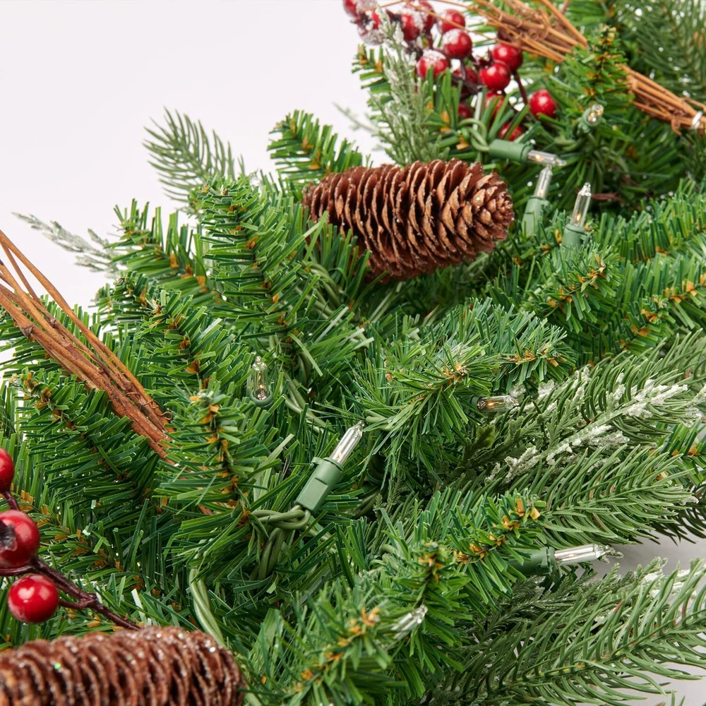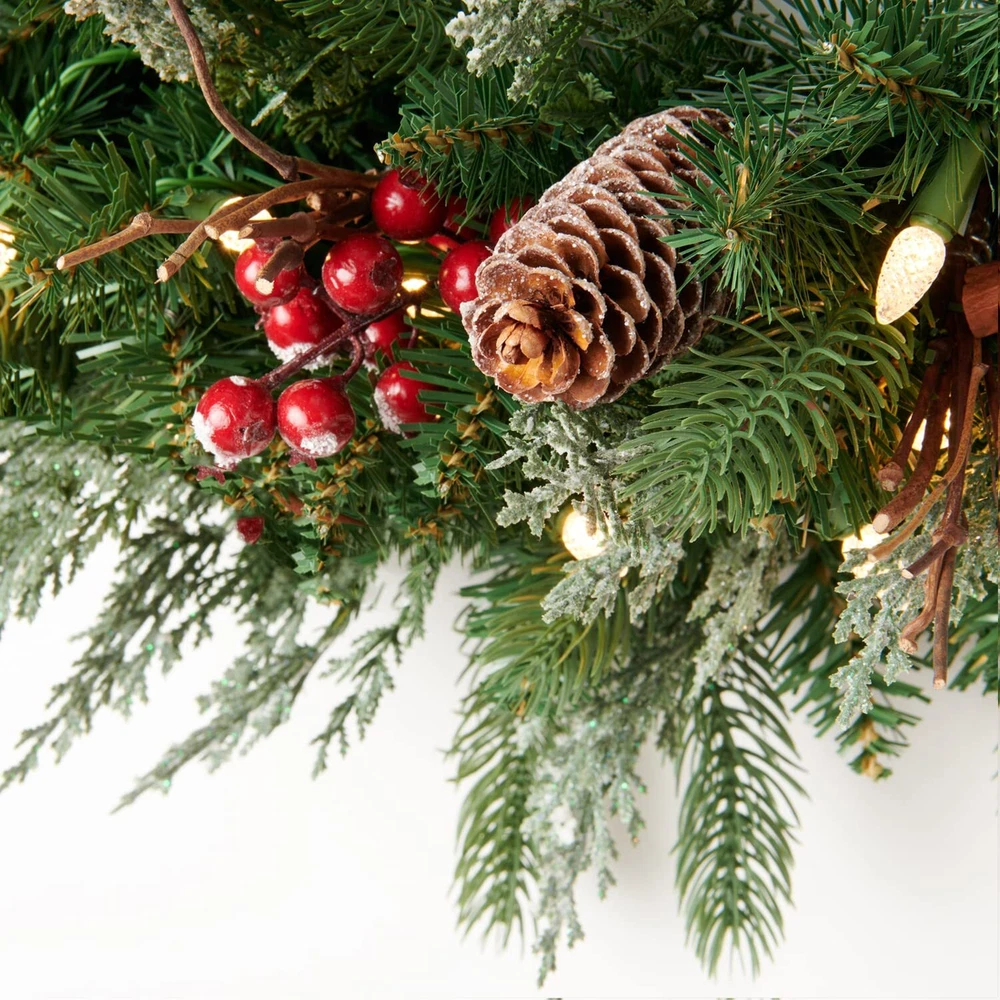 Christmas Garland 50 Lights NATURAL LIFELIKE: Measures 9 FT.Length 12 inch Diameter with 320 branch tips, Look lifelike artificial Christmas garland. BEAUTIFUL DECOR: Trimmed with Flocked Red Berries, Colorful Glitter Pine Cone,made of flame-retardant PVC Fire resistant and non-allergenic. BUILT-IN LIGHTING: Pre-strung with 50 warm white lights, The light stay on even when a bulb goes out,easy quick set up lights(Includes spare bulbs and fuses). INDOOR OR OUTDOOR: Create a festival environment suitable for Christmas, shopping malls, party, bars, window, entryway, garden, mantle, hotel lobby, office, wedding or any indoor or outdoor decor. SATISFACTION - Customer satisfaction and service quality are the basic criteria of . If anything ever goes wrong with your item, please feel free to contact us.