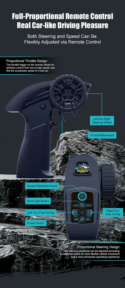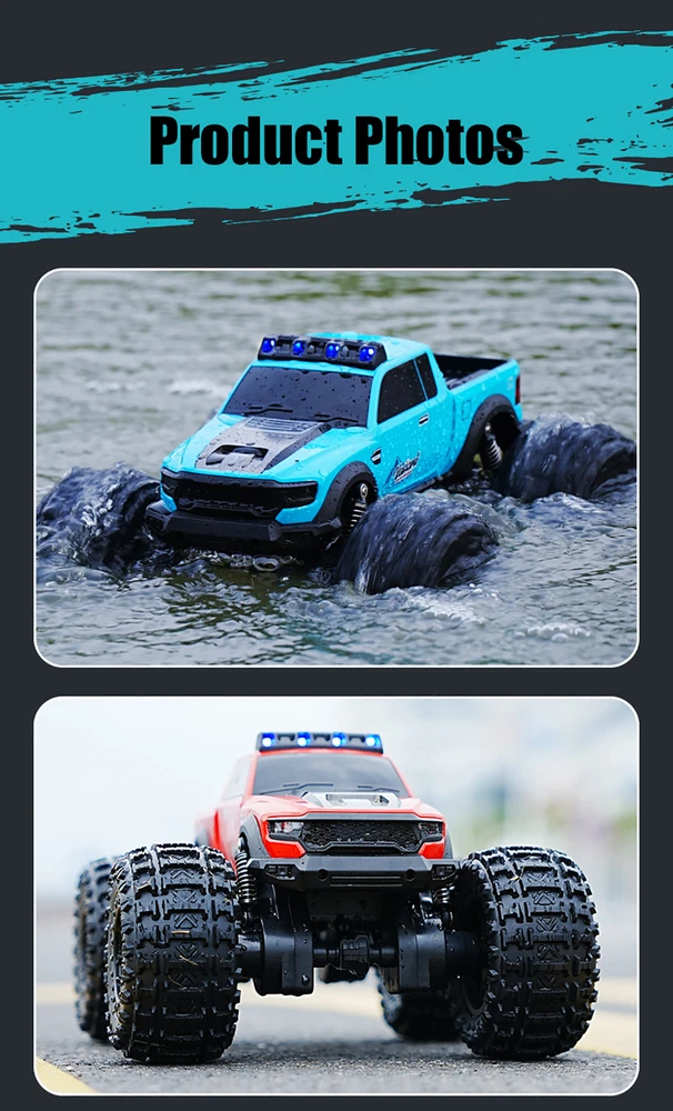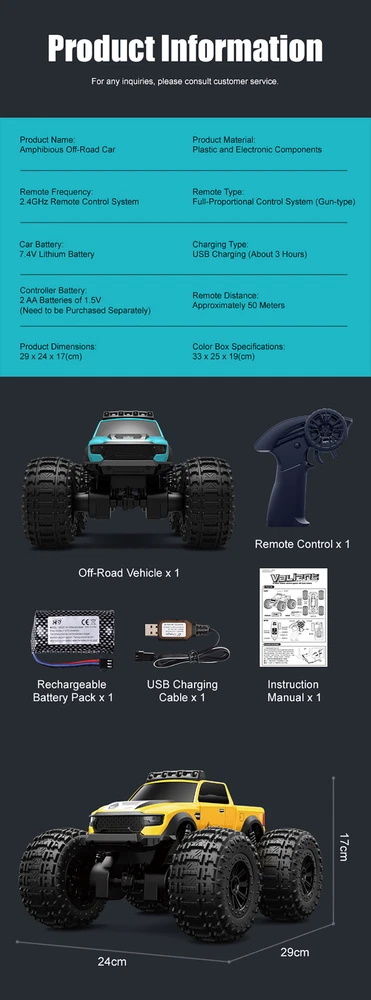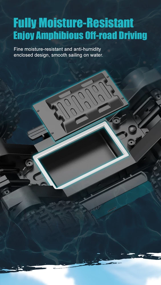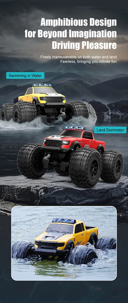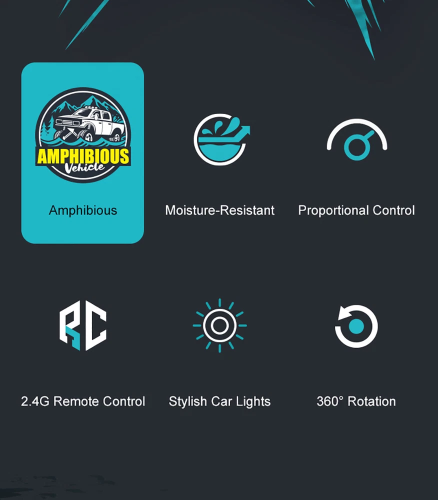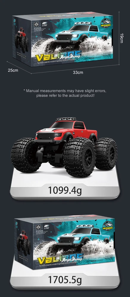 9IMOD C8816 1:16 RC Amphibious Car 2.4G 50M 360° Rotation Full-Proportional Remote Control Off-road Vehicle For Water Grassland Dirt Road Mountain Road Features: 1. Freely maneuverable on both water and land Fearless, bringing you infinite fun. 2. Fine moisture-resistant and anti-humidity enclosed design, smooth sailing on water. 3. Large off-road tires with stronger gripEffortlessly cross all rerrains, enhancing driving experience. 4. 4WD drive, full of power Easily climb inclined steep slopes. 5. 360° Stunt Rotation,The off-road car can move in different directions for unlimited fun. 6. High-brightness Headlights:Controllable light modes Smooth night driving, stylish and awesome. 7. Adopts 2.4G remote controltechnology with stronger anti-interferenceability for simpler operation. 8. The throttle trigger on the remote allows forarbitrary control from low to high speed. 9. Tough and Stylish, Multiple Colors Available. Description: C8816 1:16 full scale RC amphibious off-road vehicle, using 2.4G remote control system, able to complete 360 ° stunt rotation, High-brightness Headlights design, so that you can also drive at night smoothly, stylish and cool, high-density waterproof, bringing you two different experiences on the water and land! Specifications: Product Name: Amphibious Off-Road Car Product Material:Plastic and Electronic Components Color:Blue/Red/Yellow Frequency: 2.4GHz Car Battery: 7.4V 1200mAh Lithium Battery Controller Battery: 2*AA Batteries of 1.5V(Need to be Purchased Separately) Remote Type: Full-Proportional Control System Charging Type:USB Charging (About 3 Hours) Usage time: about 20min Max speed: 10-12km/h RC Distance: About 50M Product Dimensions: 29 x24 x 17(cm) Color Box Specifications: 33 x 25 x 19(cm) Package contents: 1* Car 1*Remote Control 1*7.4V 1200mAh Lithium Battery 1*USB Charging Cable 1*Instruction Manual Note: Only the above package content, other products are not included. 1.Due to the difference between different monitors,the picture may not reflect the actual color of the item. We guarantee the style is the same as shown in the pictures. 2.Due to the manual measurement and different measurement methods, please allow 1-3mm deviation.Thanks! Before purchase: 1.All the goods are ready stock, we will arrange the shipment at once if we receive the order. 2.Please read the item description, if you have any question, do not hesitate to contact us. 3.No warranty,if you receive a defect item,please contact us at once with item picture. 4.Use the vouchers for more saving. After purchase: 1.If you are satisfied,please express your use feeling. 2.Please contact us before you are going to give us bad review. We are helpful and will solve the problems. If you receive a defect item,please contact us at once with item picture or video.