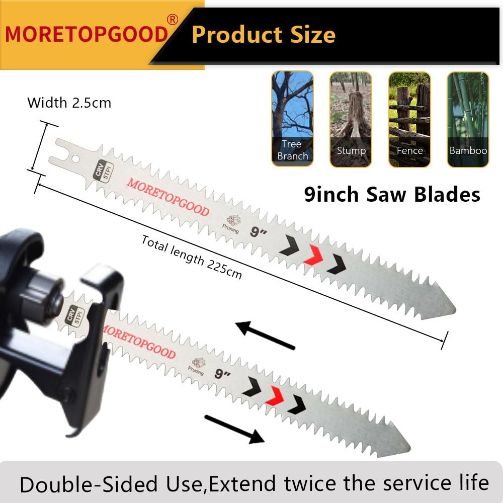 Store New Arrivals Add to Favorite View Feedback Contact Double-Sided Reciprocating Saw Blades,9 Inch Wood Pruning Japanese Teeth Saw Blades, Double Edge Replaceable Blades for Cutting Tree Branches/Limb/Roots/Shrubs/Brush/Stumps (5TPI/5 Pack) Description Item Thickness 0.04 Inches Compatible Material Carbon Steel Country of Origin China Package Dimensions 10.35 x 1.18 x 0.55 inches; 7.37 ounces Size 9 Inch Brand Unbranded Shipping Fast shipping USA 【Premium Materials】: The 9-inch reciprocating saw blades are made of high-quality HCS heat-treated carbon steel with high-temperature quenching process, featuring anti-deformation ability and wear resistance.Specifically designed for garden wood pruning, it effectively reduces tooth chipping and blade blunting during operation, enhancing cutting efficiency. 【Upgraded Double-Sided Teeth Design】:This 5TPI Japanese saw blade has an innovative double-sided sharpened edge design for “one blade, two uses”.When one side wears out, there is no need to disassemble or replace it. Immediately switch to the other side to restart efficient cutting.Compared with single-sided saw blades, the service life is doubled, and there is no need to change the direction of the saw blade, enabling rapid back-and-forth operation and reducing downtime. 【Multiple Cutting】: MORETOPGOOD reciprocating saw blade is suitable for cutting various types of wood such as wet wood, dry wood, logs, firewood, orchards, fences, branches, shrubs, tree stumps and bamboo. It is a great household tool for garden pruning and woodworking processing. Carving wood is also a unique use. 【Package Includes】: 5 pieces 9 inch replaceable blades. Universal shank fits all brands of reciprocating saw tools such as Dewalt, Bosch, Milwaukee Sawzall saw, SKIL, Makita, Black & Decker, Ryobi, Porter Cable, Hitachi, Flex, Hilti and more. 【Customer Service Friendly】: Professional customer service will reply within 12 hours. It is a practical gift that solves various situations in daily use, brings convenience and improves our quality of life. Product Description The video showcases the product in use. The video guides you through product setup. The video compares multiple products. The video shows the product being unpacked. Double-Sided Teeth Reciprocating Saw Blades Merchant Video RETURNS We offer a 30-Day Return Policy on items which you are not completely satisfied with. You have the option for a full-refund or an exchange of the item. No returns are available on items shipped outside of the USA. PAYMENT We accept PayPal. CONTACT US This page content is yet to come Please ad us to your favorite seller and visit again later Thank You CUSTOMER SATISFACTION We try our very best to make sure every customer is completely satisfied. If there's a problem, message us! We're happy to help.