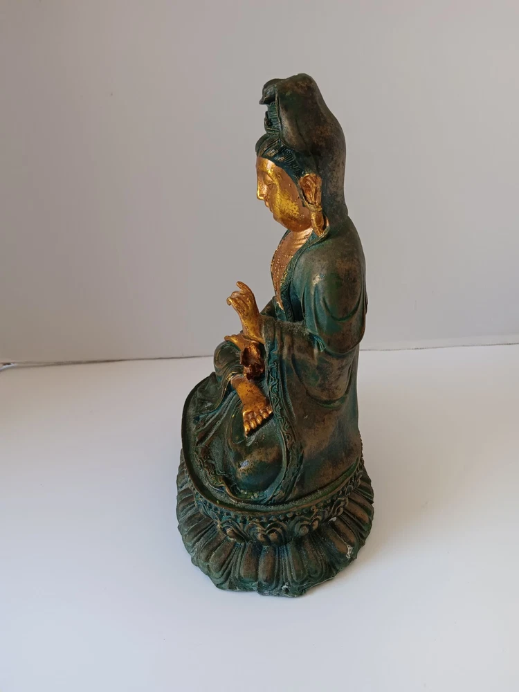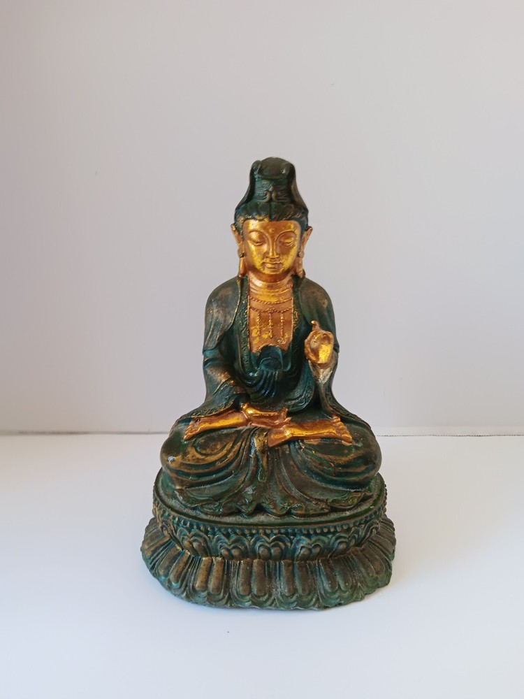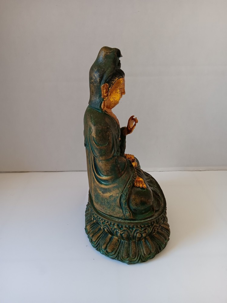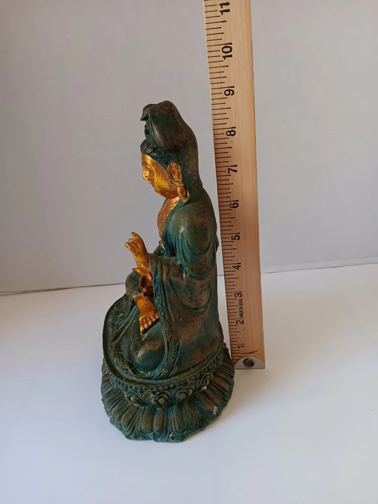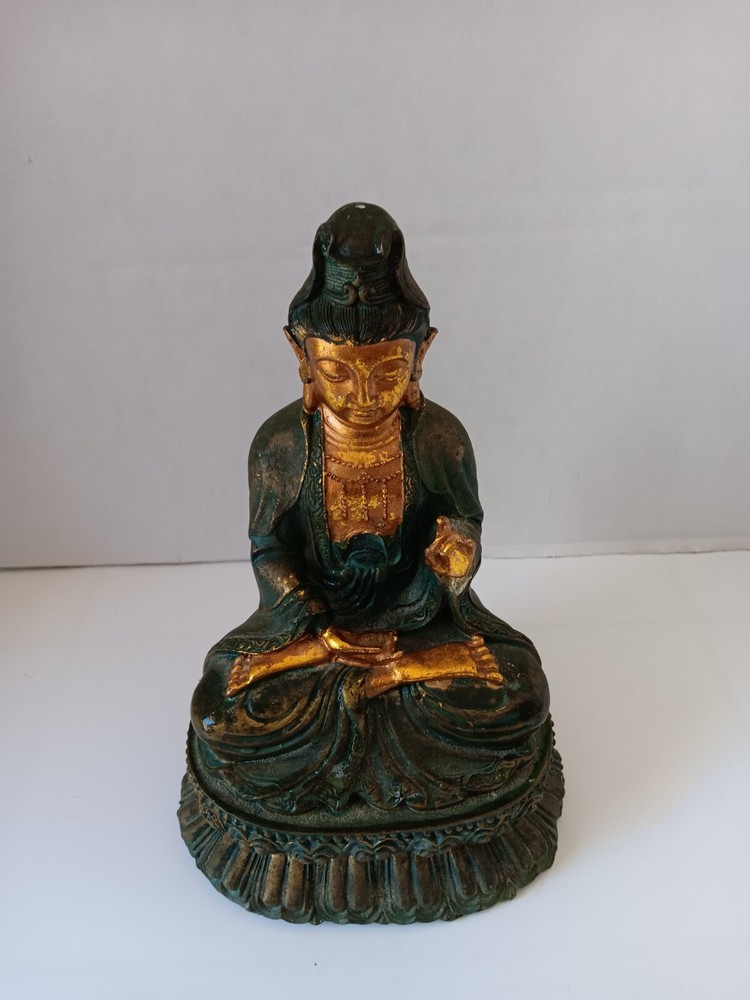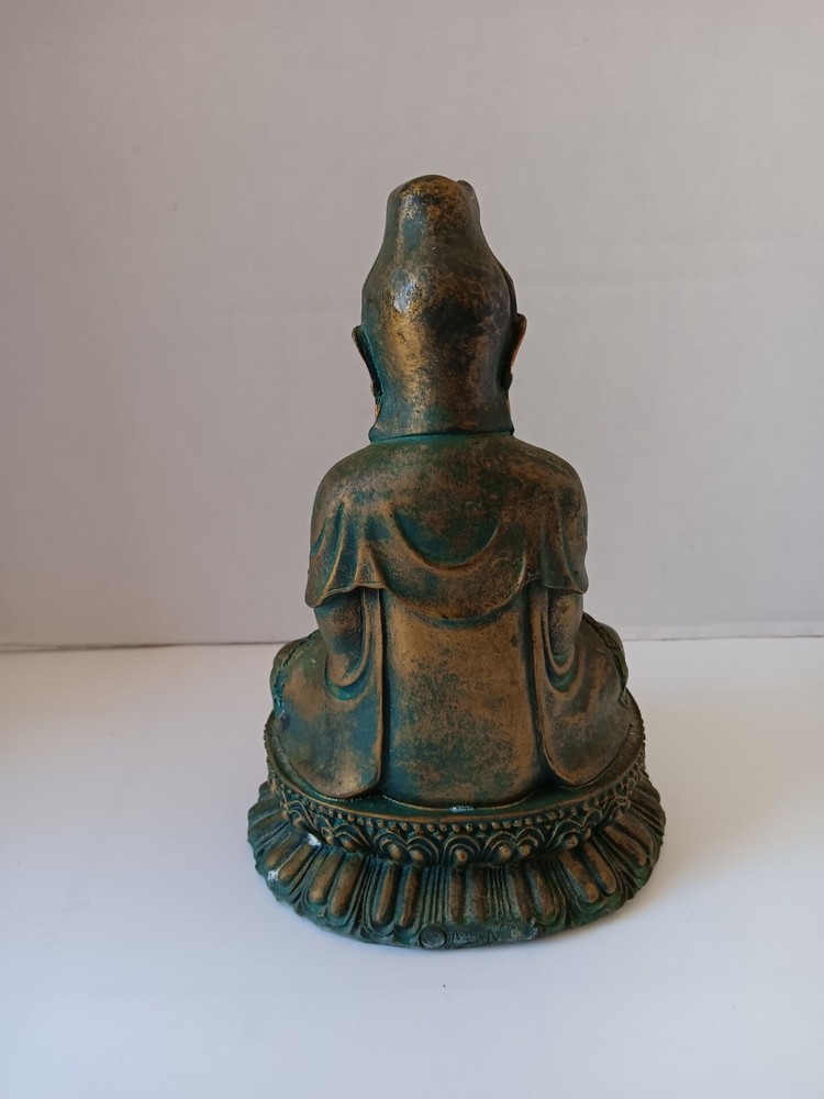 9" Buddha Figurine statue. Free standing. No chips or cracks. Resin. Great shape. Greenish colored with gold color accents.