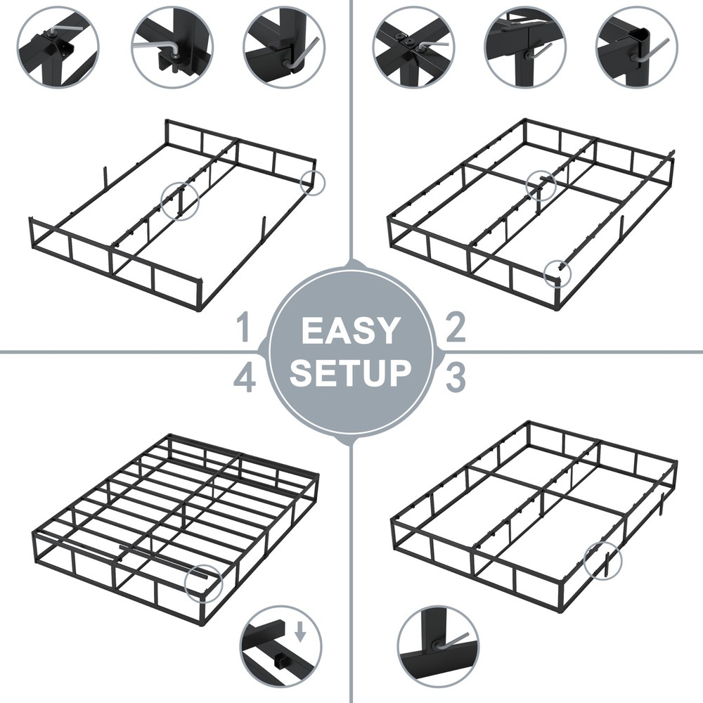Reinforced Stability: Box springs engineered with reinforced joints and heavy- duty metal slats for maximum stability and strong support for your mattress. 3000lbs max weight capacity 9 Inch Low Profile Box Spring: Box springs 9 inch elevates your mattress, adding a touch of comfort, can fit for queen bed frame, innerspring mattresses, memory foam mattresses, latex mattresses,etc Quiet and Noise Free: Mattress foundation adopts a silent design, sturdy and reliable heavy duty structure achieves maximum durability, prevents squeaking noise and ensures a peaceful sleeping environment Easy Assembly: Box spring for queen bed, metal box spring queen with clear instructions and all the necessary tools included, just simply the straightforward instructions for quick assembly Box Spring Cover Included: Box spring and cover set, and fabric cover with elastic band, shrink and resistant, keep mattress from slipping, easy to removable for spot cleaning