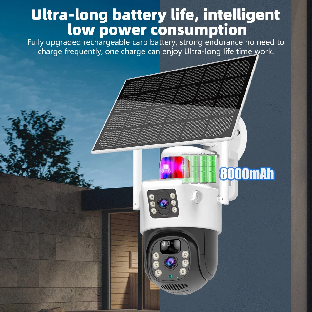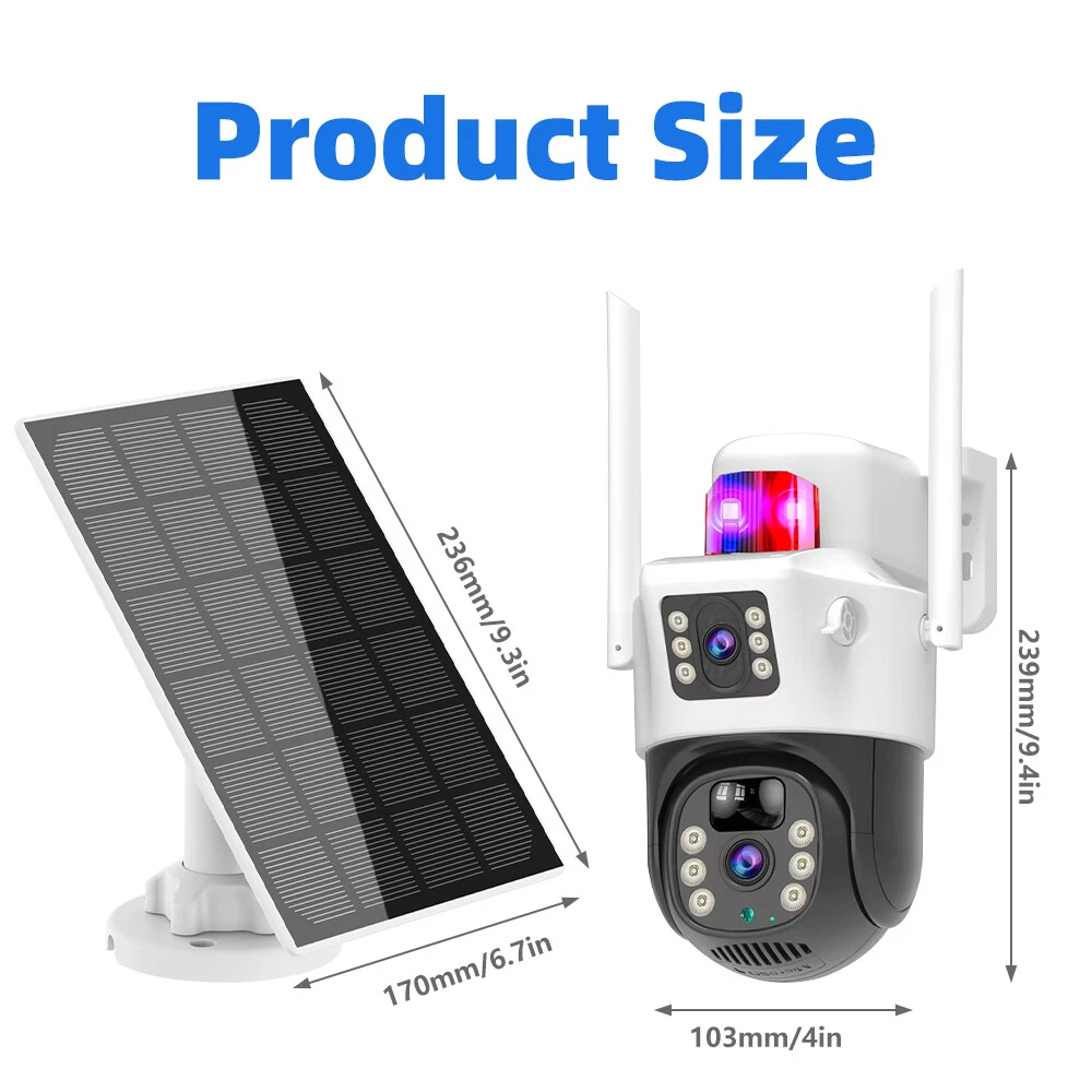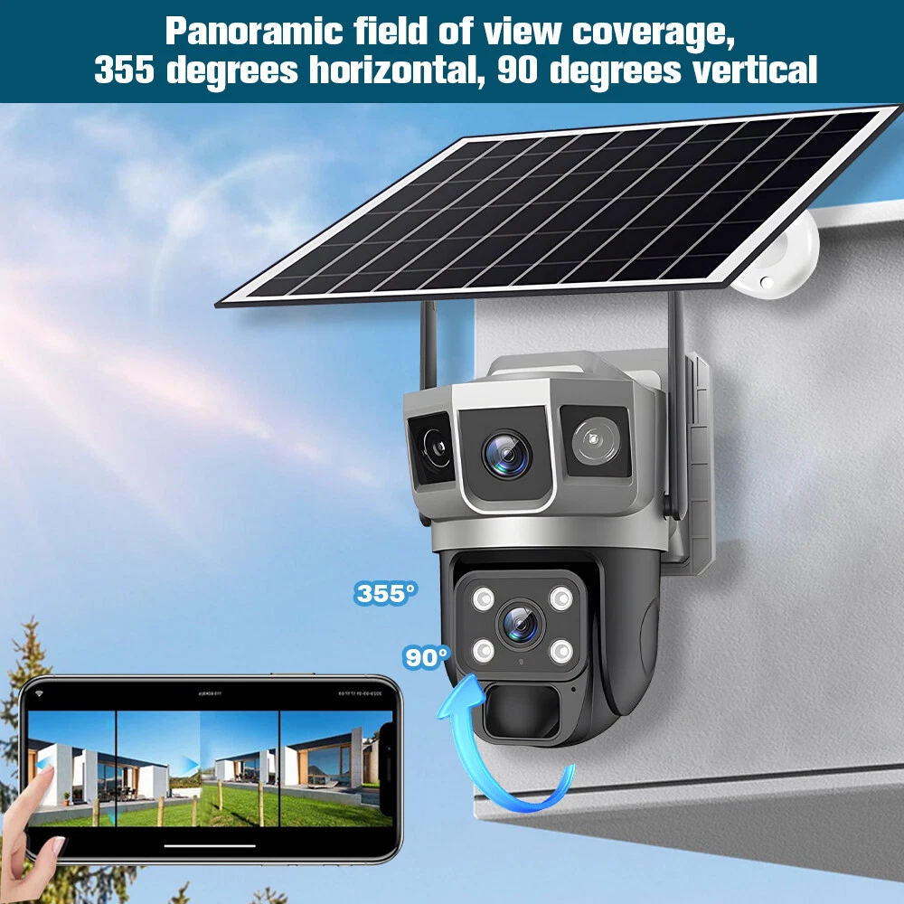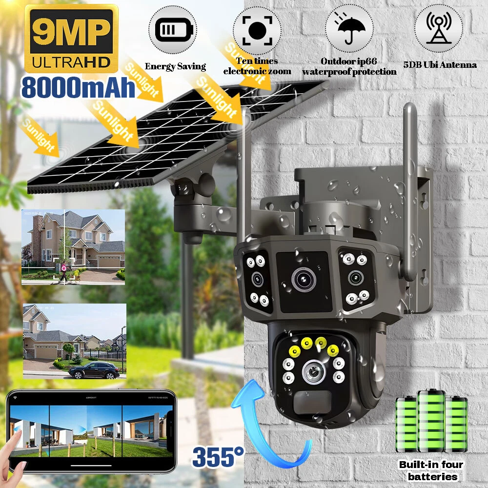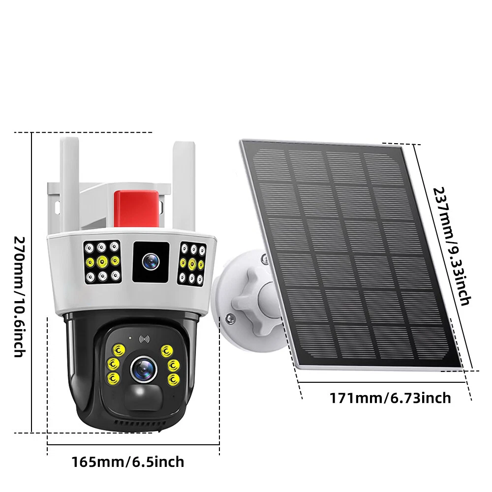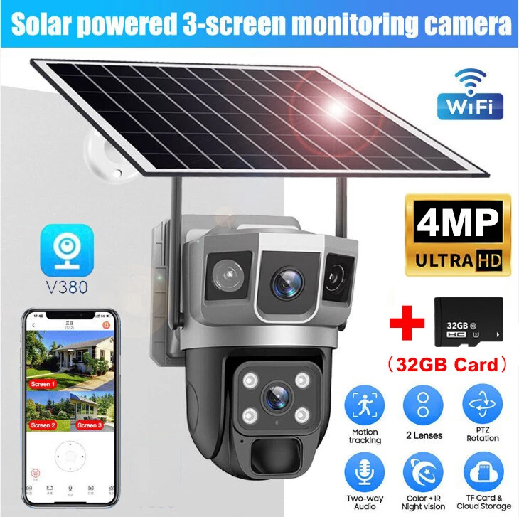 9MP Solar Camera Description Features: dual lens, dual screen viewing Option: WIFI=WIFI 2.4Hz connection 1:3MP+3MP+3MP million pixel outdoor solar monitoring camera 2. High definition: Shoot with a high-definition camera to ensure the effectiveness and quality of video shooting, allowing you to have real-time control of the outdoor environment. 3. Night vision system: optional infrared or color night vision, which can monitor the doorstep in real-time at any time to ensure safe and smooth enjoyment. 4. APP V380 Pro remote operation: functions such as remote operation, photography, and video recording, allowing remote control of the outdoor environment. 5. Voice intercom: With voice intercom function, you can transmit sound to the external environment through your phone or replay the sound to visitors through the device. 6. Custom alerts: supports custom alerts, and when you receive an alert, it will immediately send an alert message to your phone 7. Multi user remote access: Share the same camera with your family, leave everything you protect, and pay more attention to your home. 8. SD card: The maximum size of the SD card is 128GB, 9. Waterproof/Dustproof Ip66: The camera casing is made of high-quality ABS plastic and has waterproof, sunscreen, and dustproof functions. It is suitable for any environment. 10. Motion detection and automatic tracking: After locking the target, the camera will automatically adjust the pan tilt rotation. Track moving objects, cars, pets, humans, and push alert notifications to your smart Phone. Package List: 1x 9MP solar camera 1x bracket 1x solar panel with extension cable 1x installation package 1x instruction manual 1x 32GB card 4MP Solar Camera 3 screens shows on the V380 app Three images can be viewed simultaneously, and each image can be individually enlarged. Real time alerts Set up monitoring areas in advance, conduct actual testing, and promptly push alarm information. IP66 Waterproof / Dustproof The camera is equipped with IP66 case , which is waterproof, sun-proof and dust-proof. It is suitable for any environment. Clear Two Way Audio Built-in microphone and speaker / Customized new speakers with loud volume; You could talk to anyone nears the camera ( Warn someone to leave your house ). Advanced H.265 Video Compression H.265 (HEVC) doubles the coding efficiency compared with its predecessor H.264. H.265 video saves around 50% of the bit rate at the same quality of coding.H.265 only need less bandwidth,faster loading speed,more smooth video,Lower bite rate,higher image quality! 10X Zoom(Both 3 cameras support zoom) you can switch from 1X to 10X zoom instantly;it can fast zoom in or zoom out without lag;watch far and near images Simultaneously through Picture in Picture,don't miss a detail. Full Color Night Vision: When the white LED light is on, the camera will display colorful vision at night, and there are three night modes for you to choose. Ai Human Detect Alert Quickly finds human targets and immediately sends a notification to your phone, letting you see what happens anywhere. It only detects the human shape and will not trigger falsely for objects such as cars and trees. PTZ Control by APP Rotates 355° Horizontally and 90° Vertically.You can control it in the APP directly whenever you want and wherever you are. 6MP Solar Camera Specification: ● Resolution: 4MP; ● iode: 12 x IR white light; ● Night vision: 30m; ● Head: 355° horizontal rotation, 90° vertical rotation; ● PIR infrared sensor: 10m (32ft) 100 degree detection range; ● Battery standby: up to 365 days; ● IP66 outdoor battery camera; ● Cloud storage: supported; requires in-app subscription and payment; ● Local Storage: Supports micro SD card up to 128G (not built-in); ● Multi-viewing: supports sharing to up to 4 families; ● Input/Output: Built-in microphone and speaker; ● Apps: Eseecloud app; please search for this keyword on Google Play or iOS APP Store to download the app; ● Operating time: 10 months based on 3 events triggered per day; ● Operating temperature: -20°C to 60°C (4°F to 140°F); Battery powered+solar charging panel: Built in recyclable rechargeable battery, ultra-low power system optimization, energy saving, durable endurance, and long term standby with solar charging panel Picture in Picture , 8X Digital Zoom you can switch from 1X to 8X digital zoom instantly; it can fast zoom in or zoom out without lag; watch far and near images Simultaneously through Picture in Picture,don't miss a detail. Two-Way Audio Build in speaker and microphone,support clear two way voice speaking AI Auto Tracking When someone passes through the alarm area, the camera will detect the person's movement. And track people. PIR Human Detection When it is found that someone breaks into the monitoring area, the camera will immediately take a picture and push alarm to App. Full Color Night Vision When the white LED light is on, the camera will display colorful vision at night, and there are three night modes for you to choose. PTZ Control by APP Rotates 355° Horizontally and 90° Vertically.You can control it in the APP directly whenever you want and wherever you are. IP66 Waterproof / Dustproof The camera is equipped with IP66 case , which is waterproof, sun-proof and dust-proof. It is suitable for any environment.