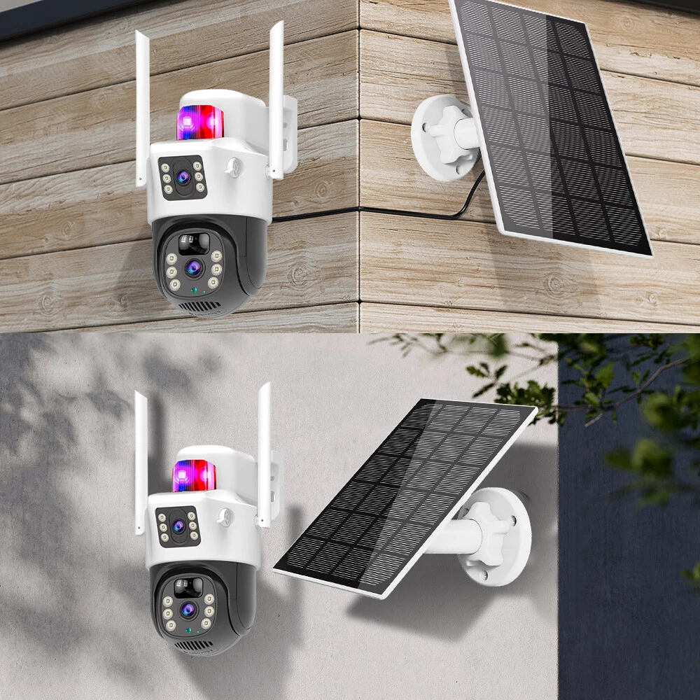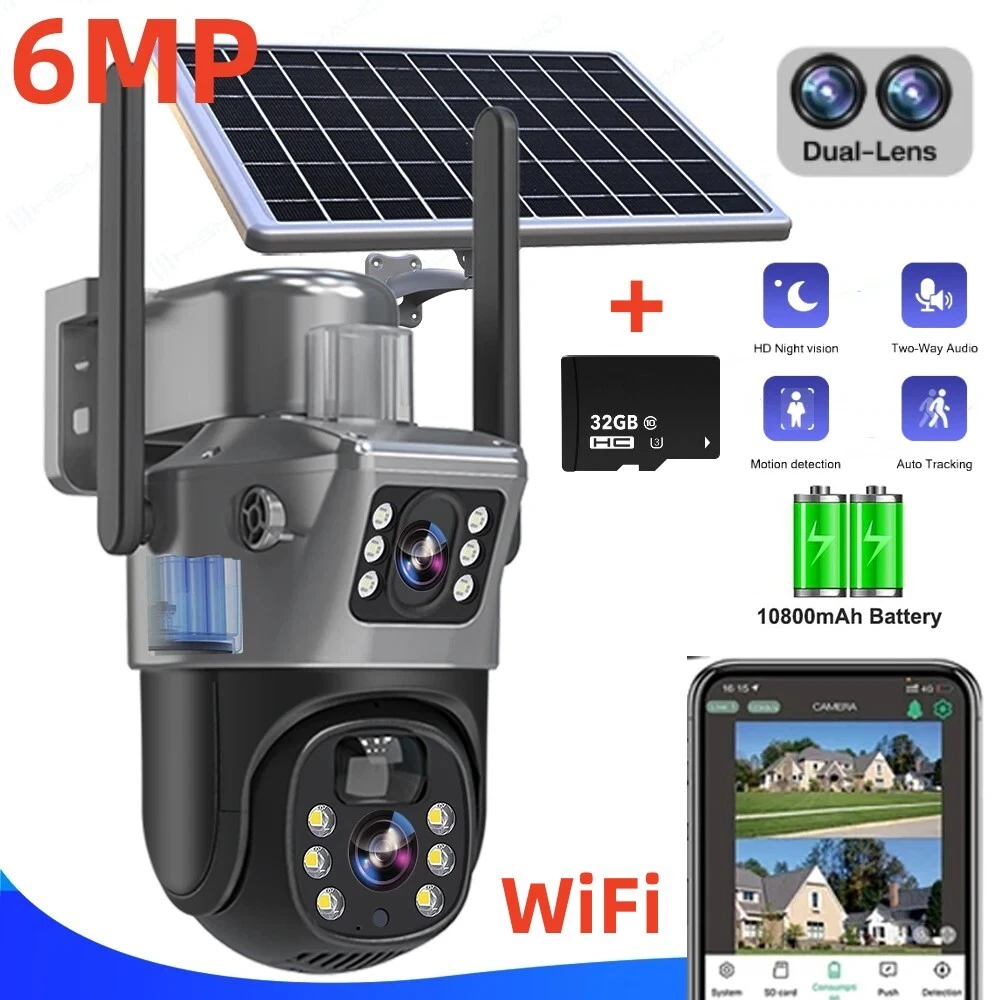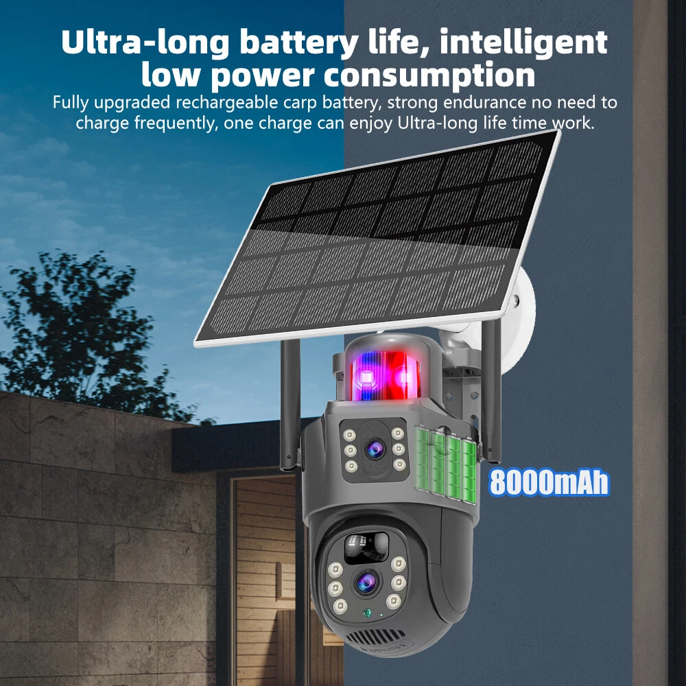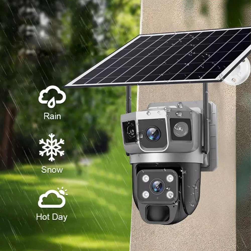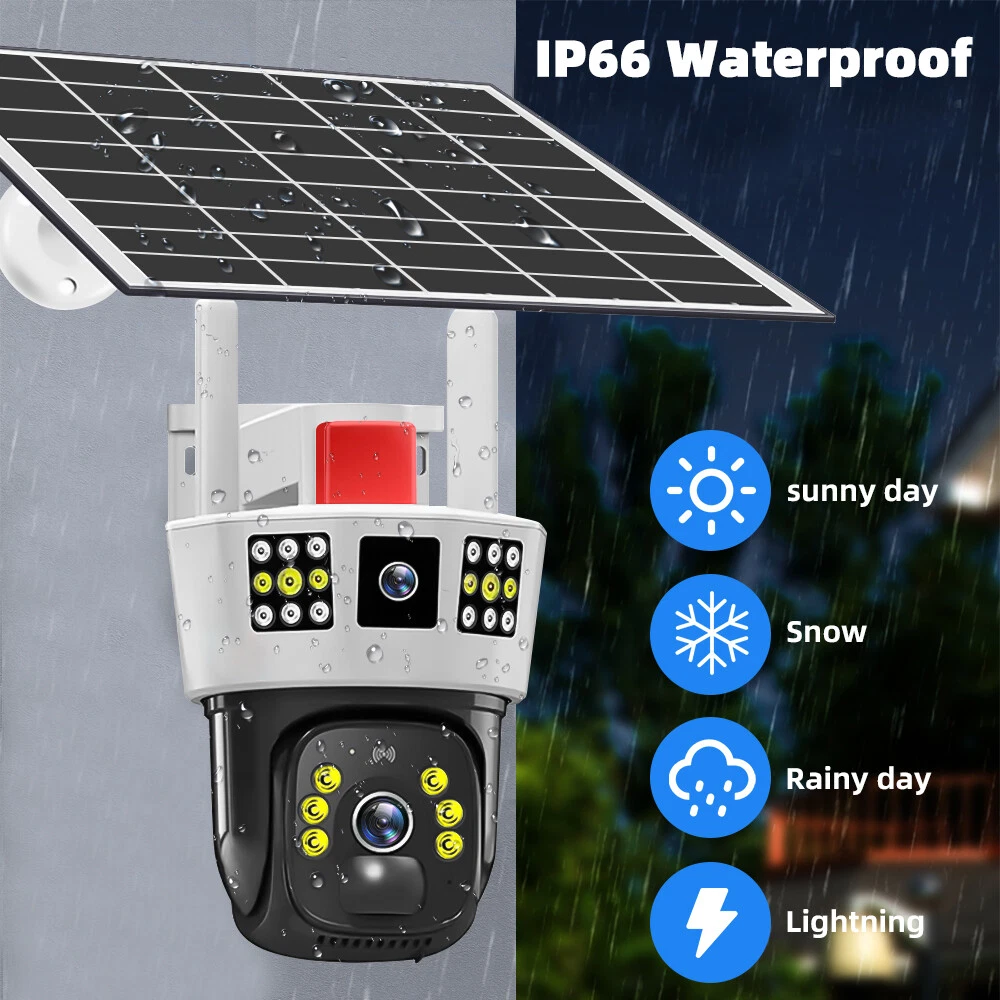 9MP Solar Camera Description Features: dual lens, dual screen viewing Option: WIFI=WIFI 2.4Hz connection 1:3MP+3MP+3MP million pixel outdoor solar monitoring camera 2. High definition: Shoot with a high-definition camera to ensure the effectiveness and quality of video shooting, allowing you to have real-time control of the outdoor environment. 3. Night vision system: optional infrared or color night vision, which can monitor the doorstep in real-time at any time to ensure safe and smooth enjoyment. 4. APP V380 Pro remote operation: functions such as remote operation, photography, and video recording, allowing remote control of the outdoor environment. 5. Voice intercom: With voice intercom function, you can transmit sound to the external environment through your phone or replay the sound to visitors through the device. 6. Custom alerts: supports custom alerts, and when you receive an alert, it will immediately send an alert message to your phone 7. Multi user remote access: Share the same camera with your family, leave everything you protect, and pay more attention to your home. 8. SD card: The maximum size of the SD card is 128GB, 9. Waterproof/Dustproof Ip66: The camera casing is made of high-quality ABS plastic and has waterproof, sunscreen, and dustproof functions. It is suitable for any environment. 10. Motion detection and automatic tracking: After locking the target, the camera will automatically adjust the pan tilt rotation. Track moving objects, cars, pets, humans, and push alert notifications to your smart Phone. Package List: 1x 9MP solar camera 1x bracket 1x solar panel with extension cable 1x installation package 1x instruction manual 1x 32GB card 4MP Solar Camera 3 screens shows on the V380 app Three images can be viewed simultaneously, and each image can be individually enlarged. Real time alerts Set up monitoring areas in advance, conduct actual testing, and promptly push alarm information. IP66 Waterproof / Dustproof The camera is equipped with IP66 case , which is waterproof, sun-proof and dust-proof. It is suitable for any environment. Clear Two Way Audio Built-in microphone and speaker / Customized new speakers with loud volume; You could talk to anyone nears the camera ( Warn someone to leave your house ). Advanced H.265 Video Compression H.265 (HEVC) doubles the coding efficiency compared with its predecessor H.264. H.265 video saves around 50% of the bit rate at the same quality of coding.H.265 only need less bandwidth,faster loading speed,more smooth video,Lower bite rate,higher image quality! 10X Zoom(Both 3 cameras support zoom) you can switch from 1X to 10X zoom instantly;it can fast zoom in or zoom out without lag;watch far and near images Simultaneously through Picture in Picture,don't miss a detail. Full Color Night Vision: When the white LED light is on, the camera will display colorful vision at night, and there are three night modes for you to choose. Ai Human Detect Alert Quickly finds human targets and immediately sends a notification to your phone, letting you see what happens anywhere. It only detects the human shape and will not trigger falsely for objects such as cars and trees. PTZ Control by APP Rotates 355° Horizontally and 90° Vertically.You can control it in the APP directly whenever you want and wherever you are. 6MP Solar Camera Specification: ● Resolution: 4MP; ● iode: 12 x IR white light; ● Night vision: 30m; ● Head: 355° horizontal rotation, 90° vertical rotation; ● PIR infrared sensor: 10m (32ft) 100 degree detection range; ● Battery standby: up to 365 days; ● IP66 outdoor battery camera; ● Cloud storage: supported; requires in-app subscription and payment; ● Local Storage: Supports micro SD card up to 128G (not built-in); ● Multi-viewing: supports sharing to up to 4 families; ● Input/Output: Built-in microphone and speaker; ● Apps: Eseecloud app; please search for this keyword on Google Play or iOS APP Store to download the app; ● Operating time: 10 months based on 3 events triggered per day; ● Operating temperature: -20°C to 60°C (4°F to 140°F); Battery powered+solar charging panel: Built in recyclable rechargeable battery, ultra-low power system optimization, energy saving, durable endurance, and long term standby with solar charging panel Picture in Picture , 8X Digital Zoom you can switch from 1X to 8X digital zoom instantly; it can fast zoom in or zoom out without lag; watch far and near images Simultaneously through Picture in Picture,don't miss a detail. Two-Way Audio Build in speaker and microphone,support clear two way voice speaking AI Auto Tracking When someone passes through the alarm area, the camera will detect the person's movement. And track people. PIR Human Detection When it is found that someone breaks into the monitoring area, the camera will immediately take a picture and push alarm to App. Full Color Night Vision When the white LED light is on, the camera will display colorful vision at night, and there are three night modes for you to choose. PTZ Control by APP Rotates 355° Horizontally and 90° Vertically.You can control it in the APP directly whenever you want and wherever you are. IP66 Waterproof / Dustproof The camera is equipped with IP66 case , which is waterproof, sun-proof and dust-proof. It is suitable for any environment.