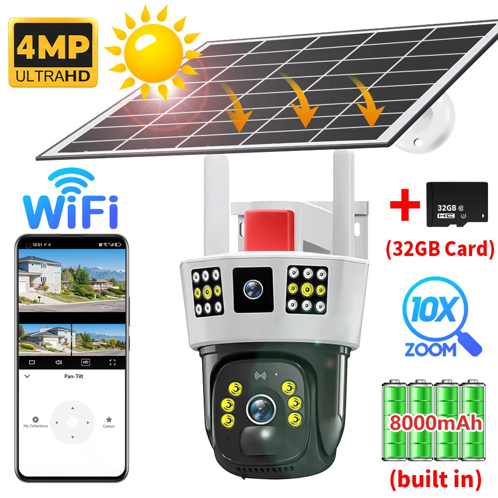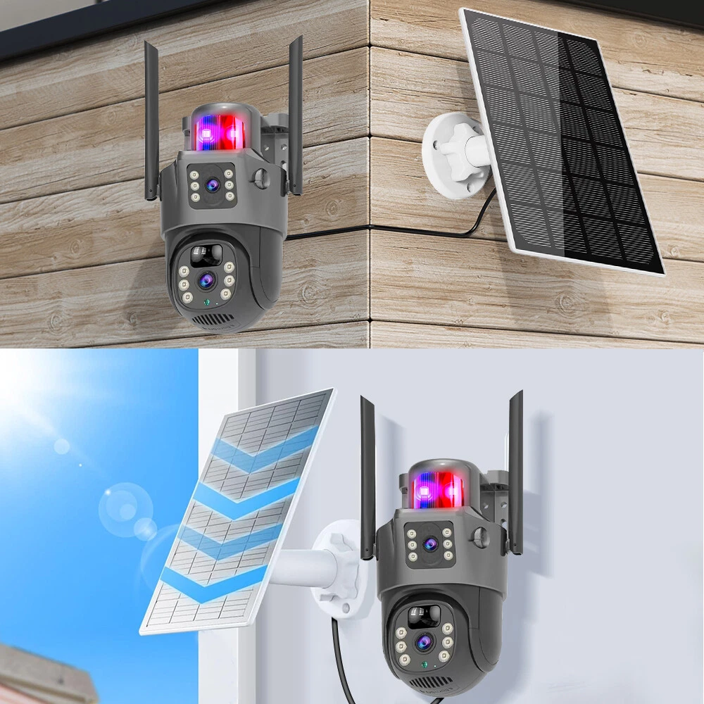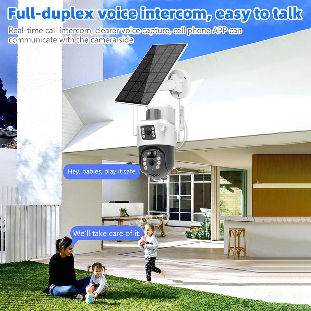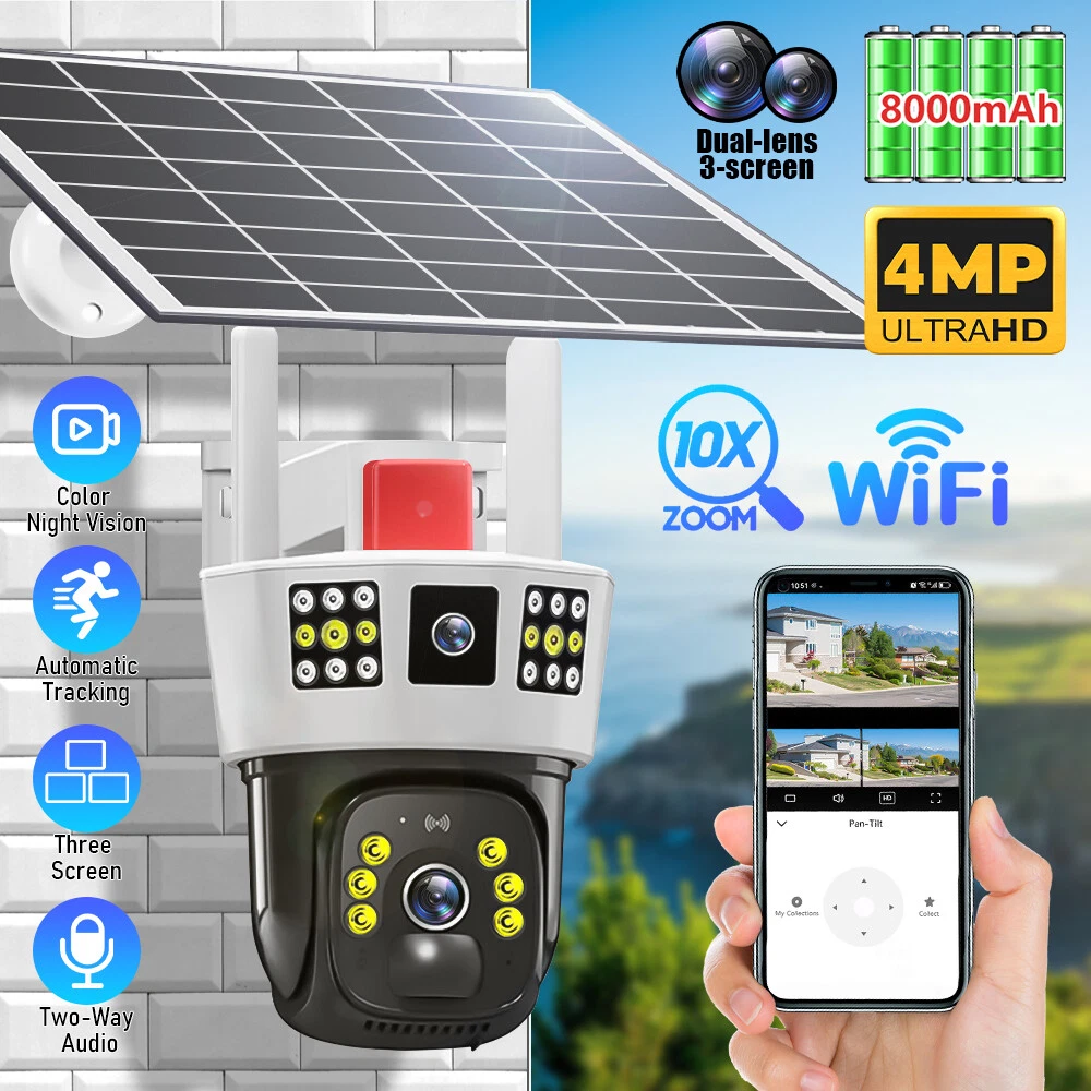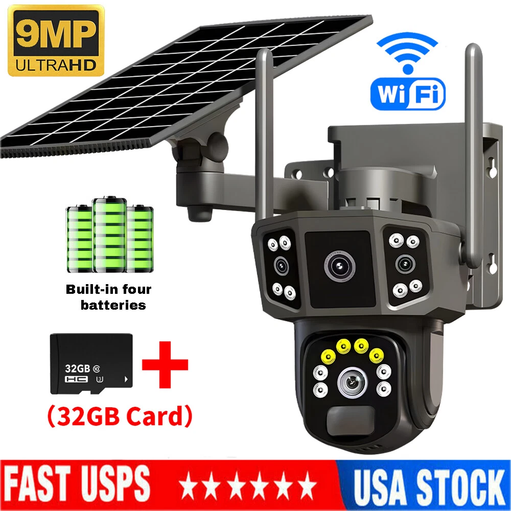 9MP Solar Camera Description Features: dual lens, dual screen viewing Option: WIFI=WIFI 2.4Hz connection 1:3MP+3MP+3MP million pixel outdoor solar monitoring camera 2. High definition: Shoot with a high-definition camera to ensure the effectiveness and quality of video shooting, allowing you to have real-time control of the outdoor environment. 3. Night vision system: optional infrared or color night vision, which can monitor the doorstep in real-time at any time to ensure safe and smooth enjoyment. 4. APP V380 Pro remote operation: functions such as remote operation, photography, and video recording, allowing remote control of the outdoor environment. 5. Voice intercom: With voice intercom function, you can transmit sound to the external environment through your phone or replay the sound to visitors through the device. 6. Custom alerts: supports custom alerts, and when you receive an alert, it will immediately send an alert message to your phone 7. Multi user remote access: Share the same camera with your family, leave everything you protect, and pay more attention to your home. 8. SD card: The maximum size of the SD card is 128GB, 9. Waterproof/Dustproof Ip66: The camera casing is made of high-quality ABS plastic and has waterproof, sunscreen, and dustproof functions. It is suitable for any environment. 10. Motion detection and automatic tracking: After locking the target, the camera will automatically adjust the pan tilt rotation. Track moving objects, cars, pets, humans, and push alert notifications to your smart Phone. Package List: 1x 9MP solar camera 1x bracket 1x solar panel with extension cable 1x installation package 1x instruction manual 1x 32GB card 4MP Solar Camera 3 screens shows on the V380 app Three images can be viewed simultaneously, and each image can be individually enlarged. Real time alerts Set up monitoring areas in advance, conduct actual testing, and promptly push alarm information. IP66 Waterproof / Dustproof The camera is equipped with IP66 case , which is waterproof, sun-proof and dust-proof. It is suitable for any environment. Clear Two Way Audio Built-in microphone and speaker / Customized new speakers with loud volume; You could talk to anyone nears the camera ( Warn someone to leave your house ). Advanced H.265 Video Compression H.265 (HEVC) doubles the coding efficiency compared with its predecessor H.264. H.265 video saves around 50% of the bit rate at the same quality of coding.H.265 only need less bandwidth,faster loading speed,more smooth video,Lower bite rate,higher image quality! 10X Zoom(Both 3 cameras support zoom) you can switch from 1X to 10X zoom instantly;it can fast zoom in or zoom out without lag;watch far and near images Simultaneously through Picture in Picture,don't miss a detail. Full Color Night Vision: When the white LED light is on, the camera will display colorful vision at night, and there are three night modes for you to choose. Ai Human Detect Alert Quickly finds human targets and immediately sends a notification to your phone, letting you see what happens anywhere. It only detects the human shape and will not trigger falsely for objects such as cars and trees. PTZ Control by APP Rotates 355° Horizontally and 90° Vertically.You can control it in the APP directly whenever you want and wherever you are. 6MP Solar Camera Specification: ● Resolution: 4MP; ● iode: 12 x IR white light; ● Night vision: 30m; ● Head: 355° horizontal rotation, 90° vertical rotation; ● PIR infrared sensor: 10m (32ft) 100 degree detection range; ● Battery standby: up to 365 days; ● IP66 outdoor battery camera; ● Cloud storage: supported; requires in-app subscription and payment; ● Local Storage: Supports micro SD card up to 128G (not built-in); ● Multi-viewing: supports sharing to up to 4 families; ● Input/Output: Built-in microphone and speaker; ● Apps: Eseecloud app; please search for this keyword on Google Play or iOS APP Store to download the app; ● Operating time: 10 months based on 3 events triggered per day; ● Operating temperature: -20°C to 60°C (4°F to 140°F); Battery powered+solar charging panel: Built in recyclable rechargeable battery, ultra-low power system optimization, energy saving, durable endurance, and long term standby with solar charging panel Picture in Picture , 8X Digital Zoom you can switch from 1X to 8X digital zoom instantly; it can fast zoom in or zoom out without lag; watch far and near images Simultaneously through Picture in Picture,don't miss a detail. Two-Way Audio Build in speaker and microphone,support clear two way voice speaking AI Auto Tracking When someone passes through the alarm area, the camera will detect the person's movement. And track people. PIR Human Detection When it is found that someone breaks into the monitoring area, the camera will immediately take a picture and push alarm to App. Full Color Night Vision When the white LED light is on, the camera will display colorful vision at night, and there are three night modes for you to choose. PTZ Control by APP Rotates 355° Horizontally and 90° Vertically.You can control it in the APP directly whenever you want and wherever you are. IP66 Waterproof / Dustproof The camera is equipped with IP66 case , which is waterproof, sun-proof and dust-proof. It is suitable for any environment.