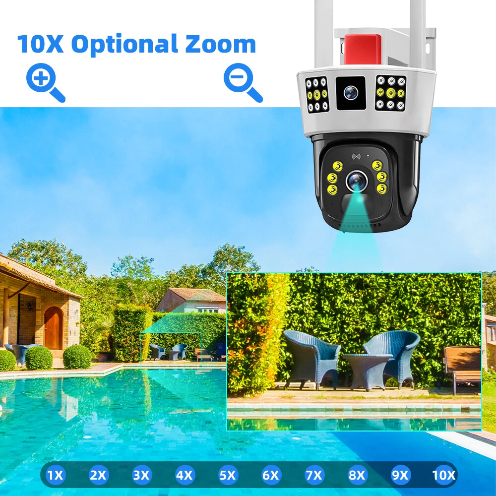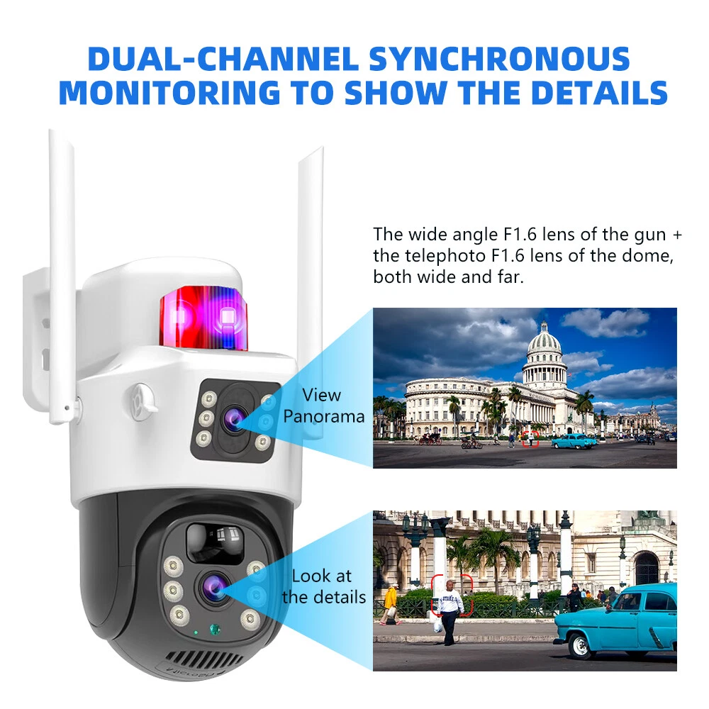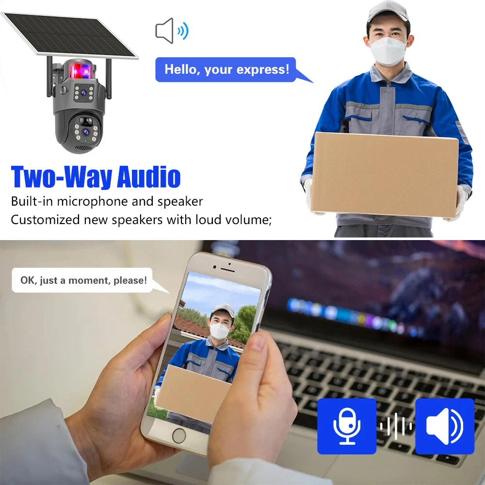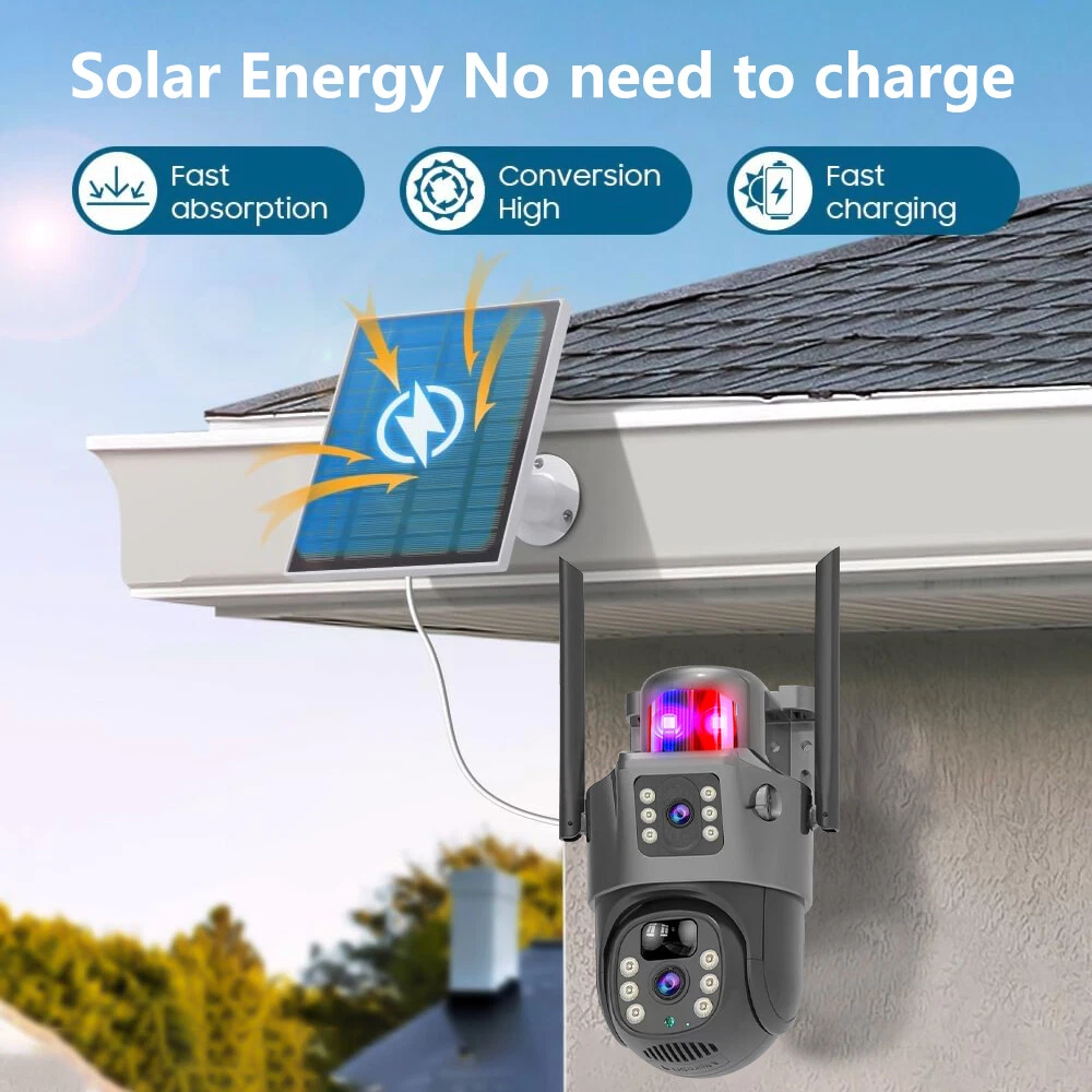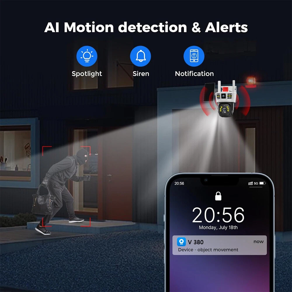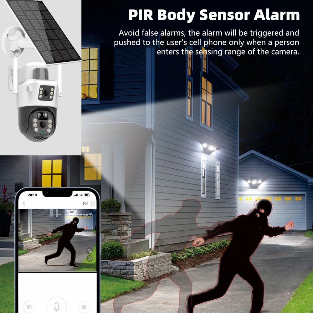 9MP Solar Camera Description Features: dual lens, dual screen viewing Option: WIFI=WIFI 2.4Hz connection 1:3MP+3MP+3MP million pixel outdoor solar monitoring camera 2. High definition: Shoot with a high-definition camera to ensure the effectiveness and quality of video shooting, allowing you to have real-time control of the outdoor environment. 3. Night vision system: optional infrared or color night vision, which can monitor the doorstep in real-time at any time to ensure safe and smooth enjoyment. 4. APP V380 Pro remote operation: functions such as remote operation, photography, and video recording, allowing remote control of the outdoor environment. 5. Voice intercom: With voice intercom function, you can transmit sound to the external environment through your phone or replay the sound to visitors through the device. 6. Custom alerts: supports custom alerts, and when you receive an alert, it will immediately send an alert message to your phone 7. Multi user remote access: Share the same camera with your family, leave everything you protect, and pay more attention to your home. 8. SD card: The maximum size of the SD card is 128GB, 9. Waterproof/Dustproof Ip66: The camera casing is made of high-quality ABS plastic and has waterproof, sunscreen, and dustproof functions. It is suitable for any environment. 10. Motion detection and automatic tracking: After locking the target, the camera will automatically adjust the pan tilt rotation. Track moving objects, cars, pets, humans, and push alert notifications to your smart Phone. Package List: 1x 9MP solar camera 1x bracket 1x solar panel with extension cable 1x installation package 1x instruction manual 1x 32GB card 4MP Solar Camera 3 screens shows on the V380 app Three images can be viewed simultaneously, and each image can be individually enlarged. Real time alerts Set up monitoring areas in advance, conduct actual testing, and promptly push alarm information. IP66 Waterproof / Dustproof The camera is equipped with IP66 case , which is waterproof, sun-proof and dust-proof. It is suitable for any environment. Clear Two Way Audio Built-in microphone and speaker / Customized new speakers with loud volume; You could talk to anyone nears the camera ( Warn someone to leave your house ). Advanced H.265 Video Compression H.265 (HEVC) doubles the coding efficiency compared with its predecessor H.264. H.265 video saves around 50% of the bit rate at the same quality of coding.H.265 only need less bandwidth,faster loading speed,more smooth video,Lower bite rate,higher image quality! 10X Zoom(Both 3 cameras support zoom) you can switch from 1X to 10X zoom instantly;it can fast zoom in or zoom out without lag;watch far and near images Simultaneously through Picture in Picture,don't miss a detail. Full Color Night Vision: When the white LED light is on, the camera will display colorful vision at night, and there are three night modes for you to choose. Ai Human Detect Alert Quickly finds human targets and immediately sends a notification to your phone, letting you see what happens anywhere. It only detects the human shape and will not trigger falsely for objects such as cars and trees. PTZ Control by APP Rotates 355° Horizontally and 90° Vertically.You can control it in the APP directly whenever you want and wherever you are. 6MP Solar Camera Specification: ● Resolution: 4MP; ● iode: 12 x IR white light; ● Night vision: 30m; ● Head: 355° horizontal rotation, 90° vertical rotation; ● PIR infrared sensor: 10m (32ft) 100 degree detection range; ● Battery standby: up to 365 days; ● IP66 outdoor battery camera; ● Cloud storage: supported; requires in-app subscription and payment; ● Local Storage: Supports micro SD card up to 128G (not built-in); ● Multi-viewing: supports sharing to up to 4 families; ● Input/Output: Built-in microphone and speaker; ● Apps: Eseecloud app; please search for this keyword on Google Play or iOS APP Store to download the app; ● Operating time: 10 months based on 3 events triggered per day; ● Operating temperature: -20°C to 60°C (4°F to 140°F); Battery powered+solar charging panel: Built in recyclable rechargeable battery, ultra-low power system optimization, energy saving, durable endurance, and long term standby with solar charging panel Picture in Picture , 8X Digital Zoom you can switch from 1X to 8X digital zoom instantly; it can fast zoom in or zoom out without lag; watch far and near images Simultaneously through Picture in Picture,don't miss a detail. Two-Way Audio Build in speaker and microphone,support clear two way voice speaking AI Auto Tracking When someone passes through the alarm area, the camera will detect the person's movement. And track people. PIR Human Detection When it is found that someone breaks into the monitoring area, the camera will immediately take a picture and push alarm to App. Full Color Night Vision When the white LED light is on, the camera will display colorful vision at night, and there are three night modes for you to choose. PTZ Control by APP Rotates 355° Horizontally and 90° Vertically.You can control it in the APP directly whenever you want and wherever you are. IP66 Waterproof / Dustproof The camera is equipped with IP66 case , which is waterproof, sun-proof and dust-proof. It is suitable for any environment.