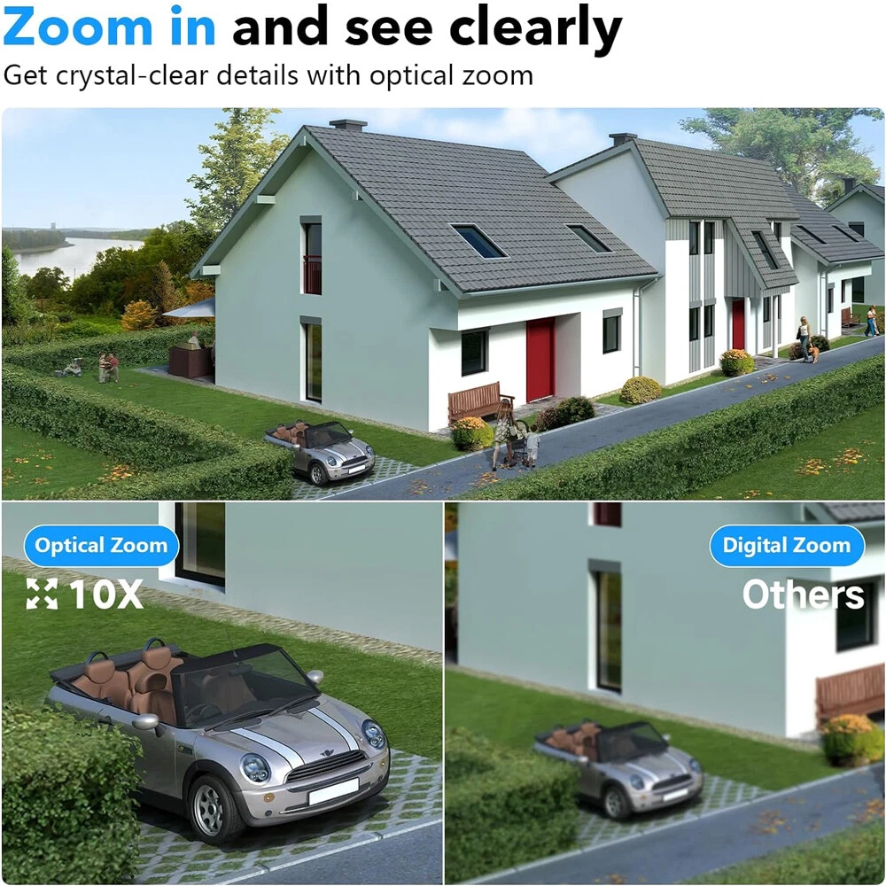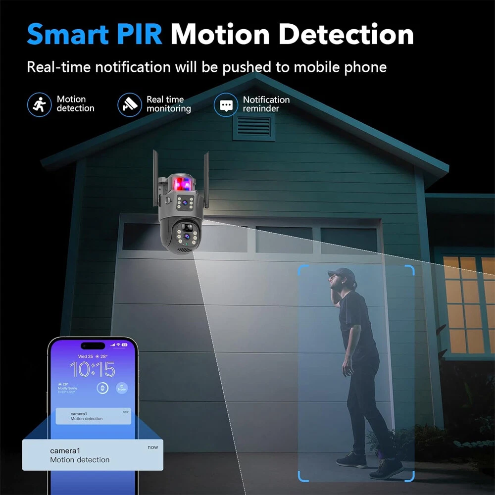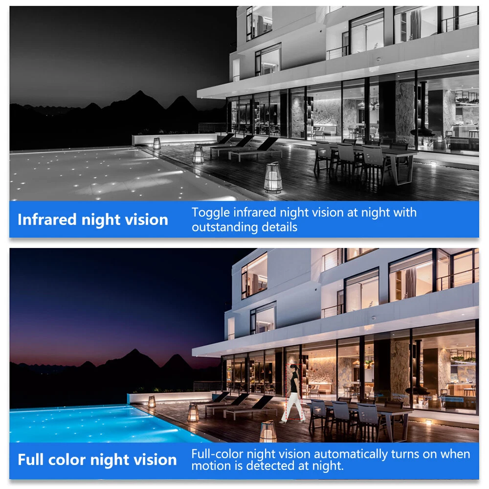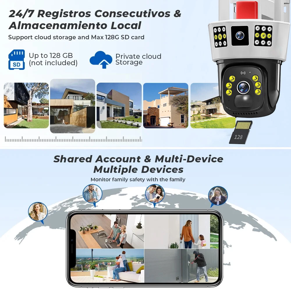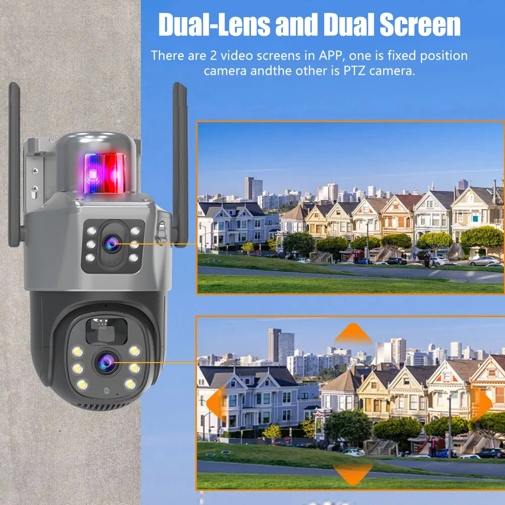 9MP Solar Camera Description Features: dual lens, dual screen viewing Option: WIFI=WIFI 2.4Hz connection 1:3MP+3MP+3MP million pixel outdoor solar monitoring camera 2. High definition: Shoot with a high-definition camera to ensure the effectiveness and quality of video shooting, allowing you to have real-time control of the outdoor environment. 3. Night vision system: optional infrared or color night vision, which can monitor the doorstep in real-time at any time to ensure safe and smooth enjoyment. 4. APP V380 Pro remote operation: functions such as remote operation, photography, and video recording, allowing remote control of the outdoor environment. 5. Voice intercom: With voice intercom function, you can transmit sound to the external environment through your phone or replay the sound to visitors through the device. 6. Custom alerts: supports custom alerts, and when you receive an alert, it will immediately send an alert message to your phone 7. Multi user remote access: Share the same camera with your family, leave everything you protect, and pay more attention to your home. 8. SD card: The maximum size of the SD card is 128GB, 9. Waterproof/Dustproof Ip66: The camera casing is made of high-quality ABS plastic and has waterproof, sunscreen, and dustproof functions. It is suitable for any environment. 10. Motion detection and automatic tracking: After locking the target, the camera will automatically adjust the pan tilt rotation. Track moving objects, cars, pets, humans, and push alert notifications to your smart Phone. Package List: 1x 9MP solar camera 1x bracket 1x solar panel with extension cable 1x installation package 1x instruction manual 1x 32GB card 4MP Solar Camera 3 screens shows on the V380 app Three images can be viewed simultaneously, and each image can be individually enlarged. Real time alerts Set up monitoring areas in advance, conduct actual testing, and promptly push alarm information. IP66 Waterproof / Dustproof The camera is equipped with IP66 case , which is waterproof, sun-proof and dust-proof. It is suitable for any environment. Clear Two Way Audio Built-in microphone and speaker / Customized new speakers with loud volume; You could talk to anyone nears the camera ( Warn someone to leave your house ). Advanced H.265 Video Compression H.265 (HEVC) doubles the coding efficiency compared with its predecessor H.264. H.265 video saves around 50% of the bit rate at the same quality of coding.H.265 only need less bandwidth,faster loading speed,more smooth video,Lower bite rate,higher image quality! 10X Zoom(Both 3 cameras support zoom) you can switch from 1X to 10X zoom instantly;it can fast zoom in or zoom out without lag;watch far and near images Simultaneously through Picture in Picture,don't miss a detail. Full Color Night Vision: When the white LED light is on, the camera will display colorful vision at night, and there are three night modes for you to choose. Ai Human Detect Alert Quickly finds human targets and immediately sends a notification to your phone, letting you see what happens anywhere. It only detects the human shape and will not trigger falsely for objects such as cars and trees. PTZ Control by APP Rotates 355° Horizontally and 90° Vertically.You can control it in the APP directly whenever you want and wherever you are. 6MP Solar Camera Specification: ● Resolution: 4MP; ● iode: 12 x IR white light; ● Night vision: 30m; ● Head: 355° horizontal rotation, 90° vertical rotation; ● PIR infrared sensor: 10m (32ft) 100 degree detection range; ● Battery standby: up to 365 days; ● IP66 outdoor battery camera; ● Cloud storage: supported; requires in-app subscription and payment; ● Local Storage: Supports micro SD card up to 128G (not built-in); ● Multi-viewing: supports sharing to up to 4 families; ● Input/Output: Built-in microphone and speaker; ● Apps: Eseecloud app; please search for this keyword on Google Play or iOS APP Store to download the app; ● Operating time: 10 months based on 3 events triggered per day; ● Operating temperature: -20°C to 60°C (4°F to 140°F); Battery powered+solar charging panel: Built in recyclable rechargeable battery, ultra-low power system optimization, energy saving, durable endurance, and long term standby with solar charging panel Picture in Picture , 8X Digital Zoom you can switch from 1X to 8X digital zoom instantly; it can fast zoom in or zoom out without lag; watch far and near images Simultaneously through Picture in Picture,don't miss a detail. Two-Way Audio Build in speaker and microphone,support clear two way voice speaking AI Auto Tracking When someone passes through the alarm area, the camera will detect the person's movement. And track people. PIR Human Detection When it is found that someone breaks into the monitoring area, the camera will immediately take a picture and push alarm to App. Full Color Night Vision When the white LED light is on, the camera will display colorful vision at night, and there are three night modes for you to choose. PTZ Control by APP Rotates 355° Horizontally and 90° Vertically.You can control it in the APP directly whenever you want and wherever you are. IP66 Waterproof / Dustproof The camera is equipped with IP66 case , which is waterproof, sun-proof and dust-proof. It is suitable for any environment.
