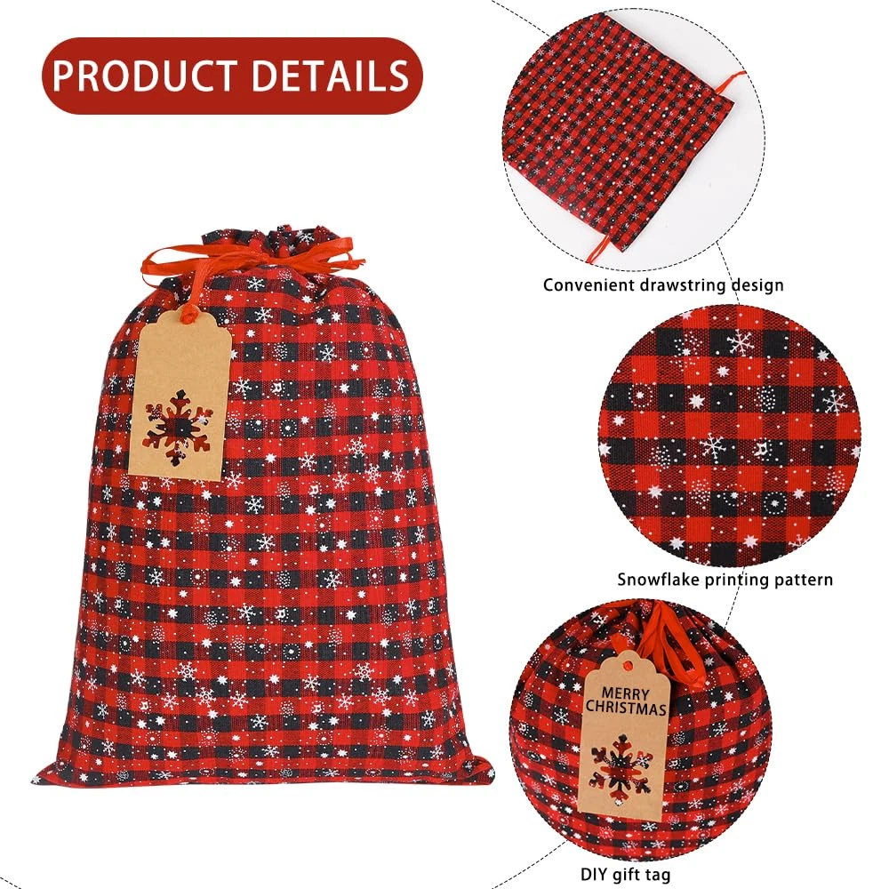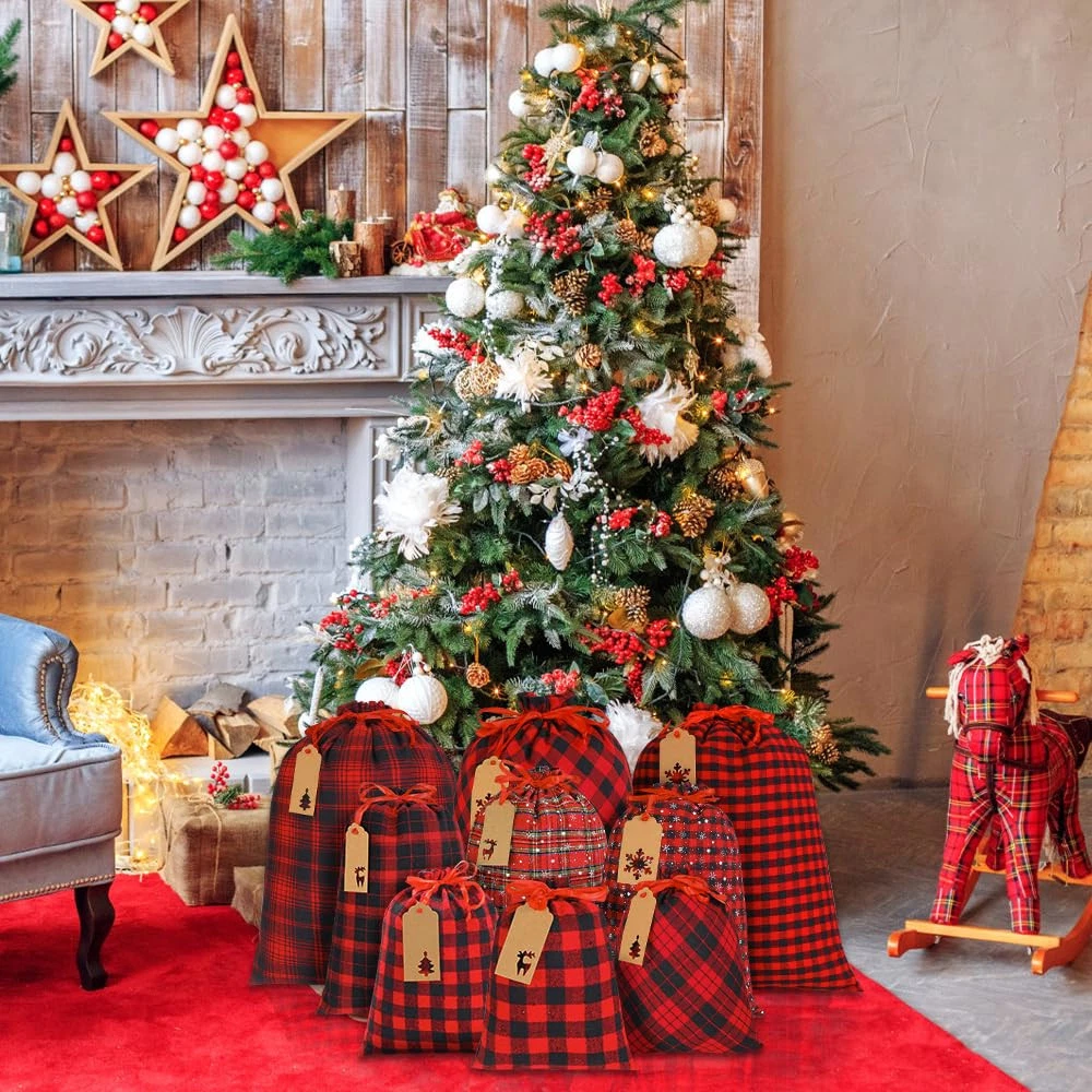 Value Christmas Drawstring Bags Sets:You will receive 9PCS Three sizes Christmas Drawstring Bags and 9 kraft paper tags in three styles(snowflakes,christmas tree, deer).You can write a message or name on the tag.To distinguish between different surprise and the person who wants to give them .Classic color scheme(Also contains printing snowflake patterns).Absolutely the perfect addition to your Christmas decor and home decorations. Premium Material:These Christmas Storage Bags are Made of cotton fabric and linen material,hand-made,Soft and comfortable to the touch, no fading.Exquisite workmanship,Use and long lasting.You can share with your friends and experience this different christmas with them. Multi-Size:There are three sizes of bags, 40*50, 30*40, 25*30cm,Suitable size, large interior space.You can decorate your home by putting christmas candy, chocolate, toys into your Christmas Bags and Decorate them in the right place (near the Christmas tree, near the fireplace, etc.).Add a warm festive vibe to your home . Classic Buffalo Plaid Design:They are in the classic black and red check style.Made of cotton and linen, hand sewn.Soft and comfortable to the touch, no fading.The upper part of the christmas treat bags uses a ribbon as a drawstring for easy tightening and opening. Great Christmas Party Decor : Christmas Buffalo Plaid Bags of Christmas ornaments.It’s also can be applied to various decoration for Christmas, such as mantels, walls, doors,homes, farmhouses. Coordinate with Christmas theme, can add to Christmas festival atmosphere.You can also fill the bag with various surprise for your family and friends.