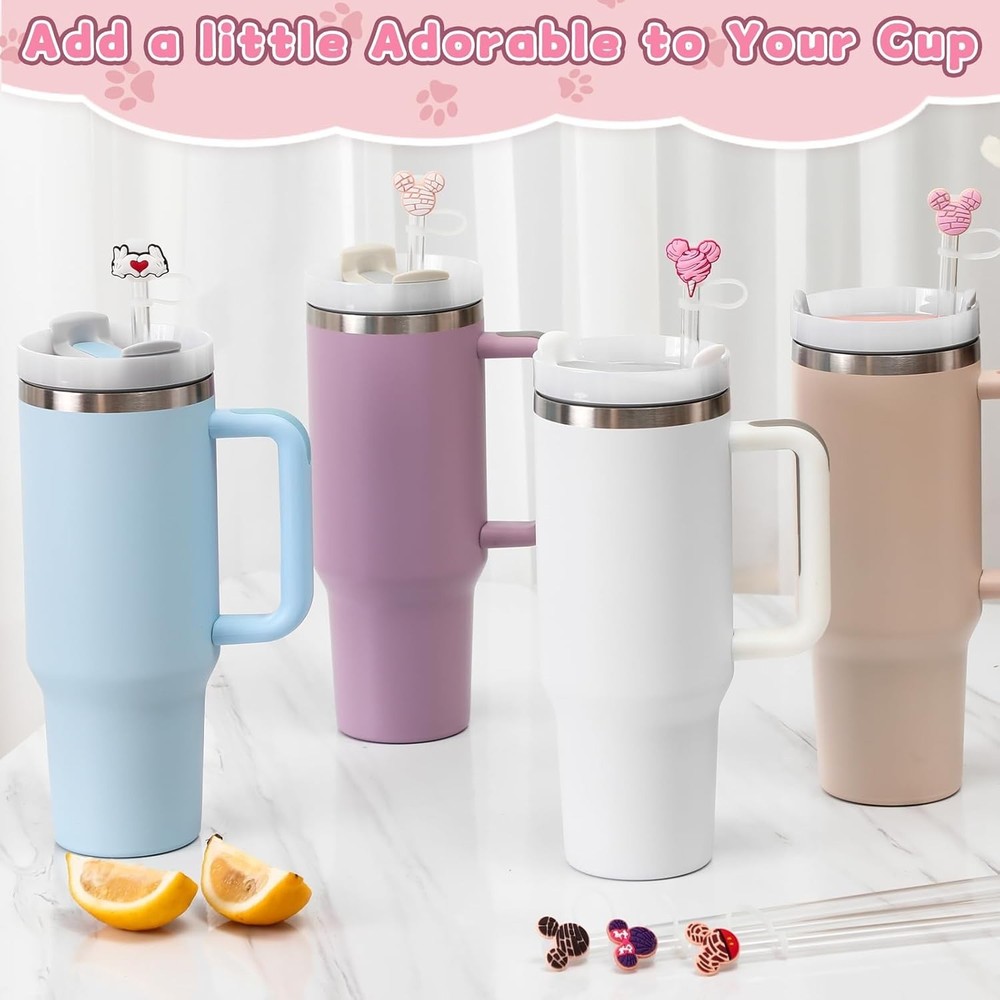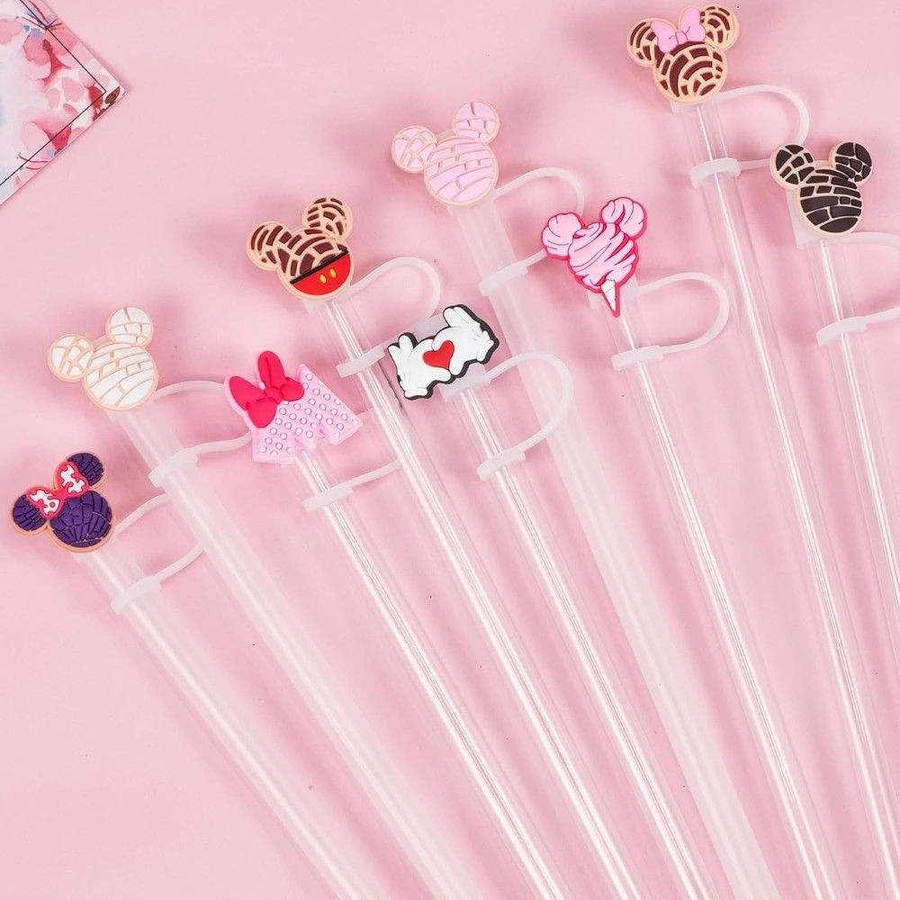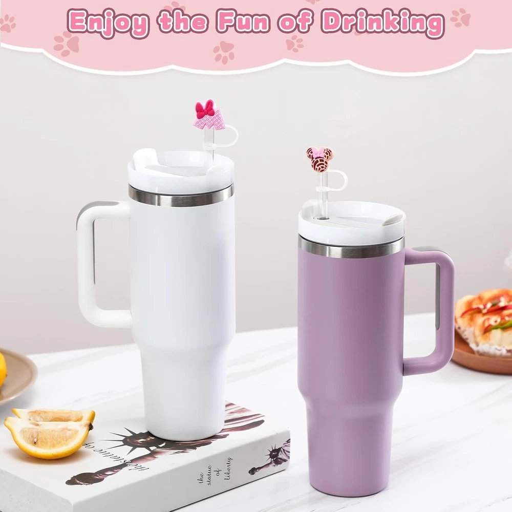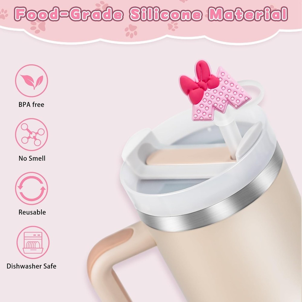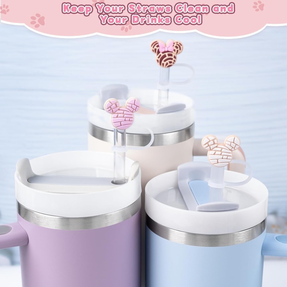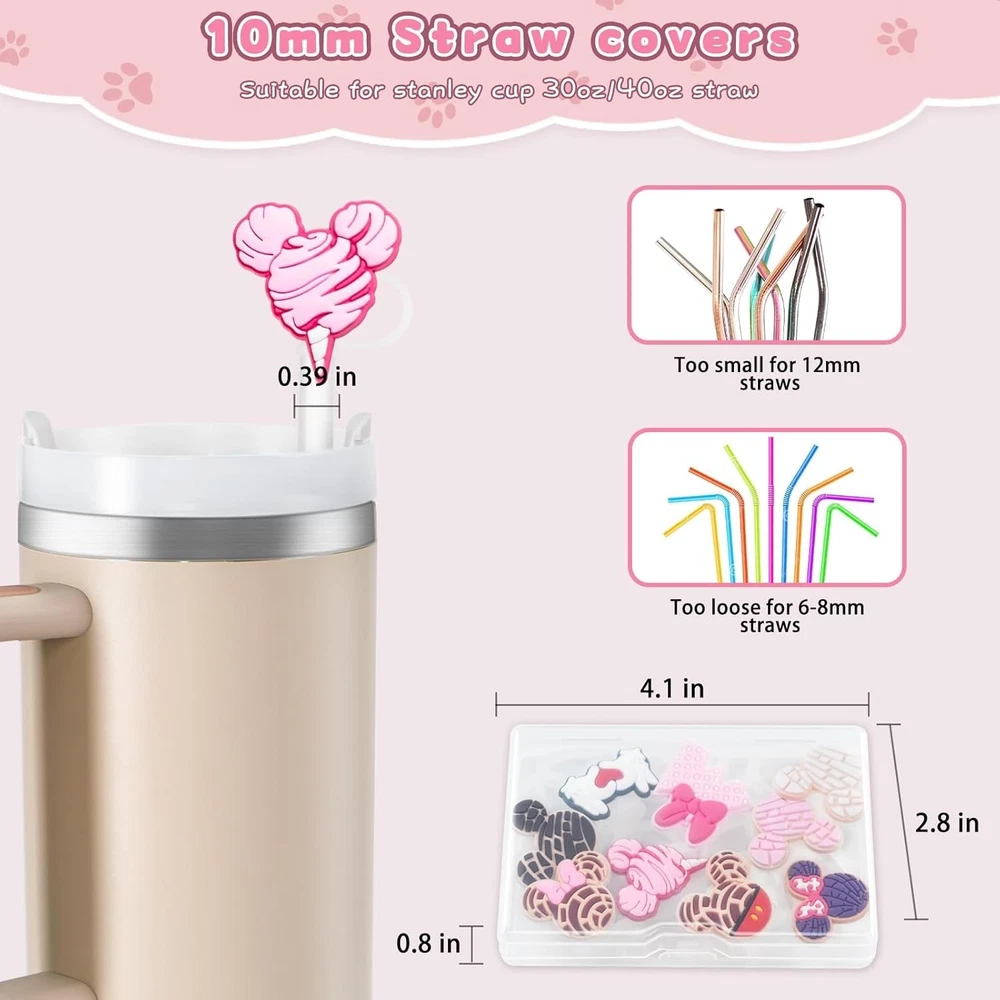 9PCS Straw Covers for Stanley Cup Tumbler 30 oz / 40 oz Leak Proof Straw Toppers 10mm Silicone Cute Caps for Stanley Cup Accessories-Pink Mice-9pcs About this item Fit for 10mm/0.39in Straws: This package includes 9pcs of Pink Mice Straw covers in different styles, designed to fit Stanley cup 30oz/40oz straws. Please note that these covers are too small for 12mm straws and too loose for 6-8mm straws. Be sure to confirm the size of your straw before purchasing the cover caps. Food Grade Material Silicone: Straw covers are made of premium food-grade silicone, no mess. It is also dishwasher safe and hand-washed easily, making cleaning much easier. Anti-Spill Feature & Sealed Protection: Featuring a seal design, and elastic silicone material, this straw cover cap is dustproof, and spillproof, and can effectively keep your drinking cup clean. It allows you to conveniently carry your cup to various outdoor activities. Such as parties, walking, camping, and hiking. Fun and Cute: Straw cover cap for Stanley Cup with a cute and fashionable design, adding a touch of personality and style to your straw. And the uniqueness of the cap makes it easy to know which one is yours. These straw toppers make great presents for families or friends who enjoy a blend of utility and aesthetics in their drinkware. Package: 9pcs straw caps packaged in a clear box.
