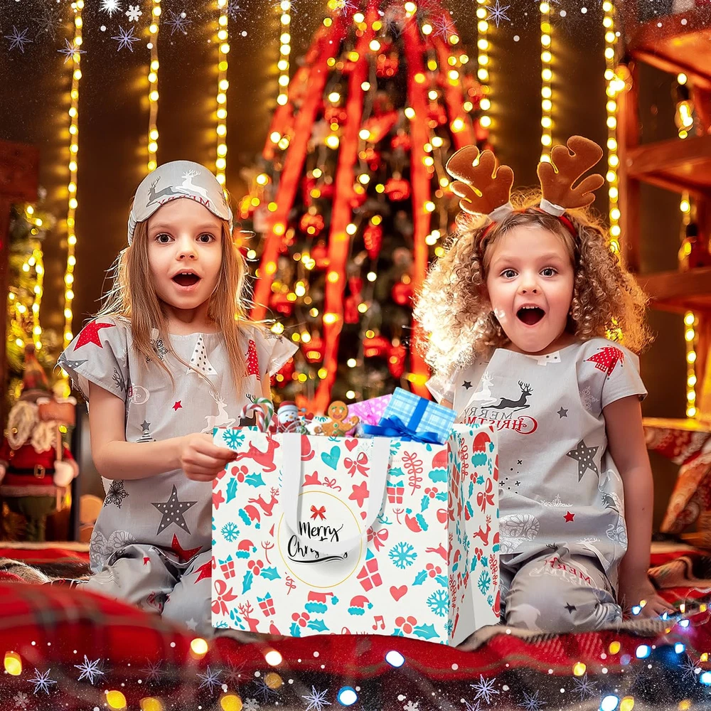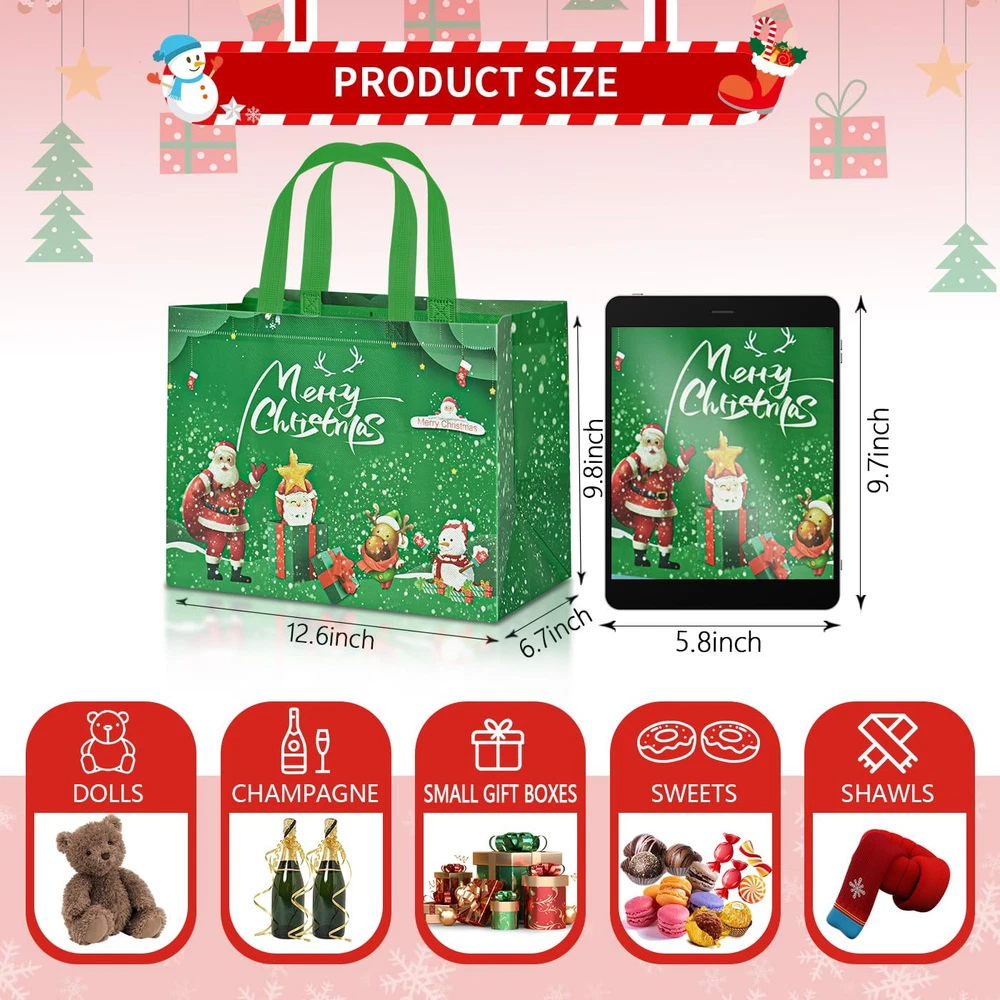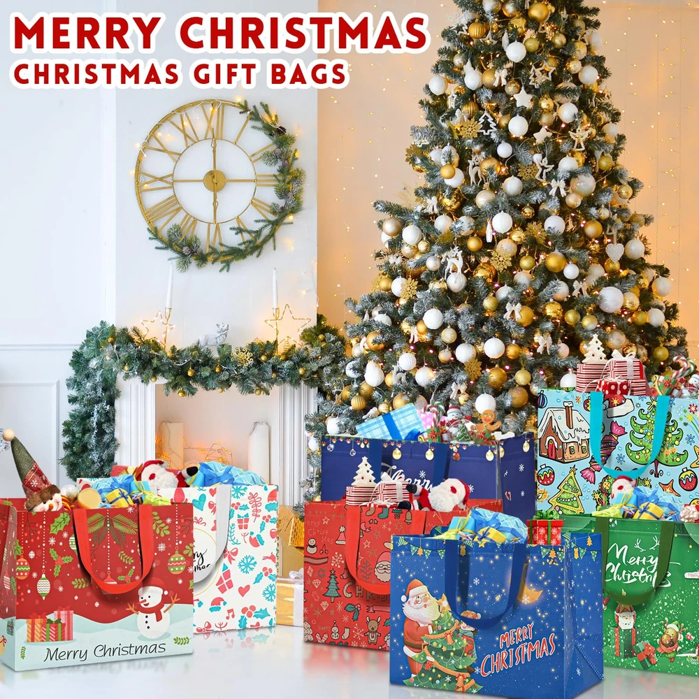 【Fun and Festive Christmas Designs】This set of 9 large christmas gift bags for kids is perfect for bringing Christmas magic to life for everyone. Each christmas gift bag features vibrant, kid-friendly holiday designs, including adorable images of Santa Claus, reindeer, snowmen, gingerbread men, and Christmas trees. With playful motifs and cheerful colors, these bulk christmas bags ensuring that both kids and adults will be delighted by their festive charm. 【Durable and Child-Safe Gift Bags】Crafted from high-quality, non-toxic, and odorless non-woven fabric, these reusable christmas tote bags are completely safe for children to handle. The widened, reinforced handles make it easy to carry even heavier presents, making them perfect for holiday parties or family gatherings. Sturdy and reliable, these xmas bags for gifts will hold up to the excitement of gift-giving without tearing or breaking, offering peace of mind for parents 【Perfect Size for Kids' Gifts】Each medium christmas gift bags measures 12.4 x 9.7 x 6.8 inches, making it an ideal size for a wide variety of children's gifts. Whether you're wrapping toys, books, or clothing, these medium-sized bags provide just the right amount of space. The sleek design ensures that your presents look polished and festive, while still being practical and easy to carry, allowing kids to enjoy unwrapping their gifts in style 【Eco-Friendly and reusable christmas bags】These holiday bags for gifts are as practical as they are fun, offering an eco-friendly alternative to traditional wrapping paper. After the holidays, they can be repurposed as christmas shopping bags or grocery bags, reducing waste and adding long-term value. Ideal for families who want to celebrate the holidays sustainably, these bags are a cost-effective and environmentally conscious choice. 【Make Every Gift Unforgettable This Christmas】Add a sprinkle of holiday magic to your celebrations with these delightful christmas bags for gifts large. Crafted to make every present feel truly unique, these bags are sure to bring joy and excitement to both kids and adults. Order now to make your holiday gift-giving more memorable and fun, while spreading festive cheer to everyone!