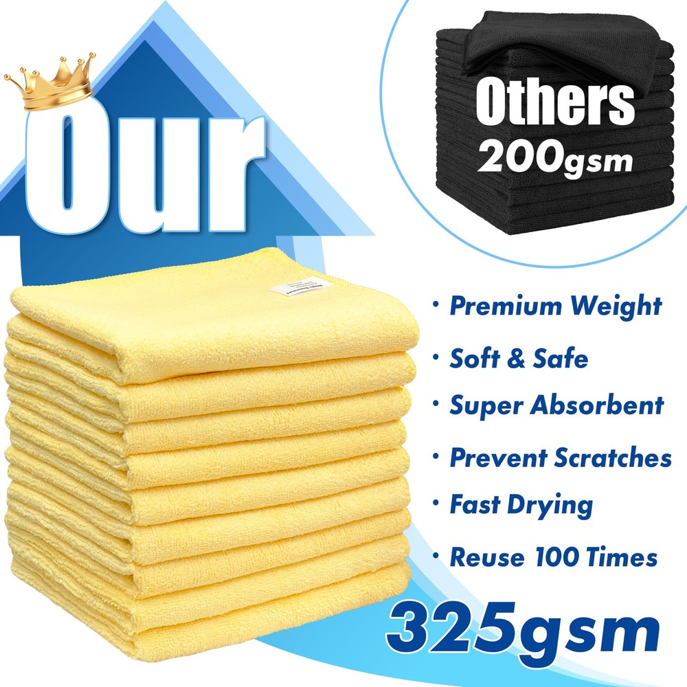 9-Pack Microfiber Cleaning Towels, Heavy-Duty & Reusable Cloths for Home, Kitchen, and Car, 16" x 24", 325 GSM Made for Daily Household Cleaning: Ideal for kitchen counters, sinks, stovetops, bathroom surfaces, mirrors and more; also works great for cars, windows, and general cleaning tasks Premium Weight, Heavy-Duty Performance: Crafted with high-density 325 GSM microfiber for enhanced durability and absorption; heavier and more substantial than standard cleaning towels Soft-Touch and Safe on Surfaces: Non-abrasive texture is gentle on hands, cookware, appliances, and fixtures - perfect for delicate finishes and everyday use Extra Absorbent and Fast Drying: Holds up to 8 times its weight in water, making it ideal for spills, drying dishes, or wiping down bathroom counters Reusable and Eco-Friendly: Use it over 100 times with proper care - a smart and sustainable swap for wasteful paper towels Generous Size and Multi-Purpose: Each towel measures 16" x 24" - large enough for big jobs, yet easy to fold for smaller tasks in kitchen drawers or cleaning caddies