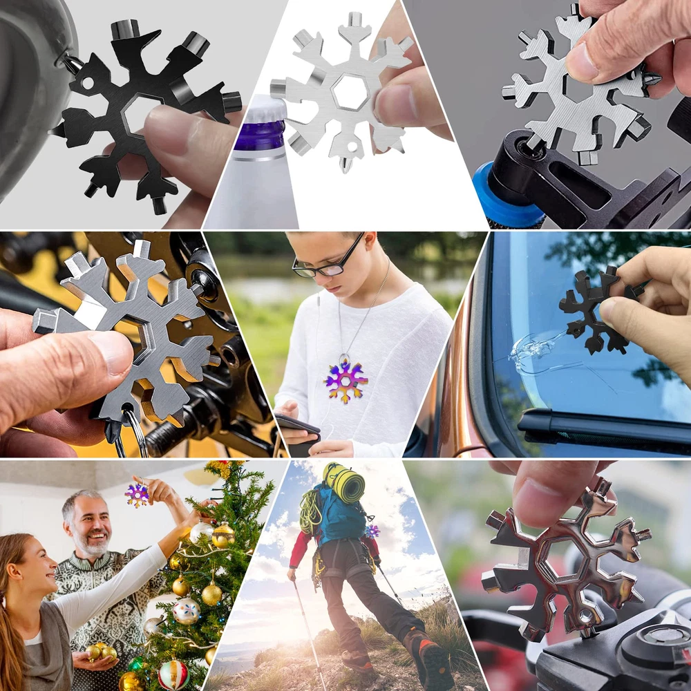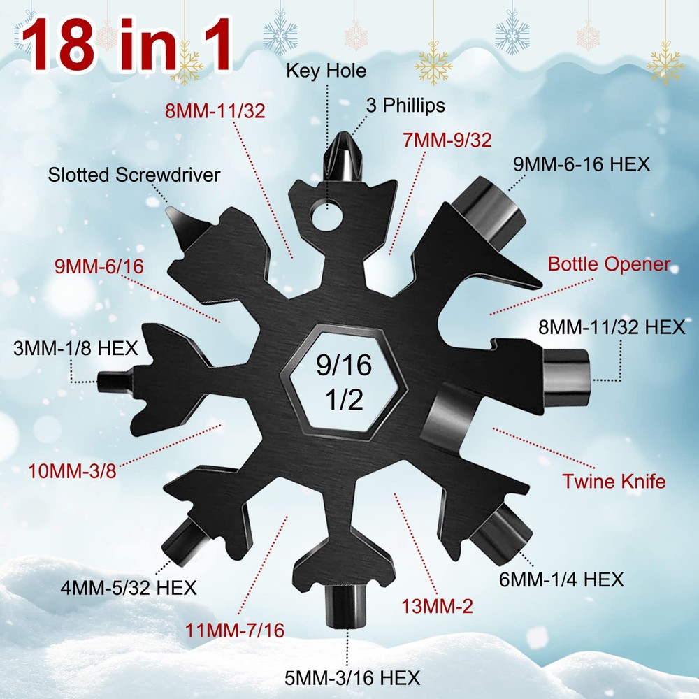 18 in 1 JOLLY SNOW SNOWFLAKE MULTITOOL:Each snowflake tool has more than 18 uses,such as hexagon screwdrivers,wrenches,slotted screwdrivers ,phillips screwdrivers of different sizes.It can be also used ,Bottle Opener, Box Cutter,Rope Cutter,Gift Hanging Drop,etc. SMALL SIZE& KEYRING DESIGN: Our snowflake multi tool is Pocket Size.It just over 2.5" in diameter.It is so easy to be taken along.Because snowflake tool comes with a key ring that can be hung on a key or backpack.Key ring is designed to avoid the possibility of loss. MULTIPLE USES: One snowflake tool to unlock for multiple purposes.One snowflake multitool can be used to open the beer bottle,turn the screw,fix snowboarding,bicycle,Toys and more.It can be also used to open the carton, hung on the key or backpack. Hang on the Christmas tree for decoration or as a gift.When camping,rescue,boarding also be used. BEST CHRISTMAS GIFT: You will get 9 x multi-tool,9 x key rings,1 x Merry Christmas gift card,1 x gift box.It is an excellent gift for Christmas gifts.It's a good choice whether it's for Christmas decorations or as gifts. STURDY&DURABLE:Snowflake tools 18-in-1 multi-tool is made of high quality stainless steel,exquisite workmanship.It is so sturdy and durable.Unique snowflake shaped design.Combine function and design in our compact multi-tool. Practical and beautiful.