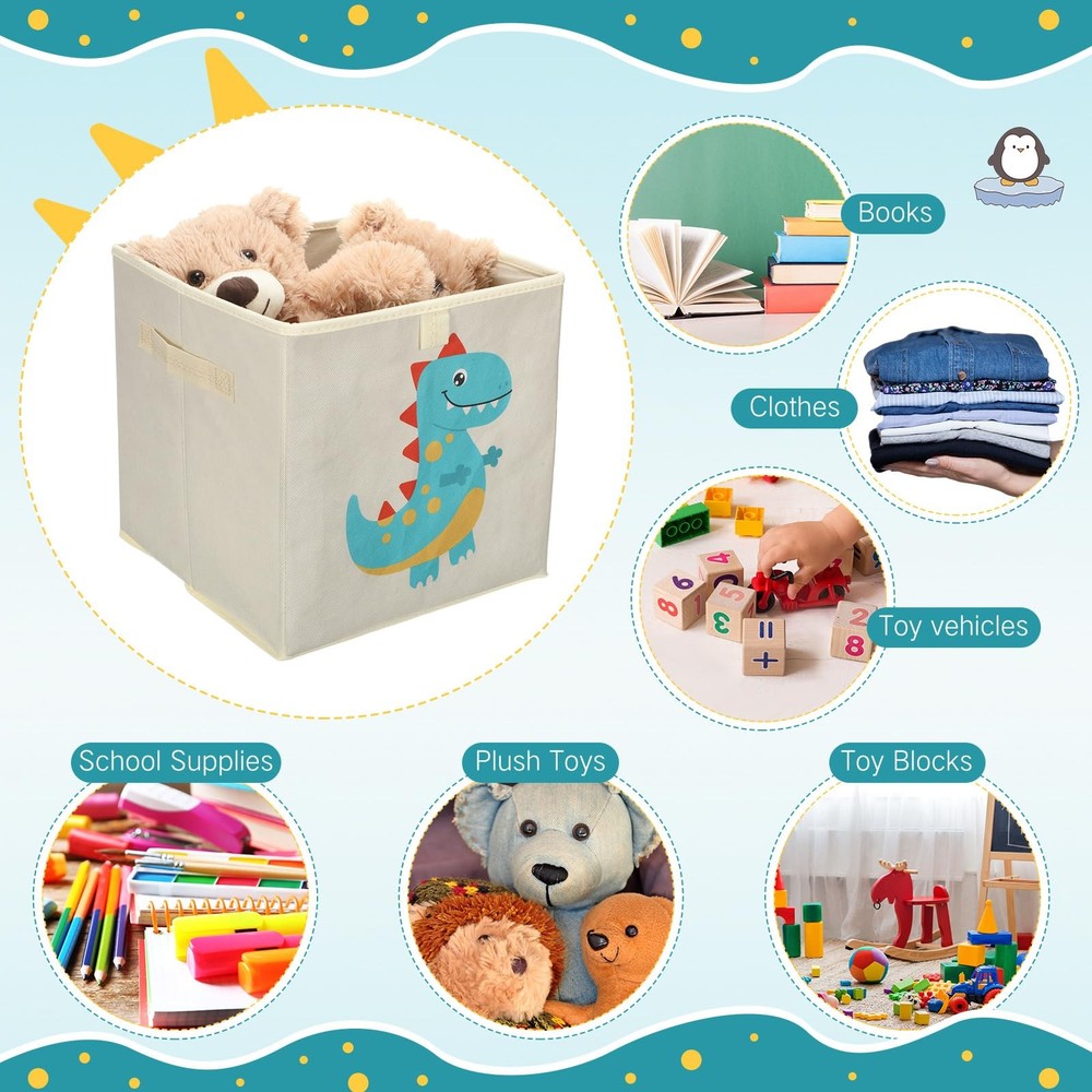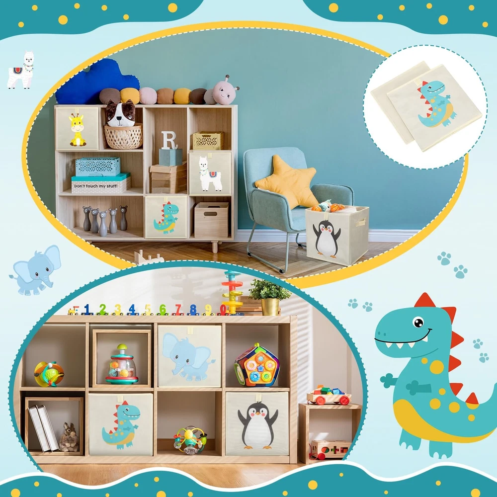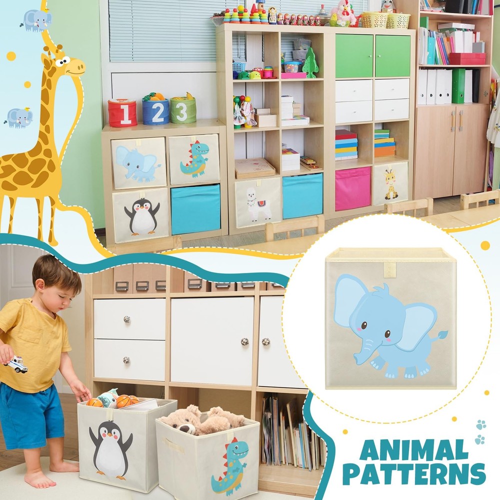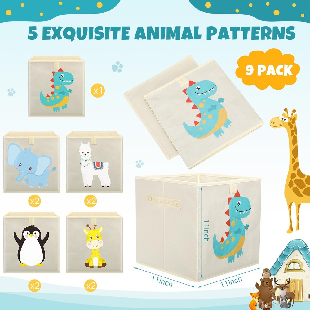 Features: The animal storage basket can be regarded as book storage boxes, toy storage organizer, clothes boxes and more, practical and adorable. These toy containers for kids are designed with an open top and 2 sturdy handles for easy access and convenient pulling or pushing. Specifications: Material: quality non woven fabric, with sturdy cardboard support at bottom Color: as shown in pictures Size: about 11 x 11 x 11 inches Package includes: 9 x Kids cube storage organizer Notes: Manual measurement, please allow slight errors on size. The color may exist a slight difference due to different screen displays. Unmatched Convenience for Everyday Use: to ensure easy access, each kids storage bin is designed with an open top; The inclusion of 2 sturdy handles allows for convenient pulling or pushing; This user friendly design enhances the bins' convenience and ease of use, simplifying the process of tidying up Quality Construction Ensuring Durability: crafted from quality non woven fabric, our animal toy box organizer are designed to last; A sturdy cardboard support at the bottom ensures long term durability and keeps your items well secured, highlighting the products' quality material and reliability Suitable Storage Solution with Large Size: featuring a size of approximately 11 x 11 x 11 inches, these kids cube storage organizers offer ample space to store toys, books, clothing, and other items; With the set including 9 bins, they make organizing easy and clutter free, fulfilling customer needs for sufficient storage solutions Adorable Animal Pattern Design: delivering both functionality and aesthetics, these nursery storage bins are decorated with charming animal patterns; They blend well with children's rooms or playrooms, providing a fun decorative touch to any setting; Their appealing design and foldable feature hold multifunctional use, doubling as both storage and a decorative element Multipurpose and Versatile: not only does our package offer a sufficient quantity of 9 kids storage cubes, but these bins also serve versatile purposes; They provide an ideal storage solution for children's' rooms, nurseries, bathrooms, offices, and other indoor spaces; Their multipurpose usage also includes storing books, toys, clothes, accessories, and other small items, adding function and charm to your various storage needs