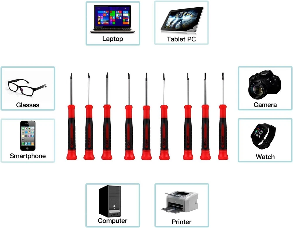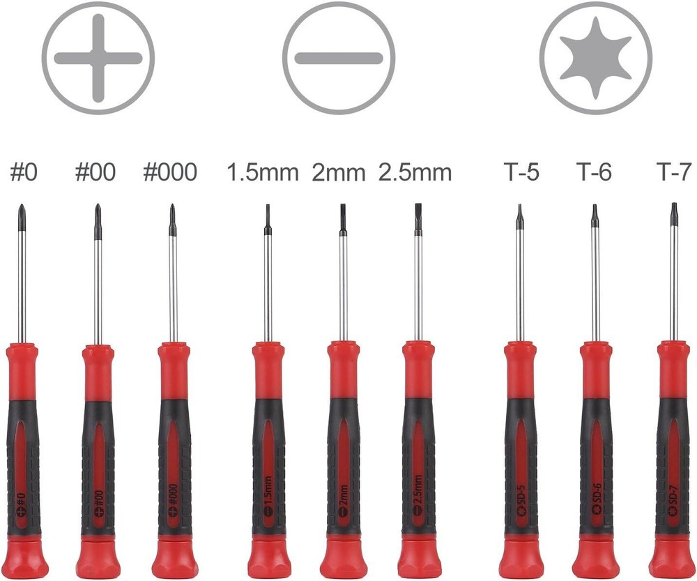 Description High strength chrome vanadium steel shafts reduce wear-outs and stripping for longer tool life Corrosion and rust resistant chrome plating finish provides durability and longevity Precisely machined and magnetized tips for easy holding fasteners to start screwing and also prevent fasteners dropping after unscrewing Swivel end cap allows constant finger pressure while driving and non-slip rubber handle grips for maximum turning power Set includes total 9 pieces mini screwdrivers: (3) Phillips #0, #00, #000; (3) Slotted 1.5mm, 2.0mm, 2.5mm; (3) Torx Star T-5, T-6, T-7 EFFICERE 9-Piece Precision Screw Drivers Set contains a versatile selection of the most commonly used sizes, in Phillips, Flat and Torx (Star). It is the perfect choice for your daily electronics device repairs, including smart cell phones (fits smartphones Apple iPhone 6 6S 7 7S 8 8S Plus X and Samsung note galaxy S5 S6 S7 S8), tablets such as iPad Air, laptops, Mac, Macbook Pro, desktops, computers, cameras, printers, thermostats, game stations, wii, watches, even eyeglasses, jewelry, guitar and a lot more. Constructed from premium chrome vanadium steel with a corrosion-resistant chrome plated finish, these screwdrivers are built to last. All the tips and heads are precisely milled through CNC machine for accurate size that fits exact fastener. Tips are also magnetic and prevent dropped fasteners during installation and removal. Comfortable rubber handles provide a non-slip grip during use. Swivel end caps allow for constant finger pressure while driving. They meet or exceed ANSI standards. Kit includes 3 pc. Phillips sizes #0, #00, #000; 3 pc. Slotted sizes 1.5mm, 2.0mm, 2.5mm; and 3 pc. Torx sizes T5, T6, T7.