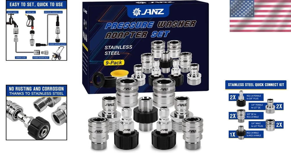 9-Piece Stainless Steel Pressure Washer Adapter Set - M22 to Quick Disconnect