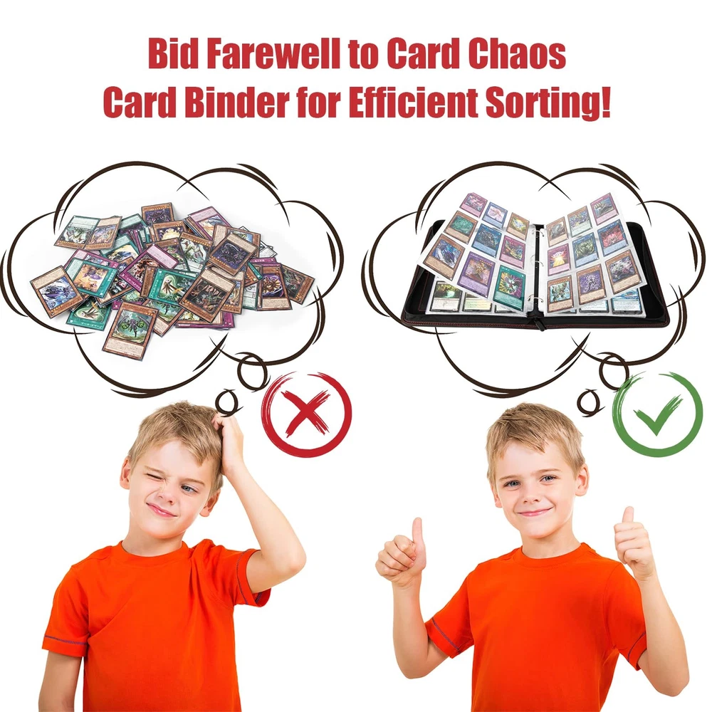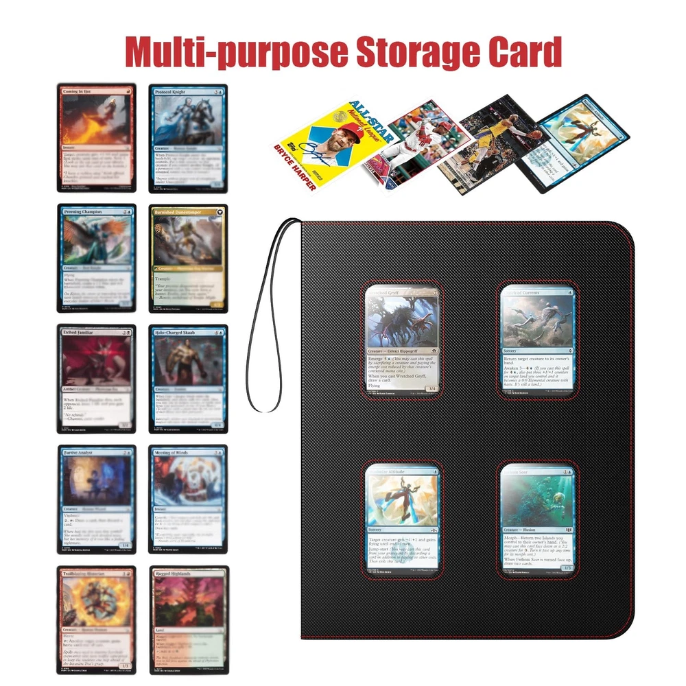 Organize your collection of trading cards, baseball cards, or other precious card items with this sturdy 9 pocket card binder. Designed with multiple pockets, this binder allows you to neatly store and display your cards while protecting them from damage. The clear plastic pockets provide a secure fit, keeping your cards firmly in place. With its durable construction and ample storage capacity, this binder is an essential accessory for any serious card collector or enthusiast. Easily transport your prized possessions and showcase your collection with pride. 【Unique Display Design 】 The trading card binder features 4-window display system. The unique cover window design to proudly showcase your favorite Card, integrated visual windows enable instant card type recognition. 9 pocket binder holder trading card, fits 720 cards with 40 removable sleeves. The 3-ring design is allows effortless sleeve addition or remove sleeves and meets all your collection needs. 【Premium Details】Our card binder is crafted with waterproof PU leather and reinforced edges, providing ultimate protection against wear, tear, and potential damage, durable quality. The card sleeves are acid-free, non-toxic, and highly transparent, ensuring card safety. The superior quality allows you to see all the cards clearly without taking them out, making it easy to show them to your friends. 【Great Portability】 The binder designed with wristband design ensures convenient portability wherever you go. You can take the card binder to school or friends' homes to share your favorite cards with your good friends or classmates at any time. The wristband has a smooth surface that won't hurt your wrists. 【Unique Gift Idea】Our card holder Book has a unique design. The sleek cover not only make a statement but also reflect your unique style. Smooth zipper benefits to zip up or expand, again preventing card from slip off and protecting privacy. It is perfect for gifting to children, fathers, as a birthday gift, Thanksgiving or Christmas gift, and more. 【Wide Application】Holds standard sized cards with 2.8inches*3.9inche/3inches*4 inches or smaller. Designed to accommodate various card sizes, the trading card case is compatible with most popular Baseball Cards, MTG Cards, Football Star Collect Card and Game Cards.