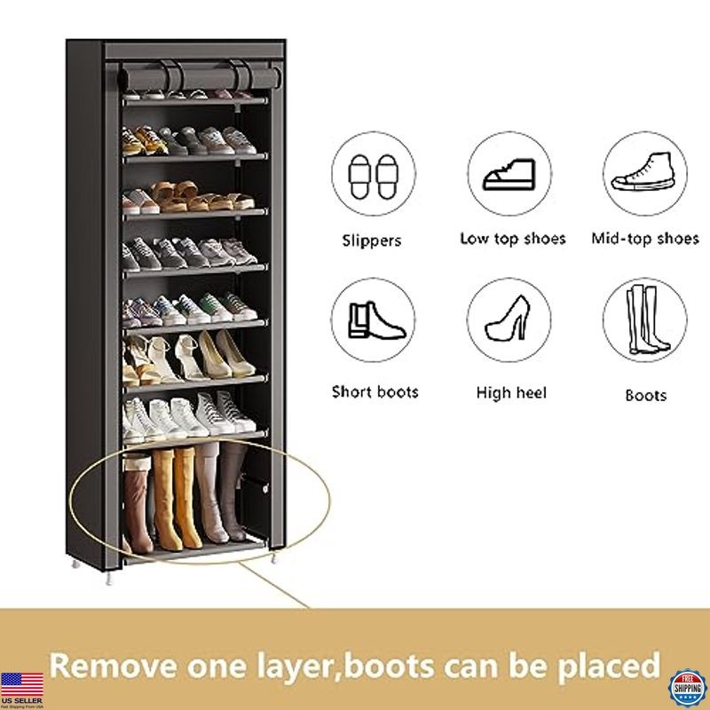 Calmootey 9 Tier Shoe Rack Organizer,Portable Shoe Shelf with Nonwoven Fabric Cover for Closet Hallway,Bedroom,Entryway,Grey Description Organize your footwear effortlessly with the Calmootey 10-Tier Shoe Rack, designed to keep your entryway, hallway, or garage tidy and stylish. With the capacity to hold up to 27 pairs of shoes, this versatile rack features removable tiers for customizing space to accommodate everything from heels to long boots. Its sturdy metal construction and dustproof cover ensure your shoes remain clean and protected. Transform clutter into order with this functional and chic shoe storage solution! Product reference: B0B6ZWHXXJ. Features 【PRACTICAL】- This shoe rack is great for keeping entrances, hallways, utility rooms, apartments, or garages neat and tidy. Make your home organized and refuse to be a mess. 【HOLDS A LOT】- Keep your shoes in order and are easy to access with this 23.62"L x 11.81" W x 62.99"H shoe rack. It's spacious enough to fit up to 27 pairs of shoes. 【STACKABLE & ADJUSTABLE】- It can be stacked to fully organize your shoes, or you can remove a row as needed to accommodate different kinds of shoes, such as long rain boots and high heels. 【DUSTPROOF COVER】- The freestanding shoe rack's cloth cover has a double row of zippers that both close and unfold to keep out dust and keep your shoes clean. 【EASY TO ASSEMBLE】- The package comes with instructions, and no additional tools are required. Please pay attention to the metal edges when assembling to prevent scratches. Shipping Free & Fast Shipping: We offer free shipping to most of the USA with a normal delivery time of 3-7 days. However, due to the current situation, additional delivery time (up to 3 weeks) may be required for some items. Alternative Carriers: We may use alternative carriers (e.g., USPS, FedEx, UPS) to ensure your package arrives safely and on time. Due to the use of multiple carriers, we are unable to provide a tracking number automatically. Handling Time: Orders are processed and shipped within 1-2 business days of receiving cleared payment. Shipping Restrictions: Shipping to Alaska, Hawaii, Puerto Rico, Guam, and other US territories may incur shipping charges or delivery restrictions. Please contact us before ordering, or your order can be refunded/cancelled. State Restrictions: Certain items may not be shipped to California due to state regulations. Contact for Tracking Updates: If you require tracking updates or have any concerns about the delivery of your order, please feel free to contact us, and we will be happy to assist you. Return Policy 30-Day Hassle-Free Returns: If you are not completely satisfied with your purchase, you can return the item for free within 30 days of receiving it for a full refund or exchange. Easy Return Process: Contact us, and we will provide you with a prepaid return shipping label and detailed instructions. No Restocking Fee: There are no restocking fees for returns. However, the buyer is responsible for return shipping costs if the return is not due to a seller's error. Refund Processing: Refunds will be processed within 1 business day of receiving the returned item in its original condition. Payment We accept all major credit cards, PayPal, and Pay for your convenience. Your payment information is secure and encrypted to ensure a safe and seamless transaction. Please complete your payment within 3 days of purchase to avoid any delays in shipping. Feedback Your feedback is extremely important to us. We strive to provide the best products and customer service possible. If ...