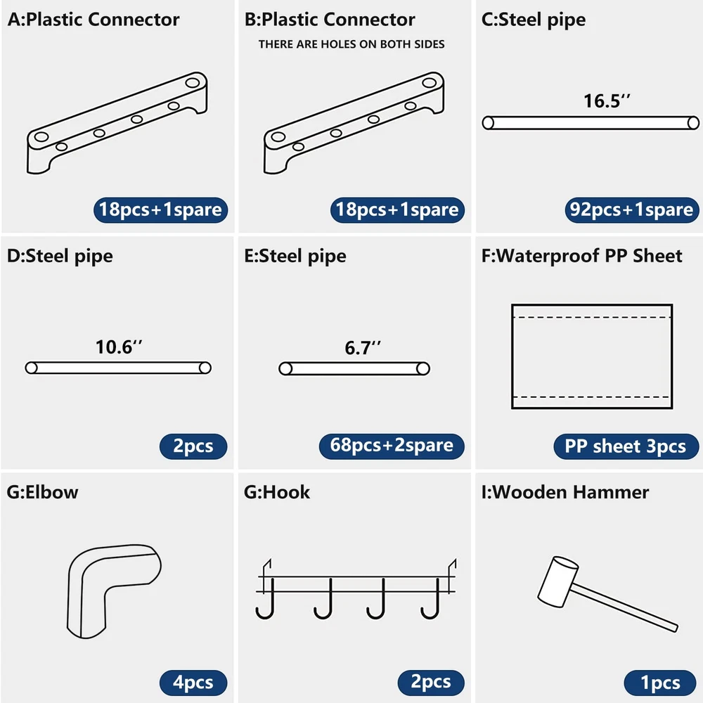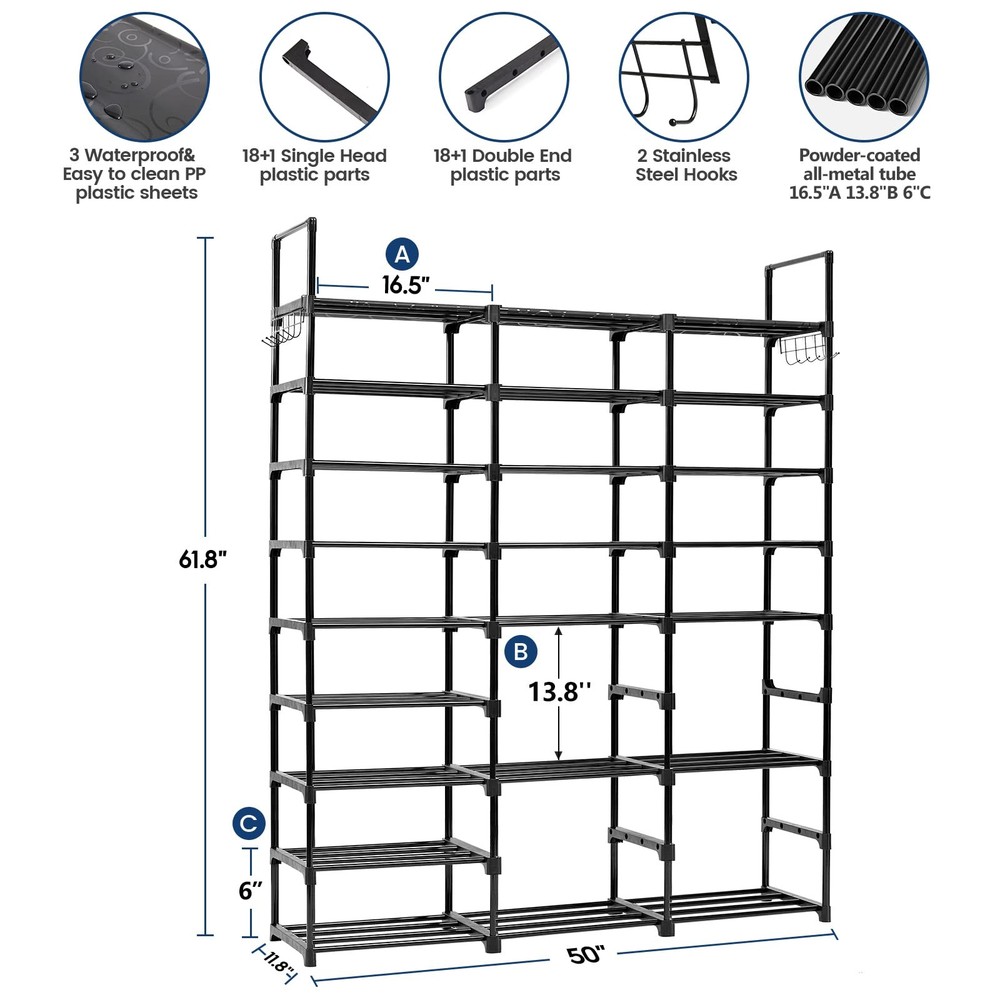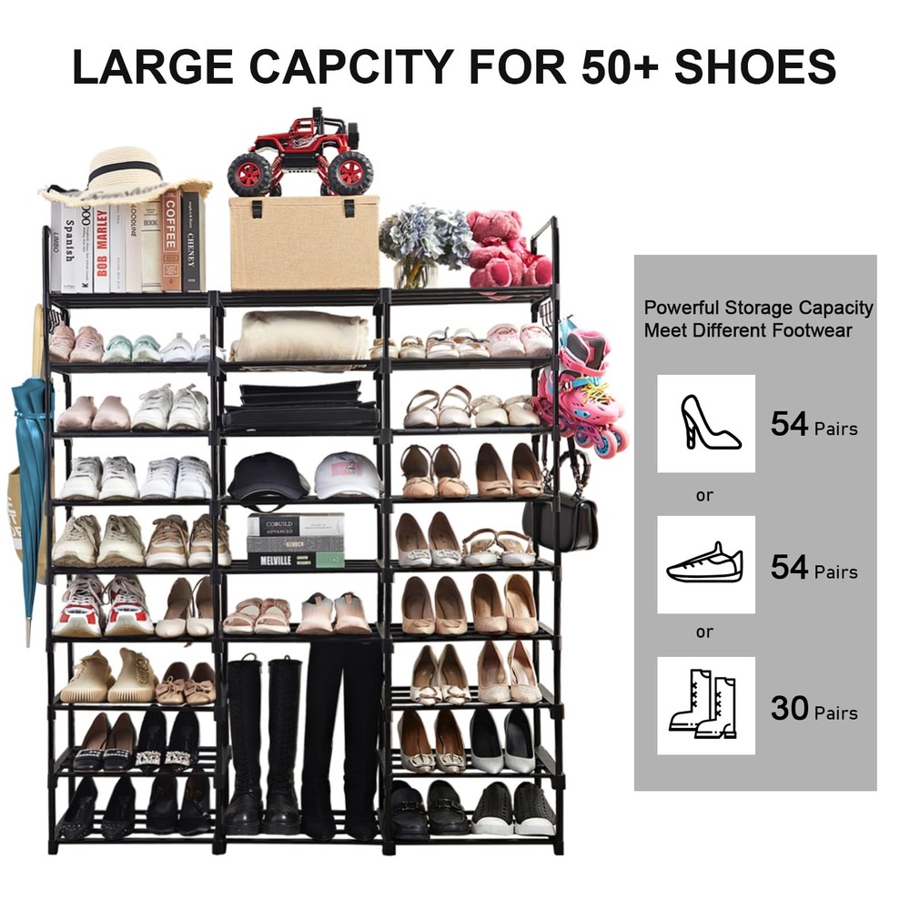 The 9 Tiers Metal Shoe Rack Organizer is an easy-to-assemble shoe storage solution that can be set up in different configurations. It features a 9-tier design with holes on the left and right of the middle tube that allows you to store different types of shoes. The shoe rack can hold up to 50-55 pairs of shoes, with shoe racks of different heights designed to fit boots, heels, shoe boxes, or other larger accessories. It is made of powder-coated metal tubes and high-quality plastic parts, making it both durable and sturdy. The shoe rack is also modular and can easily be split into two or more storage units. The shoe organizer comes with 10 multifunctional hooks to hang other items and three waterproof PP sheets that are easy to clean. Overall, it is a convenient and space-saving solution for a variety of settings such as the entryway, closet, garage, bedroom, or dorm room. ใ๐ฝ๐จ๐น๐ฐ๐ฌ๐ป๐ ๐ซ๐ฐ๐ใ:The Large Shoe Rack can be assembled into 8-layer, 7-layer or even two-layer shoe racks by DIY. There are holes on the left and right of the middle tube, which can be inserted and assembled at will to meet your needs for storing different types of shoes (sneakers, boots, high heels, etc.). Assemble your favorite look, create imagination, and decompress. ใ๐ณ๐จ๐น๐ฎ๐ฌ ๐ช๐จ๐ท๐จ๐ช๐ฐ๐ป๐ 9 ๐ป๐ฐ๐ฌ๐น ๐บ๐ฏ๐ถ๐ฌ ๐น๐จ๐ช๐ฒใ: The shoe rack organizer can hold 50-55 pairs of shoes, keeping your limited space organized. Shoe racks of different heights are designed to fit boots, heels, shoe boxes or other larger accessories. shoe organizers and storage for closet comes with 10 multifunctional hooks, you can hang a lot of things on it. And with 3 PP sheets, it is waterproof and easy to clean. What a convenient design. ใ๐ซ๐ผ๐น๐จ๐ฉ๐ณ๐ฌ & ๐บ๐ป๐ผ๐น๐ซ๐ ๐บ๐ป๐น๐ผ๐ช๐ป๐ผ๐น๐ฌใ:shoe rack large is made of powder-coated metal tubes and high quality plastic parts. Stable durable sturdy shoe tower shoe shelf. The diameter of metal tube is 13mm, which enables this shoe rack load much heavier duty and more durable while using. And the powder-coated finish does not rust or corrode with normal use, the shoe organizer shelf is perfect for your everyday organization. ใ๐บ๐ป๐ผ๐น๐ซ๐&๐ซ๐ผ๐น๐จ๐ฉ๐ณ๐ฌใ:49.50x12.00x60.30 inches, Garage shoe rack organizer Featuring a compact profile, you can easily set this shoe rack in the hallway, living room, bedroom,or garage. Setup takes only a few simple steps,all accessories are coded, and the location of each accessory is marked. Comes with user manual to help you assemble the shoe rack quickly and easily. If you have any questions about the install process of our shoe storage organizer, please contact us any time for free. ใ๐พ๐ฏ๐จ๐ป ๐๐ถ๐ผ ๐พ๐ฐ๐ณ๐ณ ๐ฎ๐ฌ๐ปใ: One shoe rack, wooden hammer, a user manual, our fan-favorite 12-month warranty and friendly customer service, everything will be better here.: )There are 92 16.5-inch long tubes (1 extra for spare), 2 10.6-inch medium tubes, and 68 6.7-inch short tubes (2 extra for spare). More infoemation, pls contact us on Amazon. ใ๐ฌ๐จ๐บ๐ ๐ป๐ถ ๐จ๐บ๐บ๐ฌ๐ด๐ฉ๐ณ๐ฌใ9 Tiers shoe rack is very easy to install, it can be installed easily without the help of other tools. You can DIY the shape you need according to your own family needs, and meet the needs of different scenarios, We have attached a user manual, Please read the manual carefully before installation and install it according to the manual steps. ใ๐ซ๐ฐ๐ฝ๐ฐ๐ซ๐จ๐ฉ๐ณ๐ฌ ๐บ๐ฏ๐ถ๐ฌ ๐น๐จ๐ช๐ฒใ: Keep your shoes well organized, meet your storage needs for shoes of different heights, easily store boots, high heels or slippers. DIY shoes racks, the shoe rack can split into two or more shoes storage, great solution to keep your entryway, closet, dormitory, garage... away from mess. ใ๐บ๐ป๐จ๐ช๐ฒ๐จ๐ฉ๐ณ๐ฌ & ๐จ๐ซ๐ฑ๐ผ๐บ๐ป๐จ๐ฉ๐ณ๐ฌใ- This wide shoe storage rack can split into one 5 tier small shoe rack and one 10 tier boot rack organizer.or you can also split it into two 5-tier long shoe racks.Now, DIY your shoe stand to fit your home! ใ๐ด๐ผ๐ณ๐ป๐ฐ๐ญ๐ผ๐ต๐ช๐ป๐ฐ๐ถ๐ต๐จ๐ณ ๐ถ๐น๐ฎ๐จ๐ต๐ฐ๐๐ฌ๐น ๐บ๐ฏ๐ฌ๐ณ๐ญใ- This stackable shoe rack is not only for shoes, It could be a organizer shelf for your toys, storage baskets,books, plants and more.This storage rack is a perfect choice for renters.