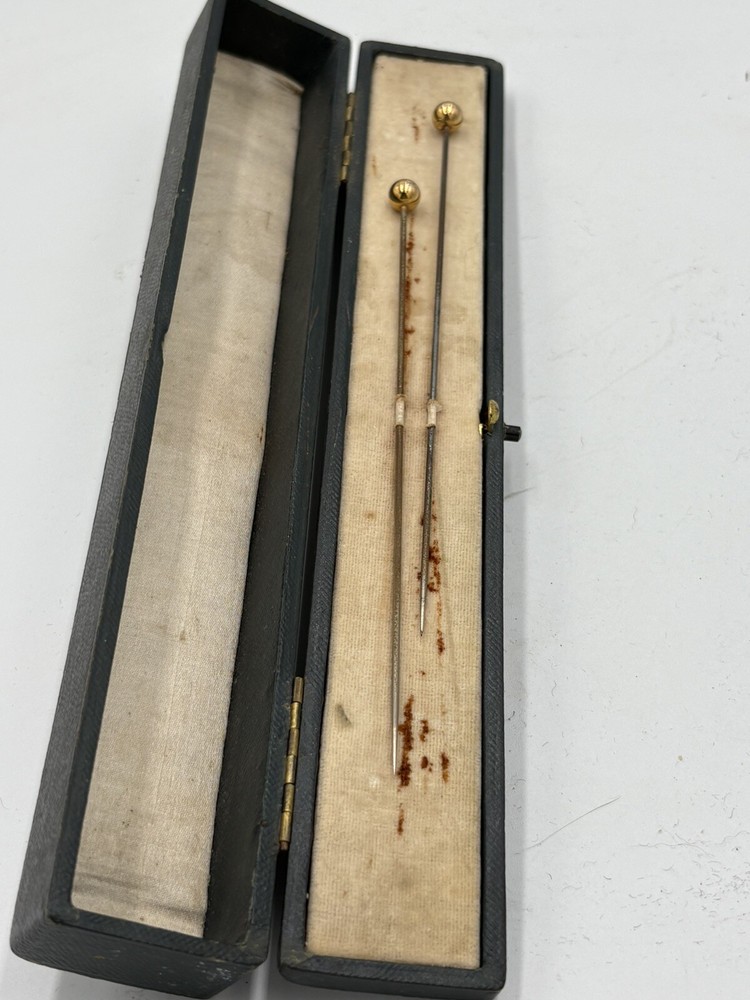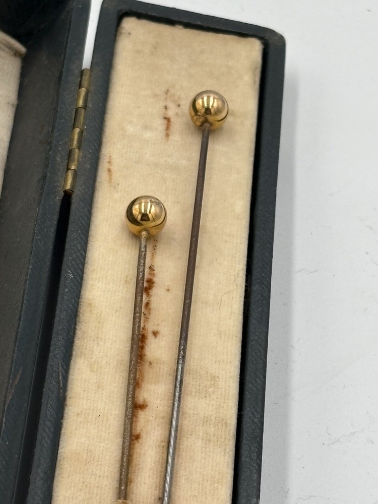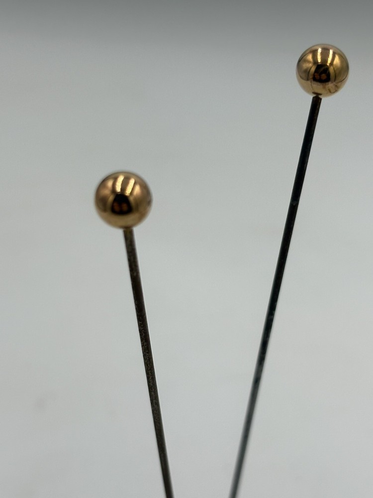 PAIR 9ct GOLD CASED HAT PINS. Gross weight 3G each. Ornament 0.7cm high. Total length 15.3cm. Pins a little rusted.