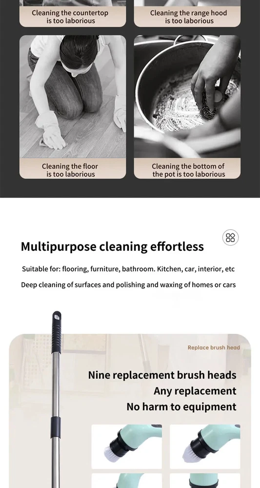 9 in 1 Electric Cleaning Brush Electric Spin Cleaning Scrubber Electric Cleaning Tools parlour Kitchen Bathroom Cleaning Gadgets Features: 1. With digital display: LED digital display, always pay attention to the battery level. 2. Powerful: Strong magnetic motor, high torque, non burning, high power. 3. Simple operation: Electric operation saves time and effort, freeing hands. 4. Humanized design: Scalable design, cleaning without bending down, making cleaning more convenient. 5. Multipurpose: Suitable for flooring, furniture, bathroom, kitchen, car, interior, etc. Specifications: Function: mopping/cleaning/washing dishes Product category: Cleaning brush Material: Plastic Package List: Electric cleaning brush * 1
