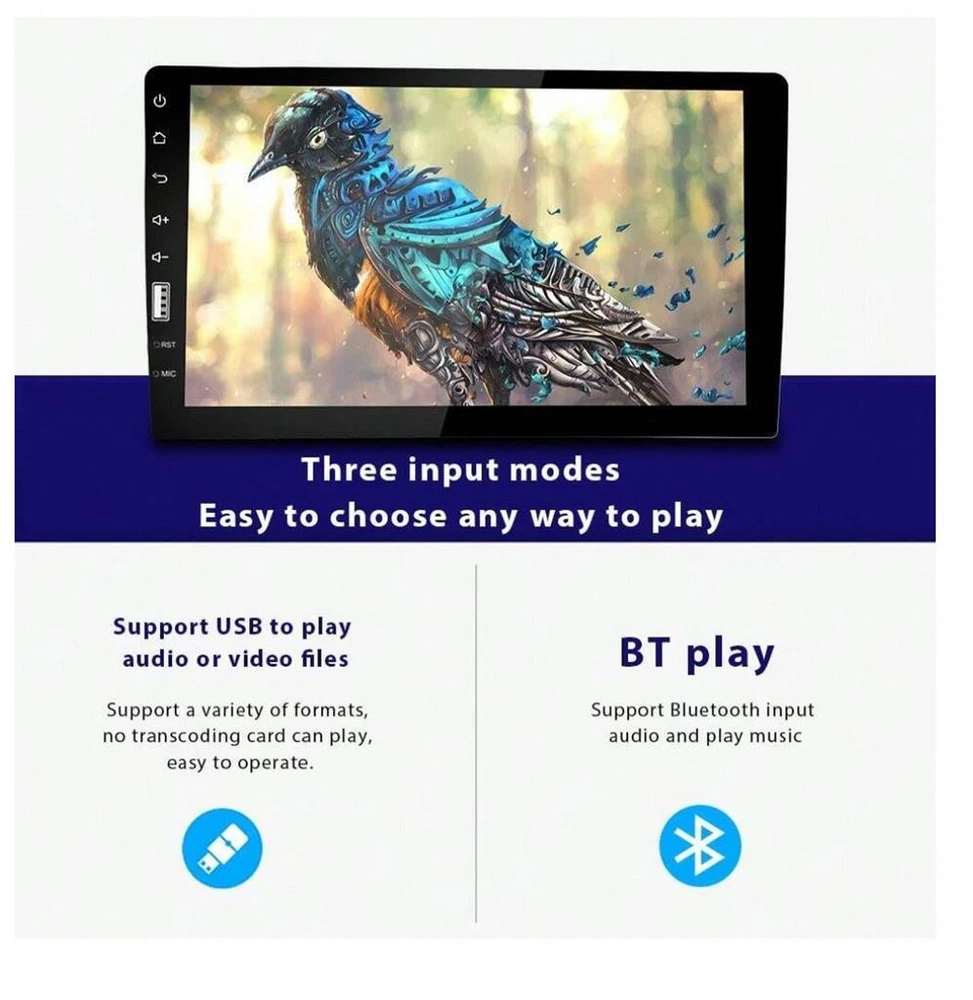 9inch Car Stereo Single Din Radio Touchscreen With Backup Camera 9inch Car Stereo Single Din Radio Touchscreen With Backup Camera Click images to enlarge Description Feature: 1.Upgraded Dual system mirror link:IOS/Android mirror link IOS one-way:IOS supports mobile phone one-way projection to the machine Android two-way:Android supports mobile phone two-way connection,just support Android phone 4.0-8.0 system 2.Seven color backlight: Support seven color backlight, you can choose seven color as a backlight 3.Bluetooth can work with most devices, connect the phone to keep your hands free when a call is coming, besides, you even save a sum of money to buy a business earphone 4.Steering wheel control: Quickly switch functions which you want with your car's steering wheel 5.USB function: Support USB(U disk)and USB charging, you can download the music or movies, which your favour, play on this unit 6.FM Radio: Online music you can transfer the music to the car stereo by FM to enjoy the original car stereo sound,with 18 preset stations 7.This input automatically powers the rear camera when the vehicle shifts into reverse and displays the image on the unit's screen. Rear camera sold separately 8.Support Rear Microphone Input specifics: System:WINCE Voltage:12 V Screen Resolution:800*480 Maximum Power output:4*45W Mirror Link:Support Android/ Iphone Mirror Link GPS:Not support WIFI:Not support AM: Not support Button background color:Colorful lights Audio: MP3/AAC/OGG/FLAC/APE Video: AVI/3GP/MP4/MOV/MPG/MKV/VOB/RMVB/RM OSD Language:English, Spanish, Portuguese, Russian, Italian, German, French, Polish, Turkish, Greek, Arabic, Czech Package Included: 1 x Car MP5 Player 1 x Power Cable 1 x Speaker Cable 1 x External Microphone 1 x Instruction manual ... More Color: Black Power Supply: None Type: Car Multimedia Player, Car MP5 Player Display Size: 9 Inch Touch Type: Capacitive Touch Screen System: Other ROM Memory Size: None RAM: None Track Page Views With Auctiva's Counter Images sell! Get Supersized Images & Free Image Hosting Get Auctiva's Listing Templates on your items with a few clicks.