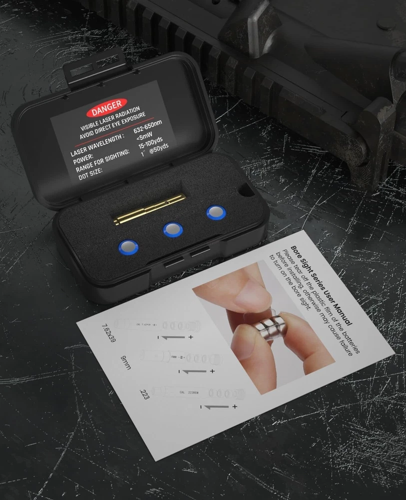 Bore Sighting Laser .223 5.56mm/9mm Red Dot Laser Boresighter for Handgun Pistol with Tail Switch Included About this item : Precise Targeting: 9 mm Laser Bore sighter offers a upgrade red dot laser zeroing and targeting system, Improved aiming accuracy and ensuring quickly zero, Reduce Cartridges and Shells Wasted Creative Design: 9 mm Bore Sight laser for Pistol features the unique design button switch technology on the market, press of the Tail button switch activates the bore laser, multiple use without disassembly, solve the problem of battery loss Upgraded Batteries: 3 sets (9 in total) of upgraded batteries each last up to 58 minutes. 31% longer service life than others. Combined with the power saving button switch design Quality Throughout: The red 9 mm laser bore sight for handgun features Rugged curved brass construction, providing excellent deformation resistance and pressure cushioning ability, Maintains Aiming accuracy without wobbles that can cause large deviations Class IIIA Laser: The Pistol bore sighting ar accessories use a safe and reliable Class IIIA red laser with an output power of < 5 mW and a wavelength of 632-650 nm. It allows accurate targeting within a range of 15 to 100 yards