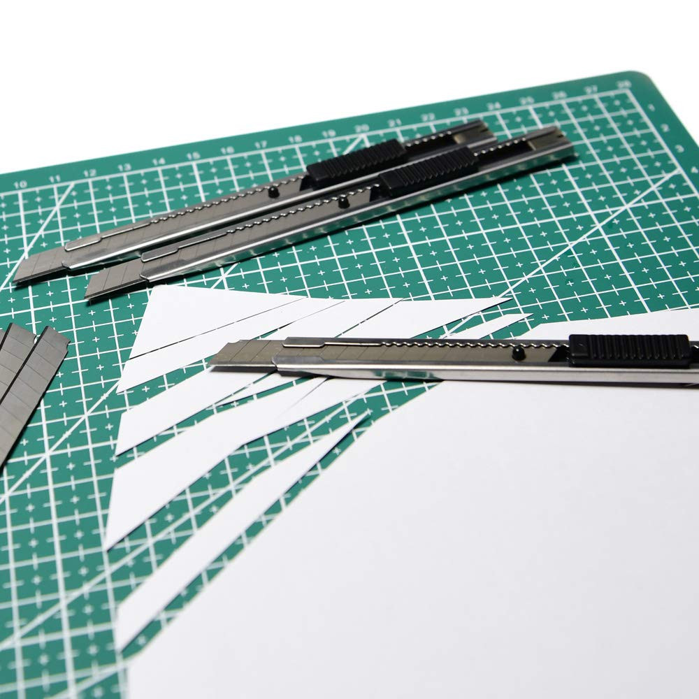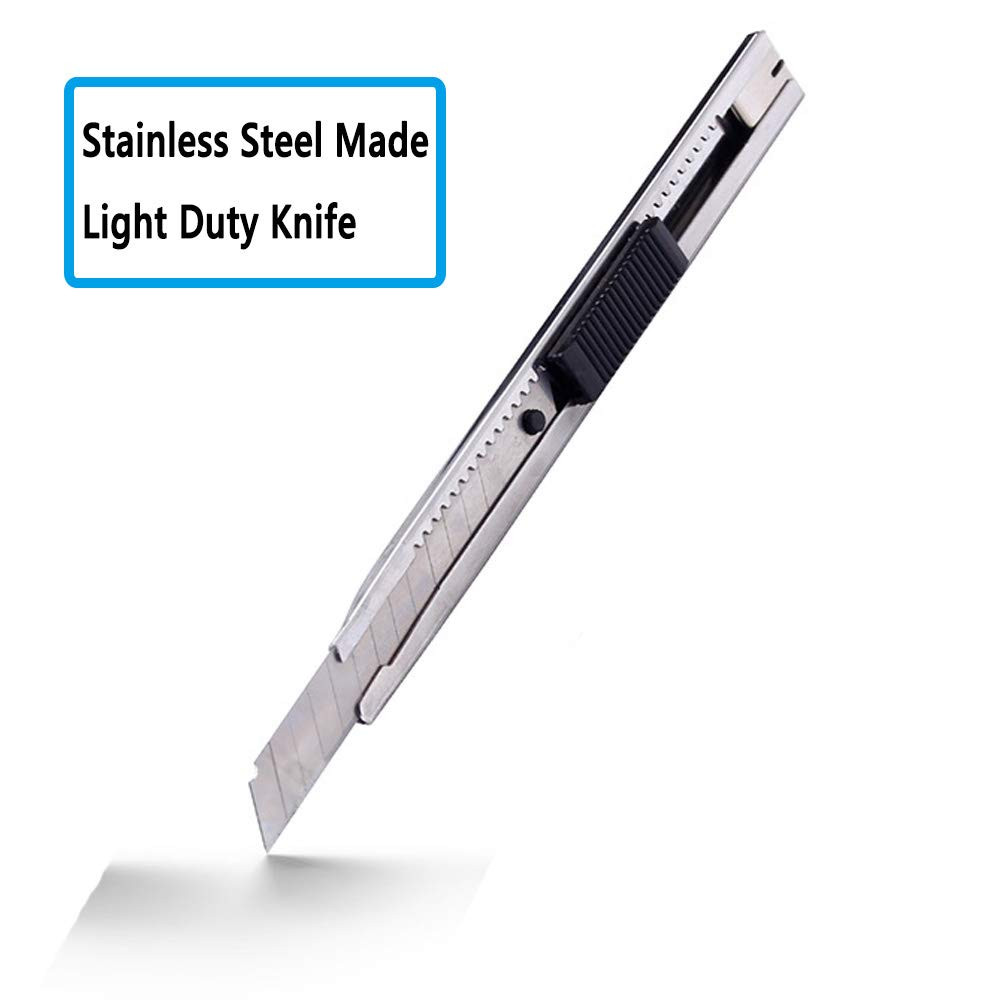 【Value retractable razor knife set】comes with 5 pcs excellent 9mm utility knife, extra 10 pcs carbon steel snap off blades well packed in a plastic box 【Sharp snap off blade】auto lock knife with 9mm wide sharp blade, made of high grade steel, sharp to use; sharp angle blade enable your cutter razor blade always sharp 【Easy to change】easy to change the blade within seconds, simple and flexible to use. Ideally utility knife set for cutting your paper,foam,vinyl,wallpaper,or opening the Amazon packages 【Stable to use】with auto-lock design,stable to use the cutters.small pocket clips,convenient to carry around,fits into your tool-case,pocket,belt pouch, tool kit, shirt pocket 【Wide application】ideal for basic cutting tasks,great for wallpaper,vinyl,foam,cardboard ,craft hobbyists and artists, office, home ,warehouse,usage