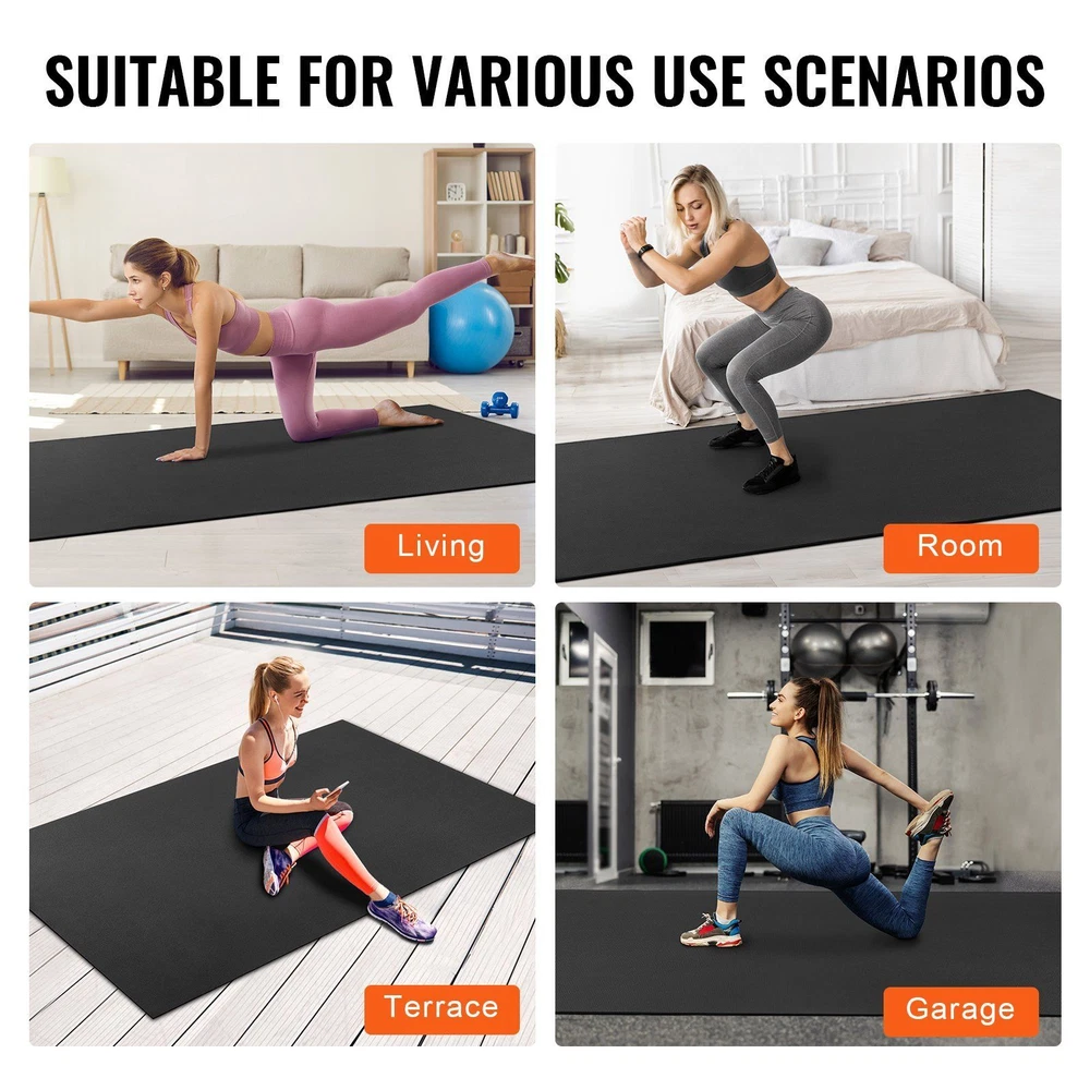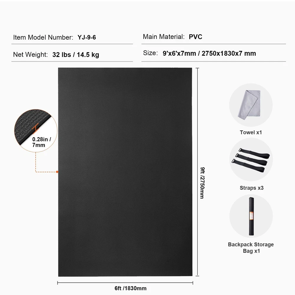 Features: Professional Home Gym: The exercise mat features a large 9x6ft design, suitable for 2-3 people. Simply unroll and spread out the mat to turn any room in your home into a professional home gym. You can perform yoga, HIIT, aerobics, dance workouts, including P90x, Insanity, T25, Zumba, TRX, kettlebell exercises, jump rope, and various other exercises. Anti-slip and Durable: The exercise yoga mat is made from high-density PVC material weighing 2800g/m². Its surface is anti-slip and wear-resistant, ensuring it remains intact even after prolonged use. The dense circular texture on the bottom provides extraordinary grip stability, preventing the mat from slipping and helping you avoid falls during workouts. Protects Your Floor and Joints: The 0.28"/7mm thick exercise mat effectively protects your carpet or hardwood floors from scratches. The high-density thick mat offers excellent cushioning, combining support and softness to protect your joints from injury during exercise. Easy to Clean and Store: The thick yoga mat includes a soft, highly absorbent fiber towel, a storage bag, and 3 straps. After each use, it is easy to clean and wipe down the mat, roll it up for storage, and transport it conveniently. Suitable for Various Uses: Our fitness & exercise mat is suitable for all floor types, including carpets, tiles, or wooden floors in living rooms or bedrooms, as well as concrete floors in garages, patios, or basements. It can be used as a play mat, floor mat, equipment mat, or exercise mat. Exercise Mat: Create Your Professional Home Gym! The exercise yoga mat features a large design, transforming your room into a professional gym in seconds, suitable for all kinds of high-intensity workouts. Crafted from high-density PVC material, the fitness & exercise mat is anti-slip, wear-resistant, and highly tear-resistant, significantly extending its lifespan. The thick mat offers excellent cushioning, soft and easy to rebound, protecting your body joints from injury. Comes with fiber towel, carrying strap and storage bag, making our exercise mat easy to clean, portable, and easy to store. Not only can this premium yoga mat be used as an exercise mat, but also as a play mat, equipment mat, and more.
