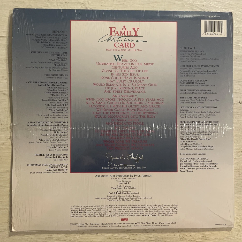 Celebrate the holiday season with the charming tunes of "A Family Christmas Card From The Church On The Way" on this limited edition LP. Released by Word Records, the album features a variety of artists coming together to create a festive and heartfelt musical experience. With its original cover intact and shrink wrap still on, this vinyl record is a treasure for any collector or fan of holiday music. Crafted in the United States, the record is a 12" LP played at 33RPM, perfect for stereo sound enthusiasts. It's graded as Near Mint (NM or M-) both for the record and its sleeve, ensuring a top-quality listening experience. This first edition, first pressing is an essential piece for those who appreciate the holiday genre and the nostalgia of vintage vinyl.