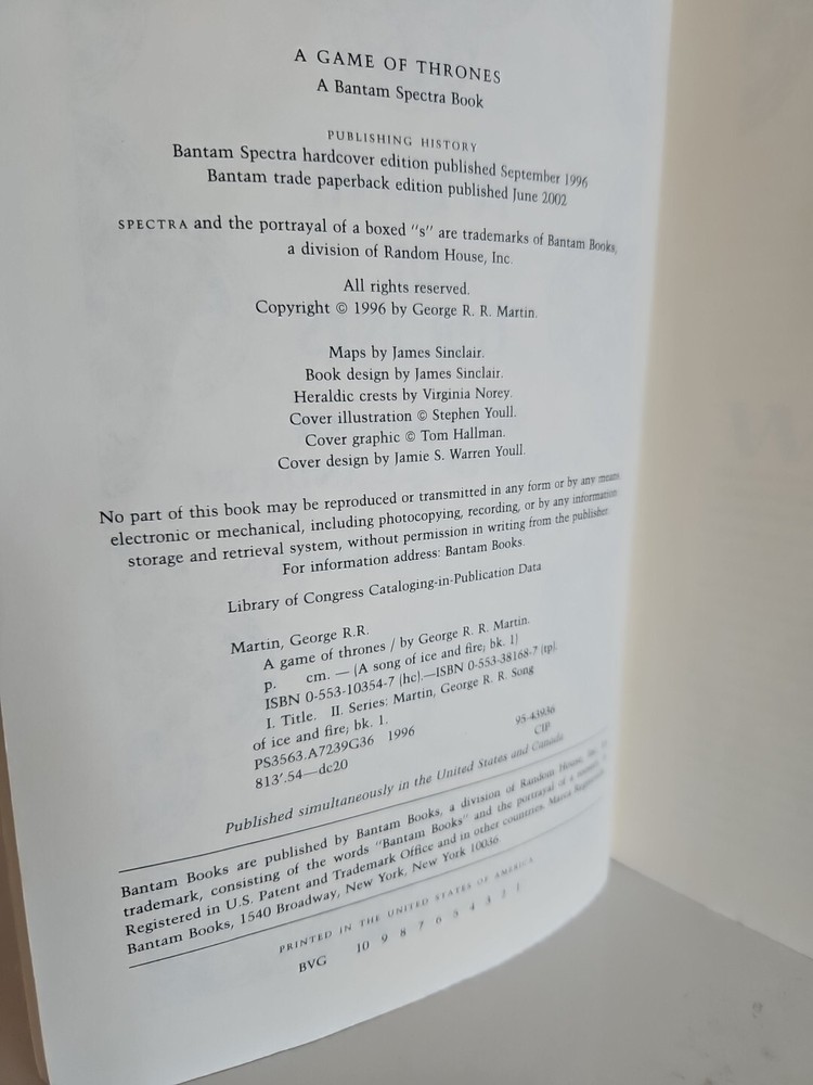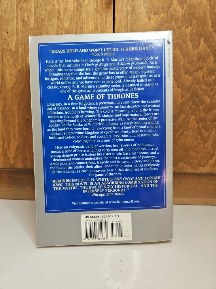 Immerse yourself in the world of Westeros with this rare and coveted A Game of Thrones 1st Edition Trade Paperback 1st Printing. This book, written by the legendary George R.R. Martin, is a must-have for any fan of the fantasy genre. The softcover, wraps binding adds to the unique aesthetic of this collectible item, while the English language and Bantam Books publisher make it accessible to a wide audience. This book is perfect for any collector or enthusiast of the fantasy genre, and its special attributes as a 1st Edition make it a true gem. Don't miss your chance to own a piece of literary history with this A Game of Thrones 1st Edition Trade Paperback 1st Printing.