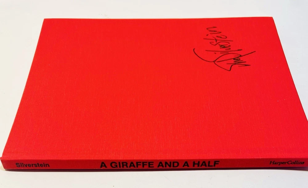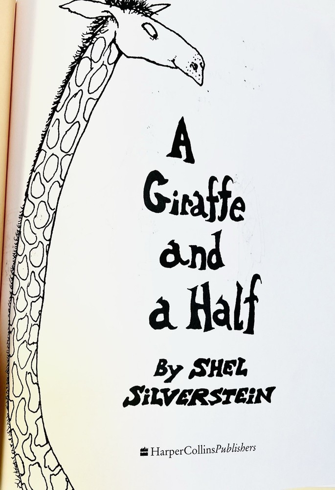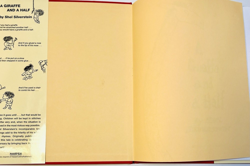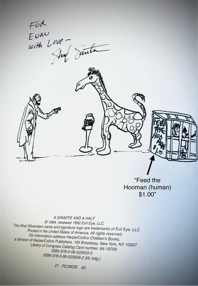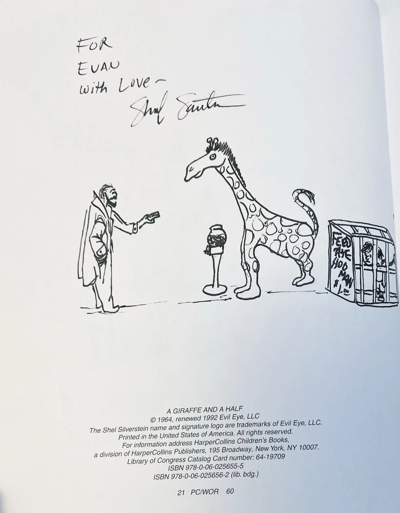 This product is a 1992 hardcover edition of "A Giraffe and a Half" by Shel Silverstein, signed by the author with a sketch. Published by HarperCollins Publishers LLC in New York, NY, this children's book features poetry by Shel Silverstein and is illustrated by the author. The special attributes of this collectible book include a dust jacket and being inscribed by the author. It is a unique and special piece for any Shel Silverstein fan or collector of children's literature. This has a unique sketch done by Uncle Shelby depicting what almost looks like Shel himself in a large trench coat with an outstretched arm holding a $1 bill. On the opposite side , you can see a small giraffe next to a coin operated gum ball type feeder, and a small boy in a cage with a chain around his neck. The cage has a sign that reads, “Feed the hooman $1.00” in scribbled text, as if the giraffe wrote it. There is also an inscription that reads, “To EVAN, with Love ~ Shel Silverstein.”