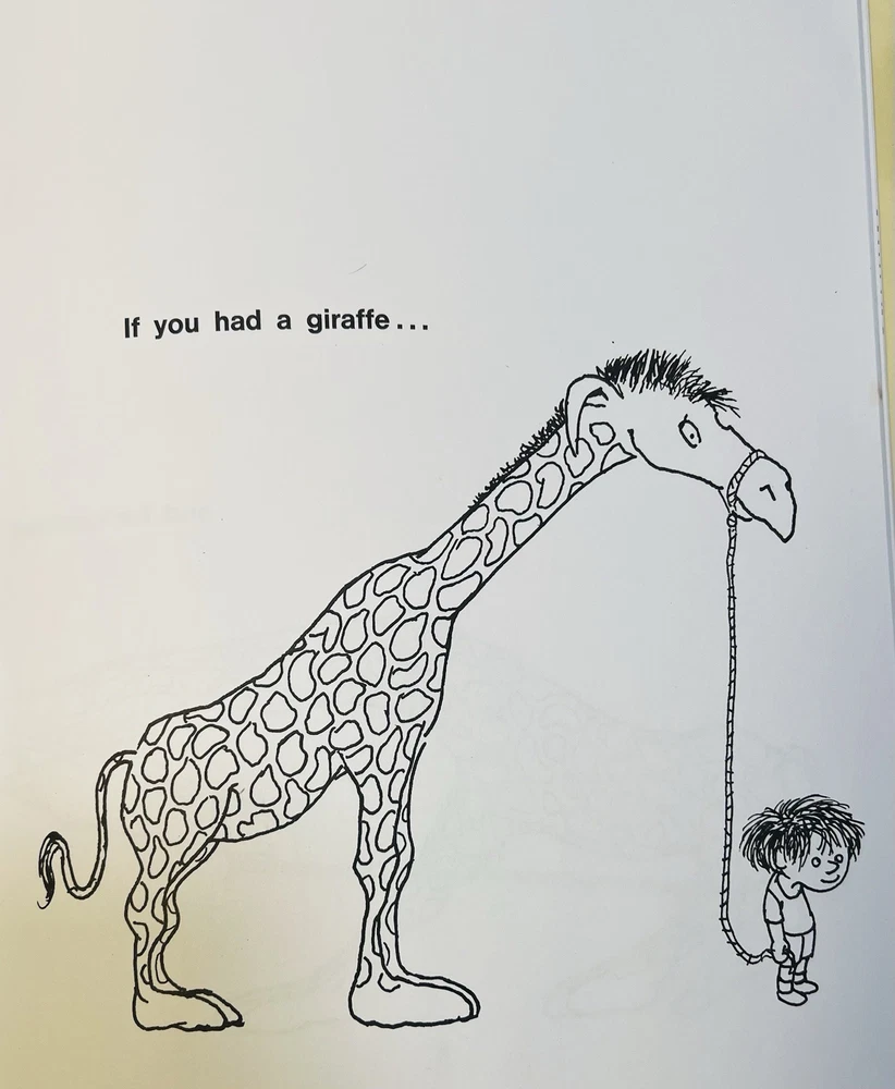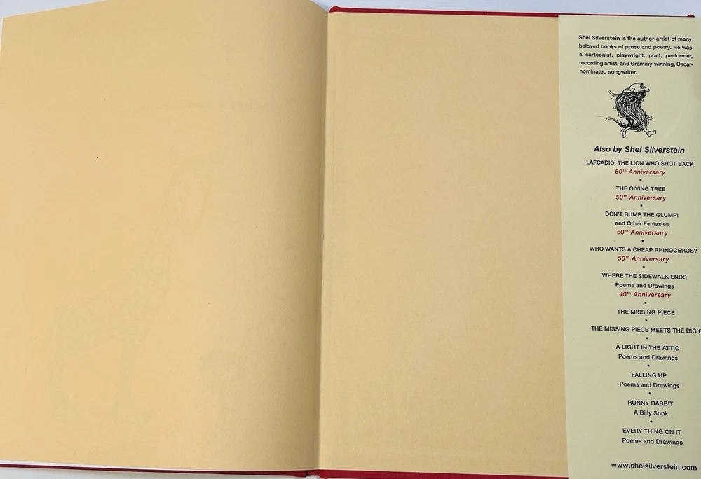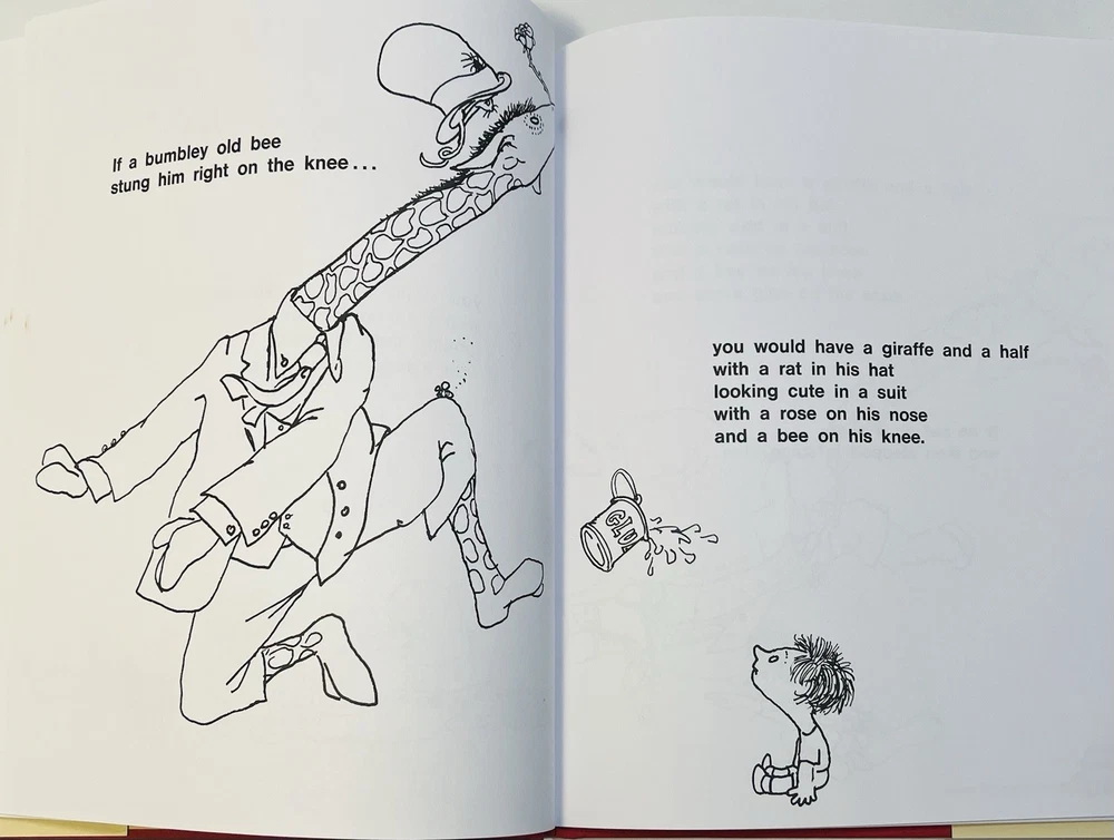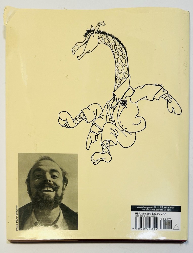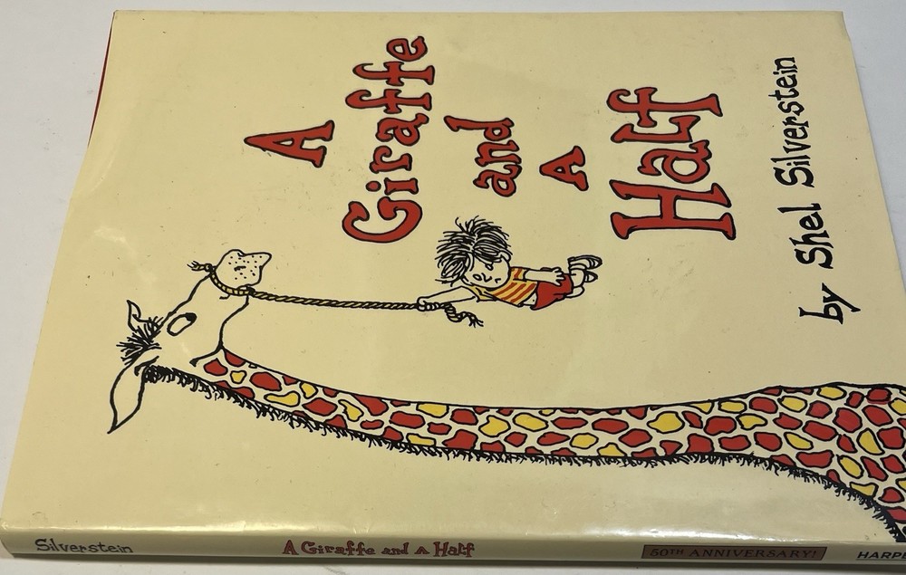 This product is a 1992 hardcover edition of "A Giraffe and a Half" by Shel Silverstein, signed by the author with a sketch. Published by HarperCollins Publishers LLC in New York, NY, this children's book features poetry by Shel Silverstein and is illustrated by the author. The special attributes of this collectible book include a dust jacket and being inscribed by the author. It is a unique and special piece for any Shel Silverstein fan or collector of children's literature. This has a unique sketch done by Uncle Shelby depicting what almost looks like Shel himself in a large trench coat with an outstretched arm holding a $1 bill. On the opposite side , you can see a small giraffe next to a coin operated gum ball type feeder, and a small boy in a cage with a chain around his neck. The cage has a sign that reads, “Feed the hooman $1.00” in scribbled text, as if the giraffe wrote it. There is also an inscription that reads, “To EVAN, with Love ~ Shel Silverstein.”
