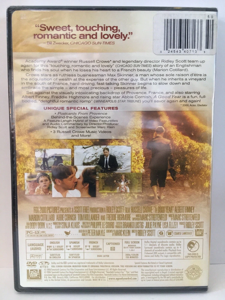 Experience the charming and heartwarming story of "A Good Year" starring Russell Crowe, Marion Cotillard, and Albert Finney. Directed and produced by Ridley Scott, this drama is a must-see for any movie lover. With a PG-13 rating, this movie is suitable for a wide range of audiences. This Full Screen Edition DVD comes in a tall/DVD case and NTSC video format. The language options include English, French, and Spanish, with subtitles available in English and Spanish. The bonus features of this brand new, factory-sealed DVD include three Russell Crowe music videos and a full-length behind-the-scenes experience by Ridley Scott and screenwriter Marc Klein. Get your hands on this DVD and immerse yourself in the beautiful vineyards of Provence in the south of France. 3)