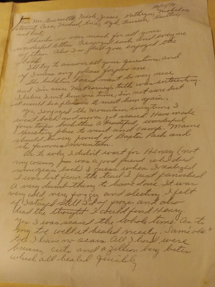 This is a unique collectible item that features a letter from Donn Fendler to Bill Guerette and Class on December 11, 1990. The item is perfect for those who are interested in correspondence and wants to add a piece of history to their collection. The letter is written in English and is a great addition to any paper collection. The item has been well-preserved and is in excellent shape. It is perfect for display or for reference purposes. Get your hands on this rare item today and add it to your collection! The letter has been authenticated by a Notary Public in Newport Maine on March 10 2019.