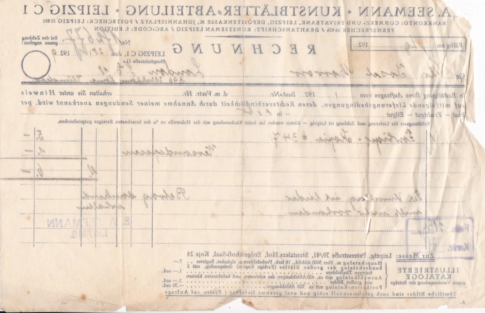 A. SEEMAN* KUNSTBLATTER*ABTEILUNG* LEIPZIG 1929 A Private Bank Receipt Ref 46604