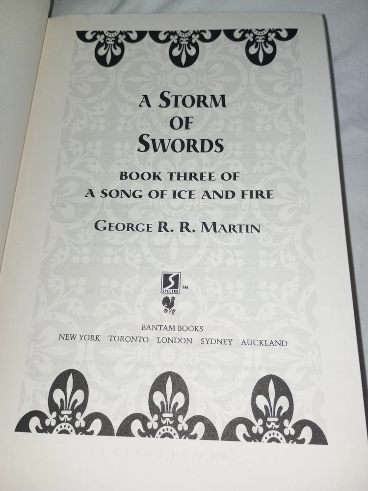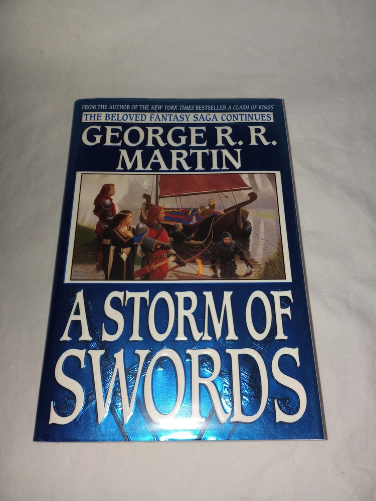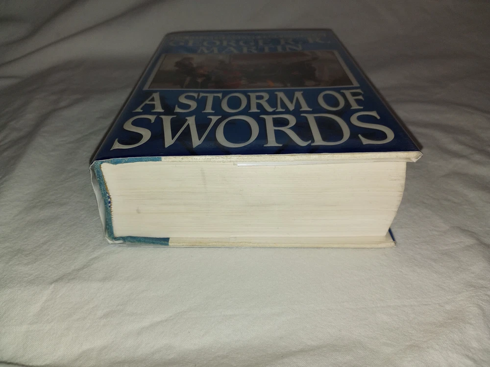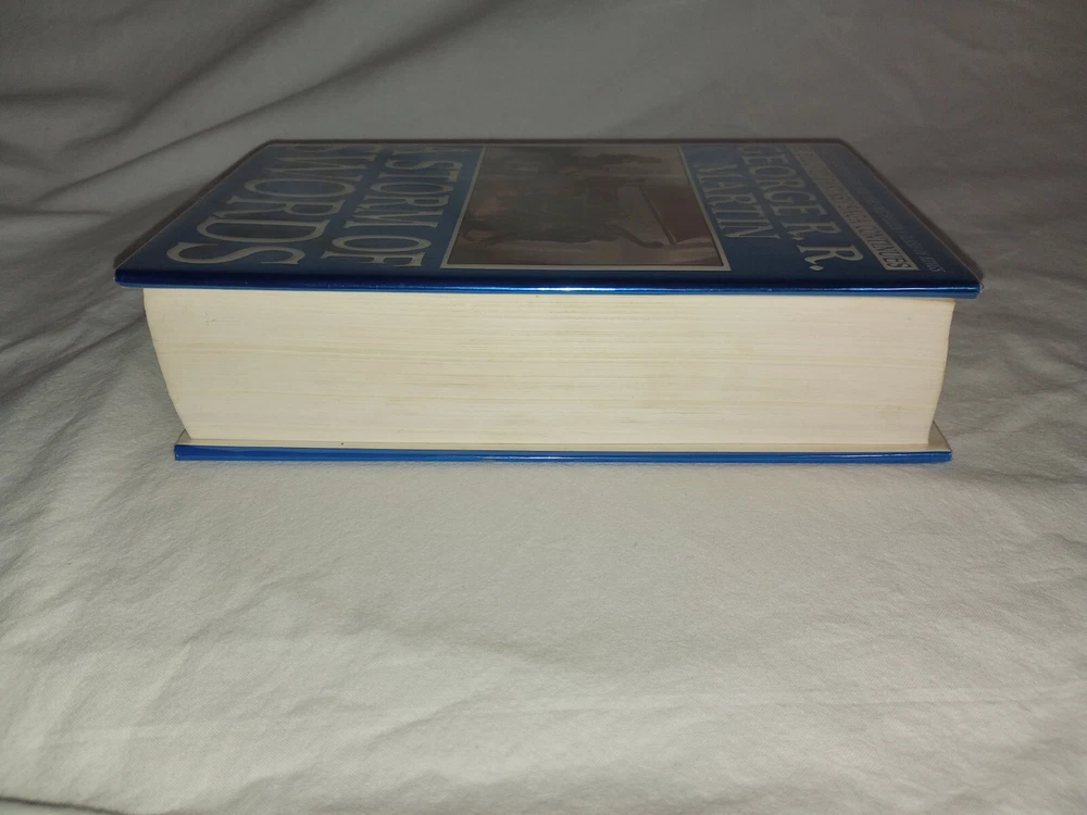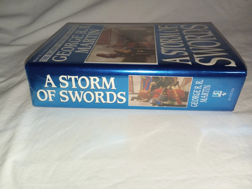Publisher:Random House Publishing GroupIllustrator:Yesgtin13:9780553106633Seller Notes:“There is a slight bit of pink coloring on the top of the book's paper. (picture 7)”Book Title:Storm of SwordsAuthor:George R.R. MartinOriginal Language:EnglishEra:2000sISBN:9780553106633Type:NovelItem Length:9.5 inEdition:First EditionFormat:HardcoverLanguage:EnglishItem Height:2.2 inGenre:FictionBook Series:A Song of Ice and Fire Ser.Item Weight:49.5 OzTopic:Science Fiction / Action & Adventure, Action & Adventure, Fantasy / EpicNumber of Pages:992 PagesItem Width:6.2 inPublication Year:2000
