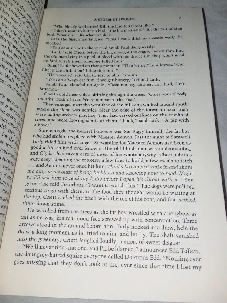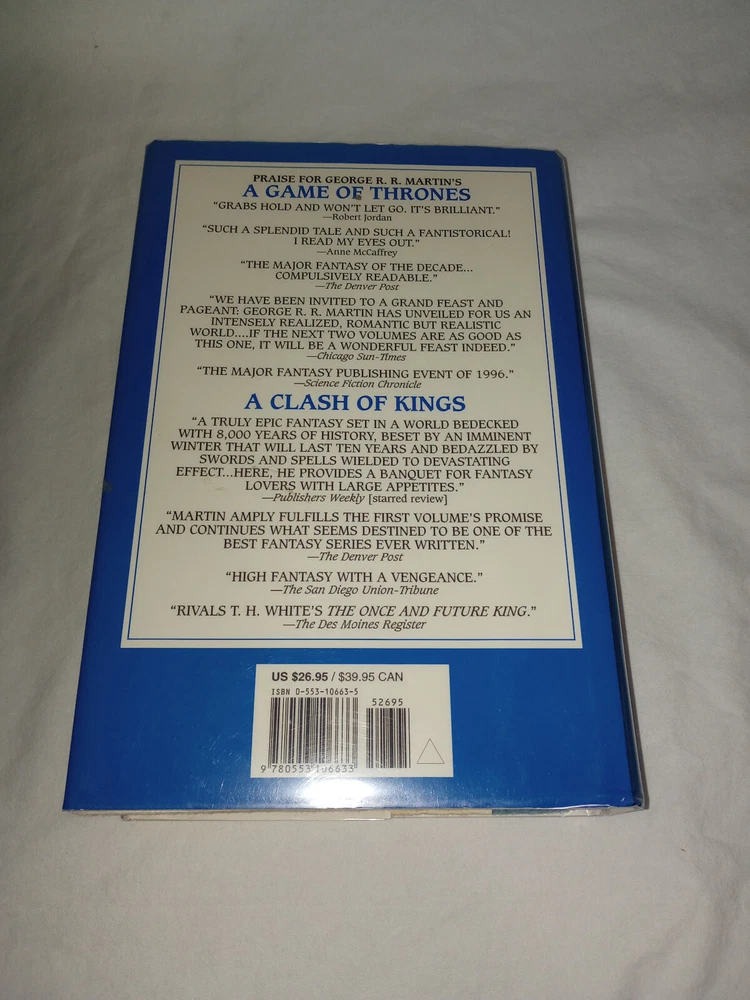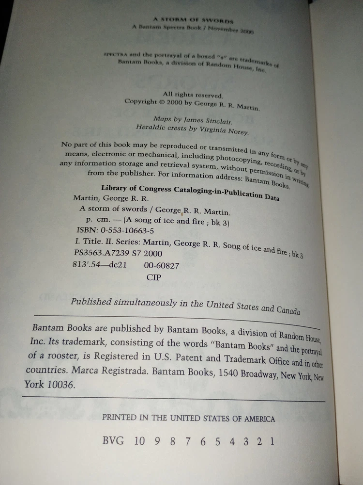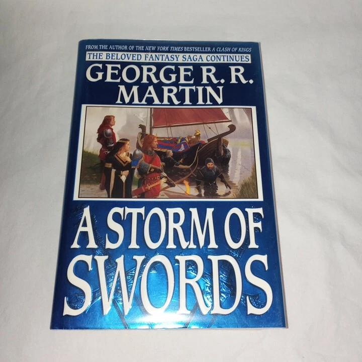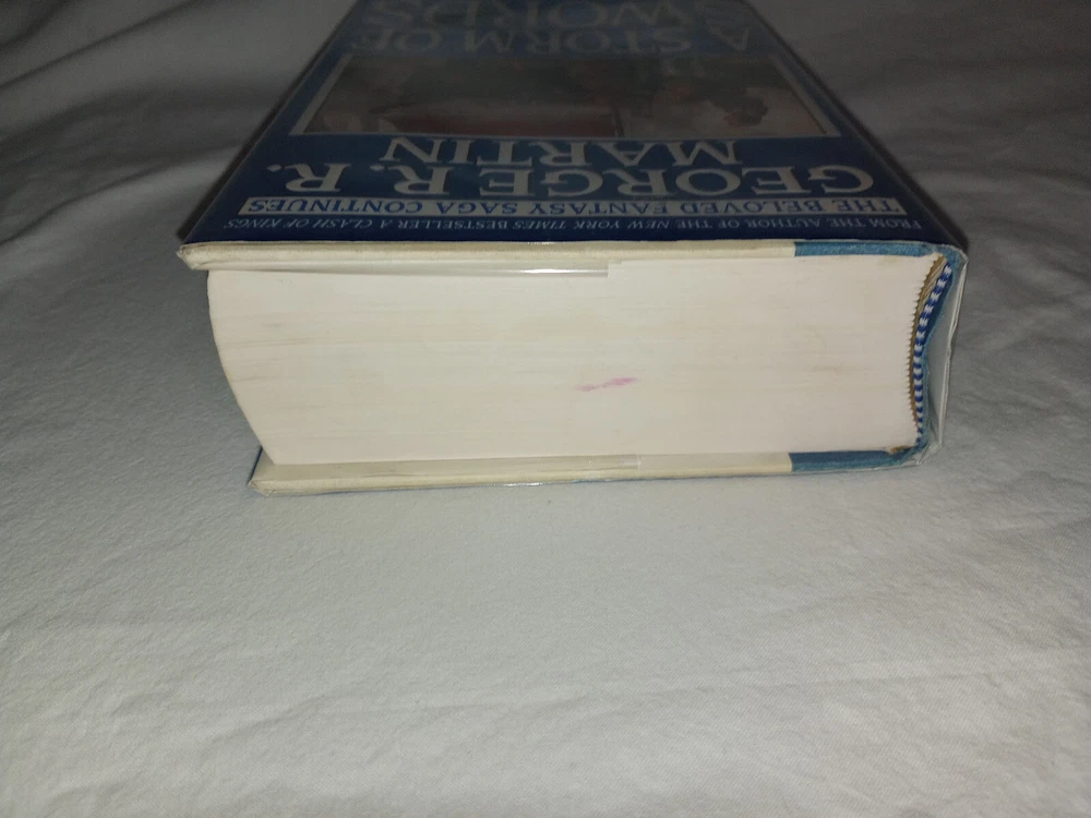 Publisher:Random House Publishing GroupIllustrator:Yesgtin13:9780553106633Seller Notes:“There is a slight bit of pink coloring on the top of the book's paper. (picture 7)”Book Title:Storm of SwordsAuthor:George R.R. MartinOriginal Language:EnglishEra:2000sISBN:9780553106633Type:NovelItem Length:9.5 inEdition:First EditionFormat:HardcoverLanguage:EnglishItem Height:2.2 inGenre:FictionBook Series:A Song of Ice and Fire Ser.Item Weight:49.5 OzTopic:Science Fiction / Action & Adventure, Action & Adventure, Fantasy / EpicNumber of Pages:992 PagesItem Width:6.2 inPublication Year:2000