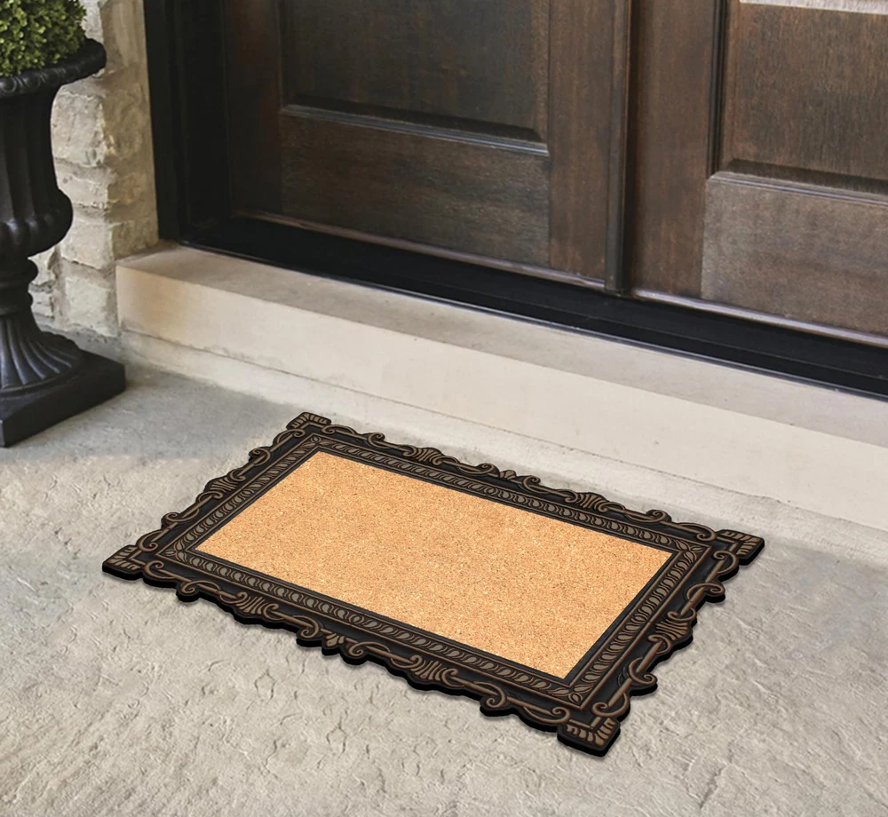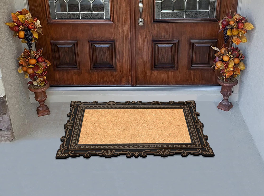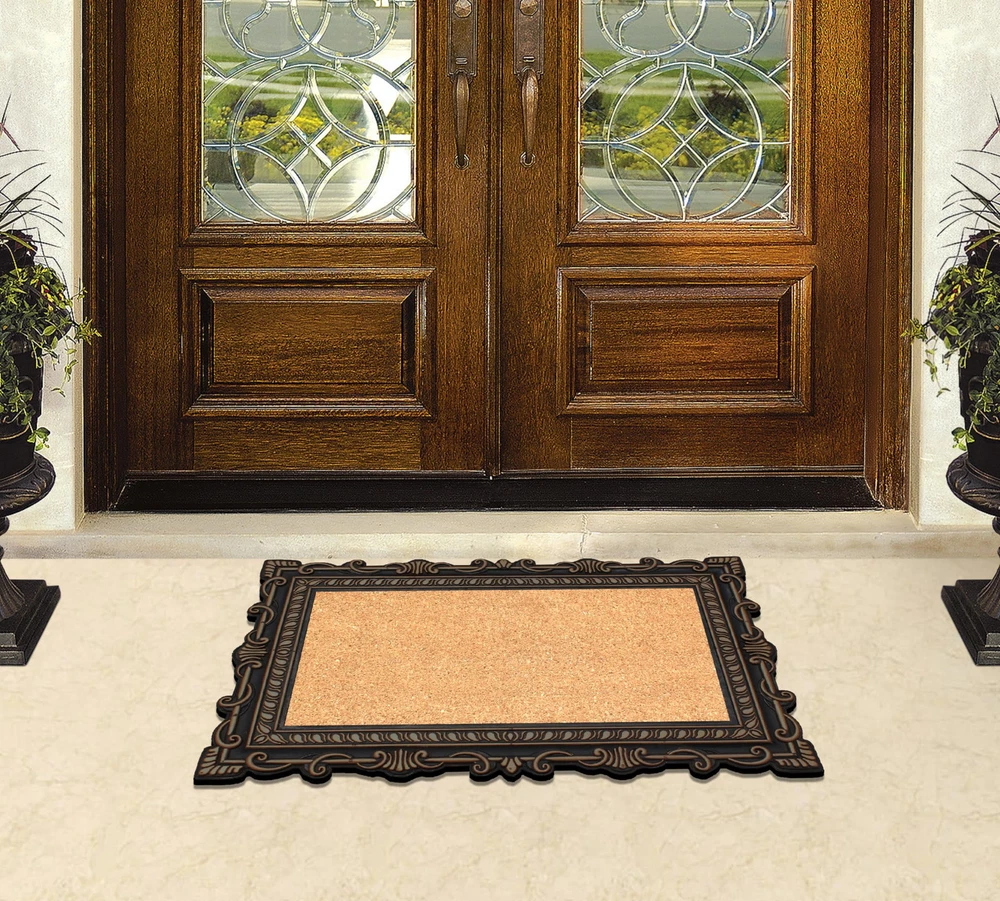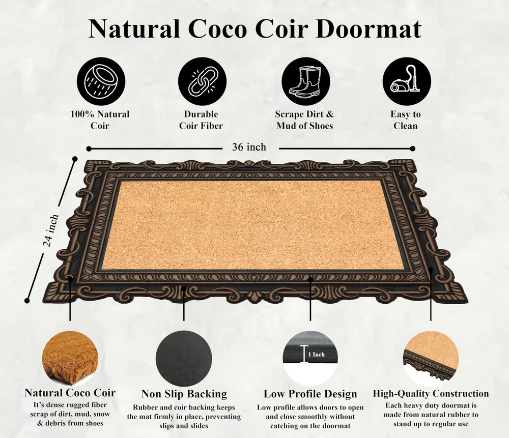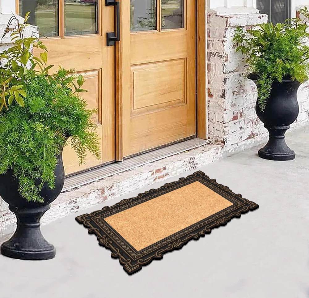 More than a decorative enhancement this rubber and coir molded doormat is made with a heavy rubber backing that anchors it in place while you brush dirt and debris from shoes and boots. The tufted coco-fiber facilitates scrubbing soles clean. NEWLY DEVELOPED RUBBER AND COIR MOLDED DOOR MAT: This is a completely newly designed door mat, suitable for both single and double doors. The large size door mat is made of Natural coir fiber and high quality rubber. This coir door mat has a large coir area to clean and wipe your shoes which keeps your house clean. Molded door mats are stronger and more durable lasting thrice as long as regular door mats. Each outdoor rug is QC inspected for 20 quality check points. HEAVY-WEIGHT MOLDED RUBBER BORDER DOOR MAT: The heavy rubber backing makes sure the doormat in anchored to its place and does not get blown away by wind or tear apart by aggressive wiping. SUPER TOUGH DOOR MAT: Constructed with thick coir bristles on the topside molded with rubber base, the doormat is built tough by nature; its strong bristles create a wiping area and the rubber base adds to the sturdiness. This premium outdoor rug will help stop dirt, debris, moisture and other particles from being tracked into your home and will last at least 3 times longer than regular door mats. PLACE WELCOME MAT BEFORE EVERY EXTERIOR DOOR: Use this welcome mat on a patio, in a garage, laundry room, entryway, and anywhere there is high traffic from outside. Recommended to be used in covered outdoor areas. PERFECT SIZE DOORMAT FOR YOUR LARGE ENTRYWAY: Front doormat measures 24" x 36" and is 0.6" thick to allow your door to easily pass over the mat without getting stuck. This outdoor mat is ideal for both single and double door entrances.