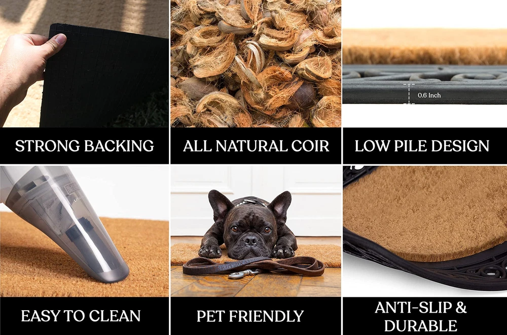Like all of our door mats, our Monogrammed Coco Door Mat is as durable as it is beautiful. Handmade from 100% coir, an all-natural material known for its scrubbing power and resistance to the elements. Dyes saturate the fibers for vibrant color. Specify you single-letter monogram for the perfect finishing touch, or enjoy the classic border motif alone NEWLY DEVELOPED RUBBER AND COIR MONOGRAMMED DOOR MAT : This is a completely newly designed door mat, suitable for both single and double doors. The large size monogrammed door mat is made of Natural Coir fiber and high quality rubber. This coir door mat has a large coir area to clean and wipe your shoes which keeps your house clean. Molded door mats are stronger and more durable lasting thrice as long as regular door mats. Each outdoor rug is QC inspected for 20 quality check points. NATURAL COIR PILE MONOGRAMMED FRONT DOOR MAT: This Door mat is made from 100% natural coir fibers which are of the strongest fibers and they naturally trap dust and other particles. The biodegradable coir fiber material is environmentally friendly and compostable. HEAVY DOOR MAT WITH RUBBER BACKING: This Doormat is heavy weight with a solid rubber backing. This door mat doesn’t get easily blown away by wind and anchors to the ground to prevent slipping. ATTRACTIVE DESIGN AND ANTI SHED TREATED FRONT DOOR MAT: This is a personalized designed door mat and every door mat is Hand monogrammed individually in the USA. The coir portion of this door mat is treated with Anti Shed dyes to minimize shedding. The rubber molded doormat easily lasts 3 times longer than usual doormats since the rubber adds to the durability making it suitable for high traffic areas. LOW MAINTENANCE OUTDOOR MAT: Coconut coir is naturally resistant to unwanted substance, making this the most low-maintenance door mat possible.