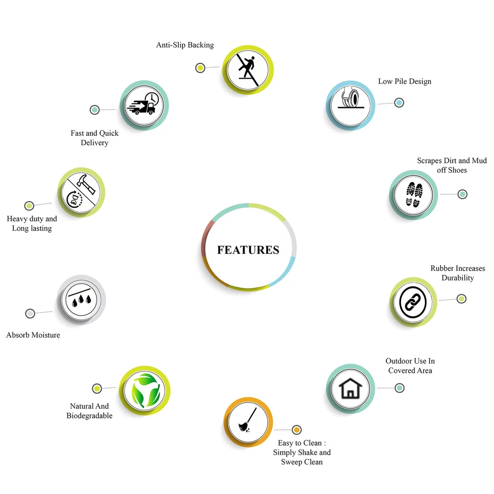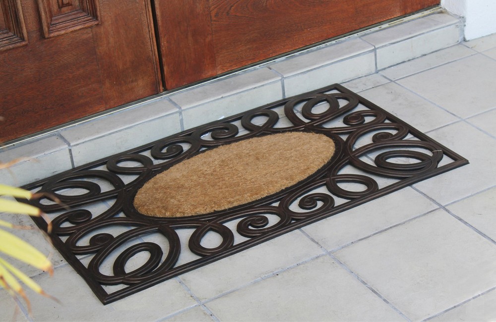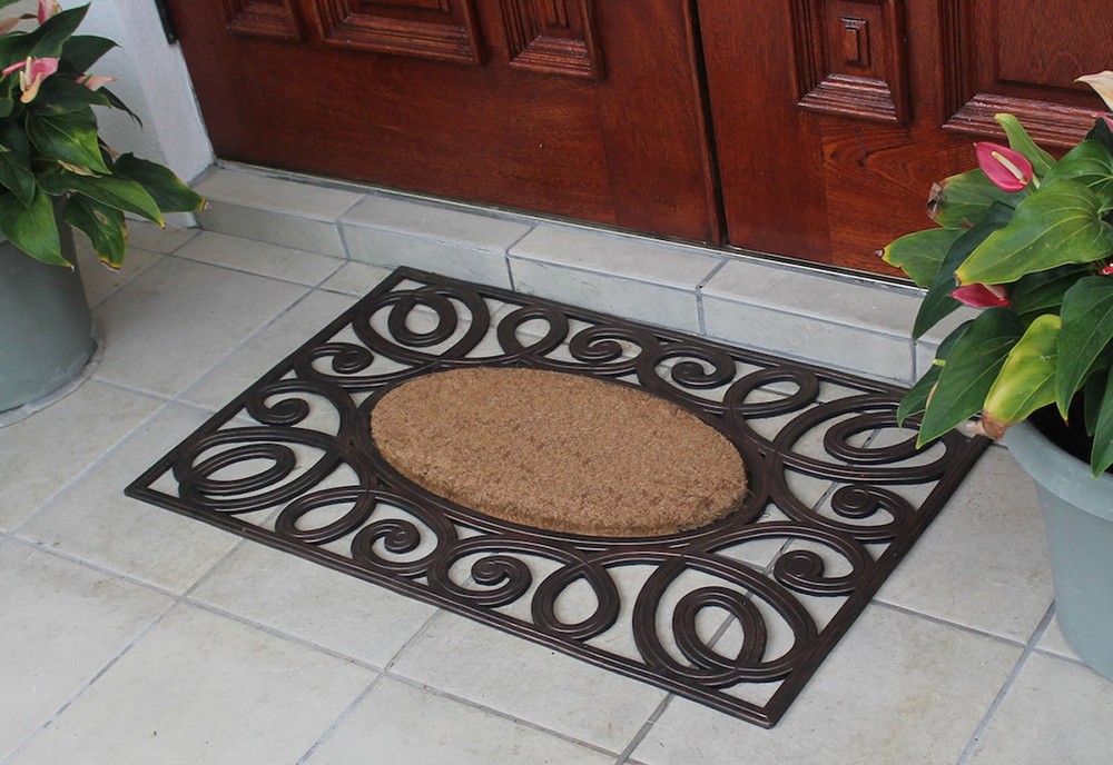 More than a decorative enhancement this rubber and coir molded doormat is made with a heavy rubber backing that anchors it in place while you brush dirt and debris from shoes and boots. The tufted coco-fiber facilitates scrubbing soles clean. 100% COCONUT COIR FIBER - Natural fiber face provides the perfect surface for guests to wipe their shoes before entering your home. HEAVY-WEIGHT MOLDED RUBBER BORDER firmly anchors the mat in place. PLACE BEFORE EVERY EXTERIOR DOOR - Use on a patio, in a garage, laundry room, entryway, and anywhere there is high traffic from outside.Use in covered outdoor areas. PERFECT SIZE FOR YOUR LARGE ENTRYWAY - Doormat measures 38" X 23" and is 0.6" thick to allow your door to easily pass over the mat without getting stuck. DECORATIVE DESIGN: adds a unique touch to your front door or back door while being very functional.