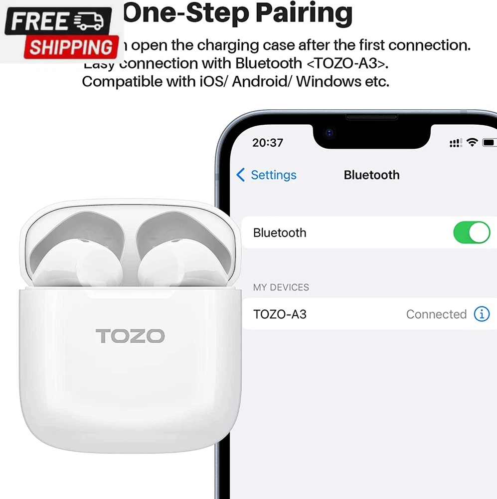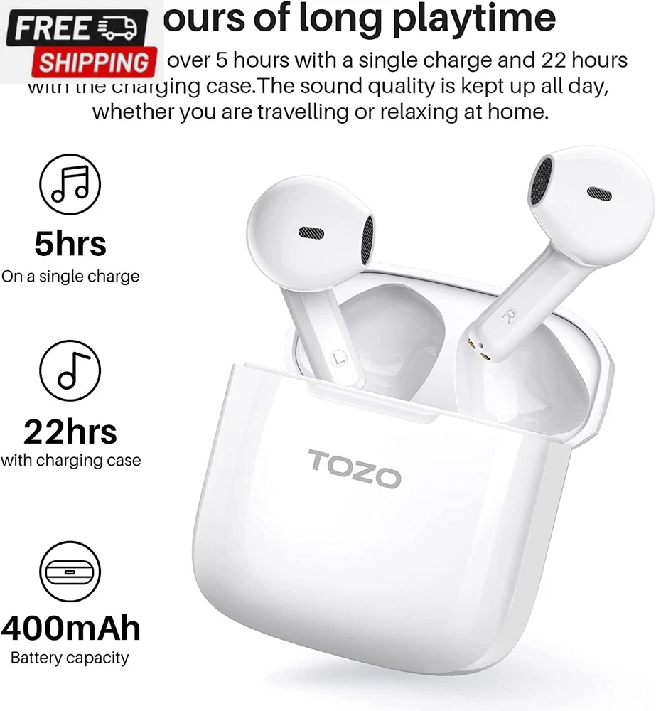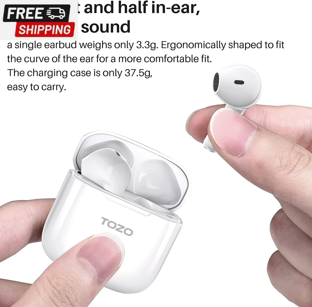 Fast Shipping On All Items 30 Days Money Guarantee Customer Support Excellent Service 100% Satisfaction Satisfaction Guaranteed A3 Upgraded Wireless Earbuds Bluetooth 5.3 Half In-Ear Lightweight Headsets with Digital Call Noise Reduction, Reset Button Hall Detection, Premium Sound with Long Endurance Specification Age Range Description Adult Frequency Range 20 Hz - 20,000 Hz Number of Items 1 Control Method Touch Style Minimalist" or "Modern Is Electric Yes Compatible Devices Tablets, Telephones, Laptops, Smart Speaker, Desktops Theme Music Noise Control Sound Isolation Headphones Ear Placement In Ear Earpiece Shape Semi-in-ear Bluetooth Range 1E+1 Meters Controller Type Touch Control Type Touch Control Is Autographed No Model Number A3 Headphone Folding Features In Ear Headphone Jack Bluetooth Carrying Case Color White Model Name A3 Ear Placement In Ear Carrying Case Battery Average Life 22 Hours Additional Features Microphone Included Form Factor In Ear Specific Uses For Product Music, Sport, Gaming Antenna Location Calling Water Resistance Level Waterproof Wireless Technology Bluetooth Carrying Case Material Acrylonitrile Butadiene Styrene (ABS) Total USB 20 Ports 1 Item Weight 0.01 Pounds Connectivity Technology Wireless Audio Driver Type Dynamic Driver Cable Features Charge Enclosure Material Acrylonitrile Butadiene Styrene (ABS) Battery Average Life 5 Hour Color White Frequency Response 20 KHz Battery Charge Time 1.5 Hours Global Trade Identification Number 06971681315148 Built-In Media USB-C Charging Cable, Charging Case, A3 Wireless Earbuds, Quick Guide & User Manual Bluetooth Version 5.3 Style Name Minimalist" or "Modern Size S 1.02 inches x 1.65 inches x 1.18 inches. Weight: 0.01 lb Item Description [Charging Case With Reset Button] The charging case of TOZO A3 is equipped with a reset button. When you want to clear the existing paired device data of the headset, you only need to put the headset into the charging compartment and press and hold the reset button on the charging box for about 10 seconds to clear the paired device data of the headset; There is no need to clear the data from the paired device , you can re-pair the headset to the device you want. [Digital Call Noise Reduction] Equipped with the call noise reduction function that high-end headphones have, intelligently personalize noise reduction and sound performance for your ears, allowing you to enjoy deep, immersive sound, enabling you to communicate better when using headphones to communicate, avoiding loud sound brings bad call effect. [Long Lasting Battery ] TOZO A3 earbuds lasts 5 hours for normal use (50% volume) on a single charge,quick charging technology enables 1.5 hours of listening from just 10 minutes of charge via USB A to USB C charging cable, headphones + charging case can last up to 22 hours.the powerful battery allow for all day listening. which gives you excellent experience of long endurance. [Advanced Bluetooth 5.3 Technology & One-Step Pairing] TOZO wireless earbuds provide faster and more stable bluetooth 5.3 connection,this newest generation of bluetooth technology offers a strong, continuous connection as long as you’re within 30 feet of the paired device.and with one-step quick pairing, wireless earbuds will connect to the last paired device automatically with case opening. [Ergonomic Design And Lightweight] TOZO headphones' structure is the study of thousands of people's ear canal before design, which fit for most people's ear.These wireless bluetooth headphones are small and light, single earbud is only 3.3g, it’s more convenient to carry. Product Description Ergonomic Half-in-Ear Design Outstanding semi-in ear design, less pressure on your ear canal for optimum snug fit and comfort. Crystal-Clear Calls High-sensitivity microphones and DSP noise cancellation technology, keep your voice always heard loud and clear on a call. ORIGX Acoustic Featured with OrigX and 14.2mm speaker, enhanced bass profile as lowest as 20Hz responds and sound optimisation, delivering sense of reallity , while enjoying free pressure of half in-ear earbuds. Ergonomic design for a non-sensory comfort The half in-ear design has good clearance and offers a great reduction in ear pressure, comfortably free of negative pressure. Long Battery Life Play for over 5 hours on a single charge and 22 hours with the charging case. Enjoy fast charging, and it only takes 90 minutes to fully charge the case via the cable. Ultra lightweight design A single earbud weighs only 3.3 g and wearing it in your ear as if it were nothing. The Advanced Bluetooth 5.3 Technology Support HSP, HFP, A2DP, AVRCP. Provides in-call stereo sound. Greatly improve the transmission speed and providing you with a low-latency listening experience. One Step Pairing Pick up 2 headsets from the charging case and they will connect each other automatically. Then only one step easily enter mobile phone's Bluetooth setting and choose "TOZO-A3" to pair the earbuds. About us We offer the best prices around on high quality products. Our E-store includes media such as books, movies, music and games while offering electronics, toys, sporting apparel, clothing, tools, general home, garden items and more. Shipping We are always working hard to ensure your package arrives as soon as possible. Please understand that some factors like weather, high postal traffic, and the performance of shipping companies are outside of our control. We offer free shipping to the lower 48 states and ship within 2-3 business days of payment, usually sooner. We do not accept P.O. Boxes. Please provide a physical address. For shipping outside of the continental USA, we only use eBay's Global Shipping Program.The item is shipped to KY and then sent to the rest of the world. International customers are responsible for all duties and taxes. Continue to check out to calculate costs for shipping the item to your country. Messages regarding eBay's Global Shipping Program MUST be directed at e