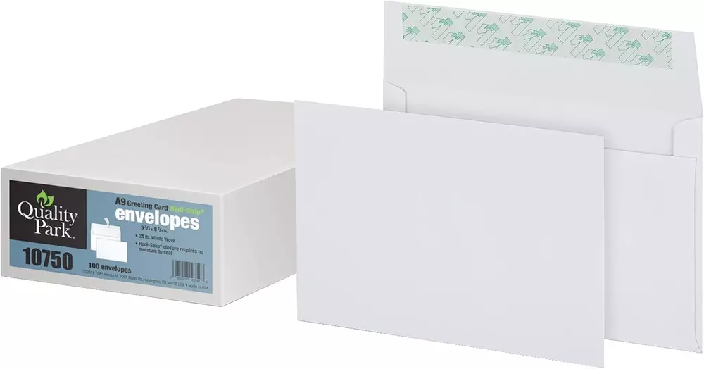 A9 sized 5-3/4 x 8-3/4 Blank Greeting Card Envelopes; Invitation envelopes fit half-fold cards, invites or photos Redi-Strip closure that does not require moisture; just peel and press for a safe, dry, sanitary seal Use for invitations and replies; A9 envelopes can stand on their own or tuck neatly inside larger envelopes for reply cards Printer friendly envelopes; feed directly into your laser or inkjet printer for fast printing Quick and economical solution for event invitations; 100 count box in white Half-Fold 5 3/4 x 8 3/4 Greeting Card/Invitation Envelope Color: White Redi-Strip closure requires no moisture to seal Greeting/invitation cards are ideal for use with computer-generated cards and invitations. Redi-Strip closure on included matching envelopes requires no moisture to seal. Peel-away strip keeps adhesive free from dust.