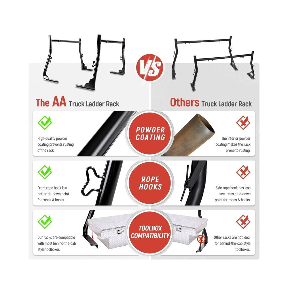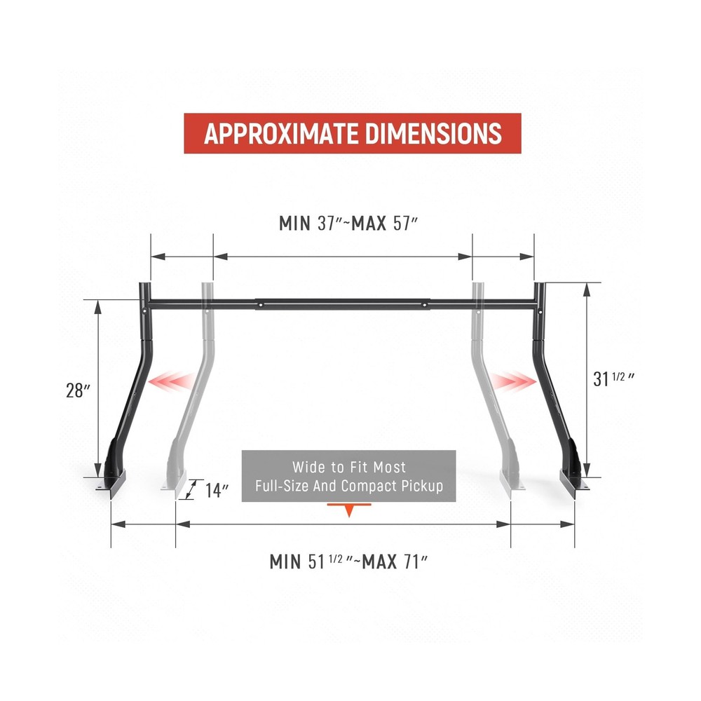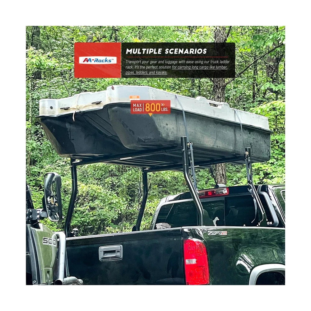 AA-Racks Model X31 800Ibs Capacity Extendable Steel Pick-Up Truck Ladder Rack Two-bar Set - Black Description Features: The X31 features a tested loading capacity of 800 lbs.It is powder coated in the color of black The rope hook on the side of all four uprights provides the security for tying the tools or loads The top section is built with Two "T" sleeve bars plus Middle Cross Bar. The Double-barred Middle section won't easily dent or bend, making it even stronger than a one-barred design The extendable design also makes it compatible with different Truck-bed Width ranged from Min.51" - Max.71" Product Details: Color: Black Brand: AA-Racks Item dimensions L x W x H: 61 x 14 x 30.5 inches Load Capacity: 800 Pounds Mounting Type: Bolt-on, Clamp-on (optional) Automotive Fit Type: Universal Fit Manufacturer: AA-Racks UPC Color: Black Brand: AA-Racks Item dimensions L x W x H: 61 x 14 x 30.5 inches Load Capacity: 800 Pounds Mounting Type: Bolt-on, Clamp-on (optional) Automotive Fit Type: Universal Fit Manufacturer: AA-Racks UPC: 810029491068 Item Weight: 42.6 pounds Product Dimensions: 61 x 14 x 30.5 inches Item model number: X31-BLK Manufacturer Part Number: X31-BLK Date First Available: November 12, 2019 Delivery We Do Not Ship Outside of the Continental US. Return Policy All items qualify for returns within 30 days of receipt. Buyer is responsible for return shipping on any item that is not damaged. Feedback We take our reputation seriously, we buy and sell online, so we understand the value of trust. If you are unsatisfied with your order, please contact us and we will work with you to resolve it to your satisfaction.
