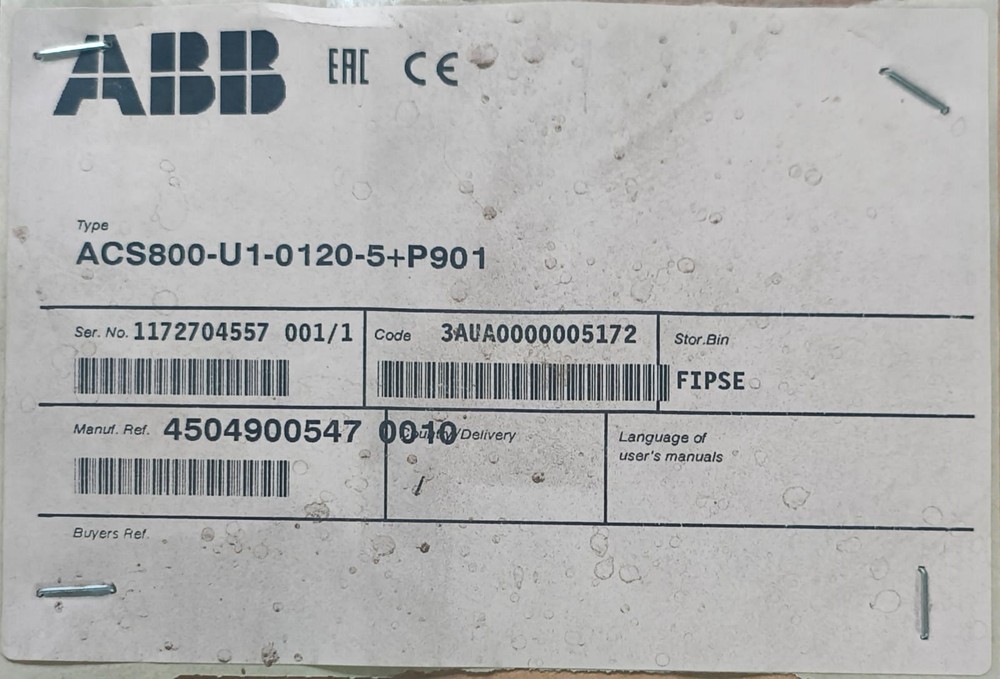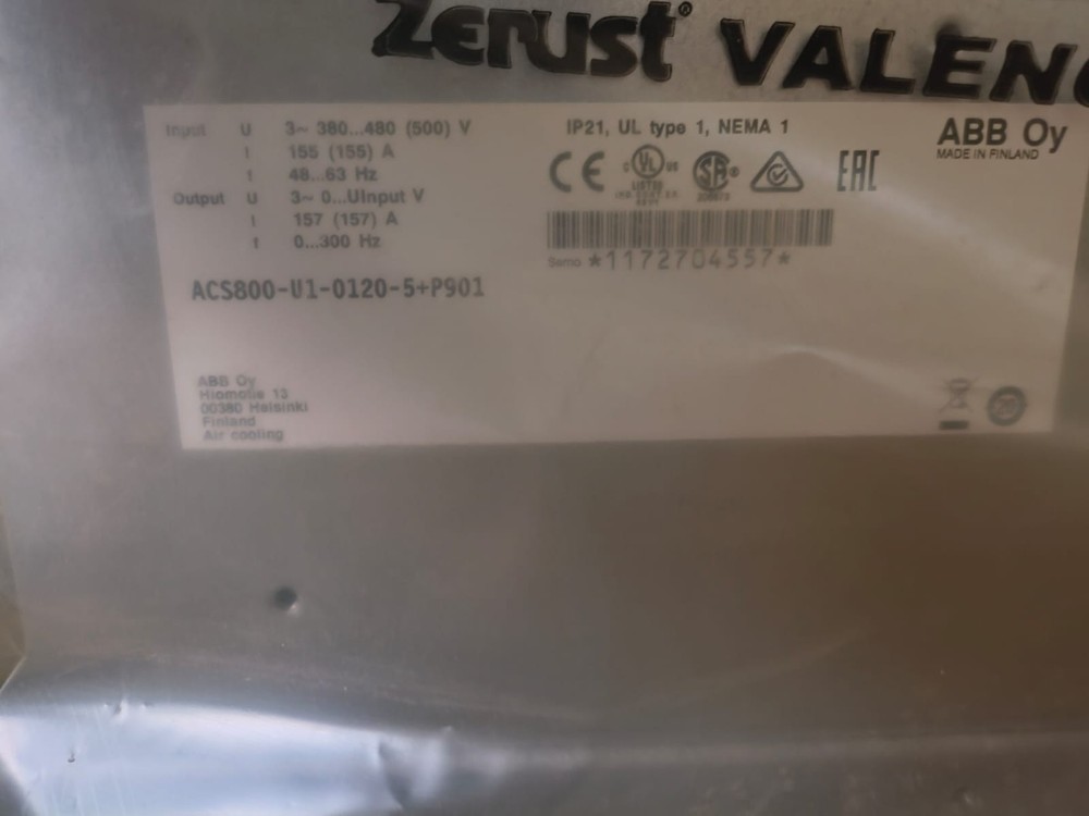 Number Of Phases:3-PhaseBrand:ABBPower Rating:90 KWInput Voltage:380 VRated Load:120 HPModel:ACS800-U1-0120-5Country of Origin:FinlandEnclosure:NEMA 1Seller Notes:“NEW OPEN BOX ITEM,NEVER USED BEFORE,NO BROKEN FROM ANY SIDE...”