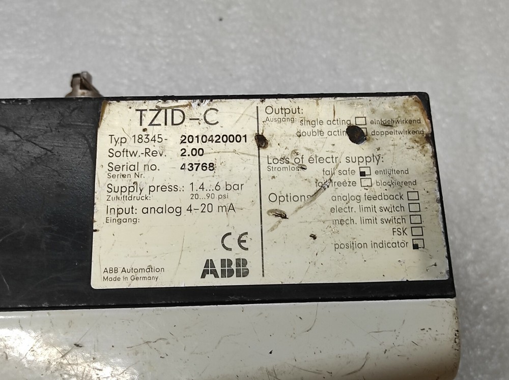 We are pleased to offer ABB TZID-C DIGITAL POSITIONER TYPE 18345-2010420001 Product Detail: ABB TZID-C DIGITAL POSITIONER TYPE 18345-2010420001 MODEL: TZID-C TYPE: 18345-2010420001 DESC: DIGITAL POSITIONER SUPPLY PRESS: 1.4-6 BAR / 20-90PSI INPUT: ANALOG 4-20 mA MADE IN GERMANY Shipment processing time: All orders are processed within 1-2 business days. Orders are not shipped or delivered on weekends or holidays. Shipment confirmation & Order tracking: You will receive a Shipment Confirmation email once your order has shipped containing your tracking number(s). The tracking number will be active within 24 hours. Customs, Duties and Taxes: We are not responsible for any customs and taxes applied to your order. All fees imposed during or after shipping are the responsibility of the customer (tariffs, taxes, etc.). Damages: In case of damage or lost of shipment during transit, We will investigate the matter and provide the satisfactory resolution. Returns Policy: We offer return or exchange of ordered item up to 30 days of receipt of goods in subject to certain condition. In case of damaged goods we shall offer the replacement or refund for the ordered item. If you require any more details, request you to send us the direct message through eBay for early resolution. Thanks
